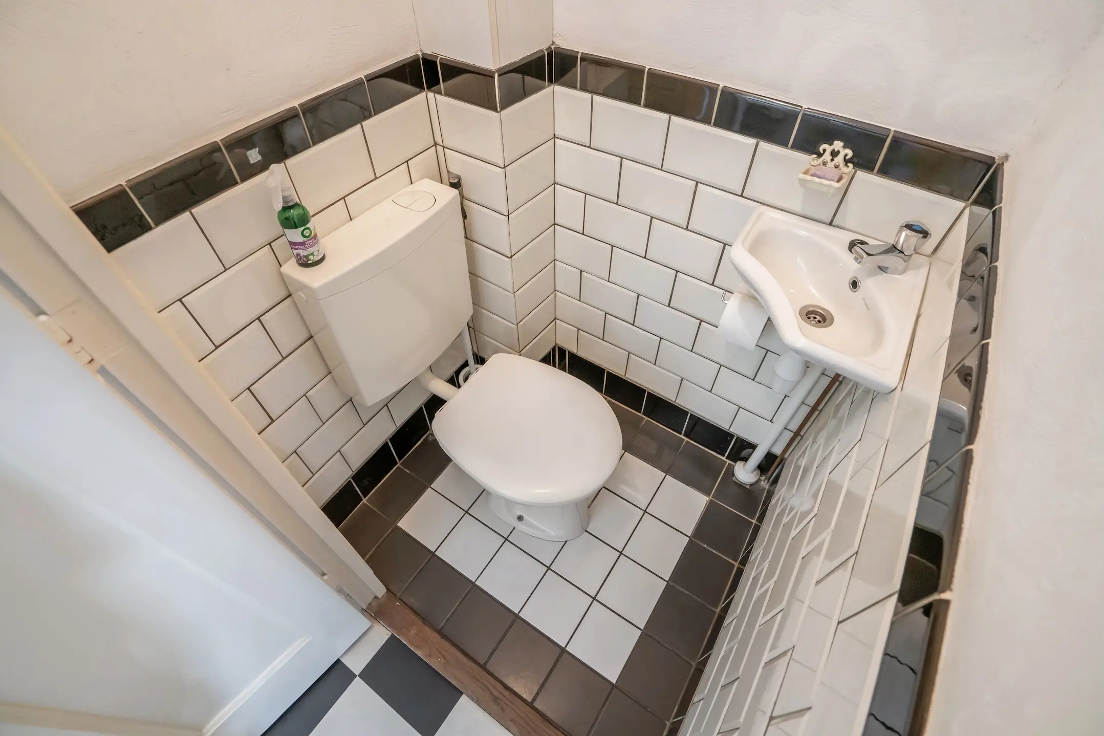 Via de nette voortuin bereikt u de entree van de woning. U komt binnen in het tochtportaal met meterkast, waarna fraaie deuren met glas-in-lood toegang geven tot de hal. Hier bevindt zich een praktische vaste kast onder de trap en een separaat toilet met fontein.