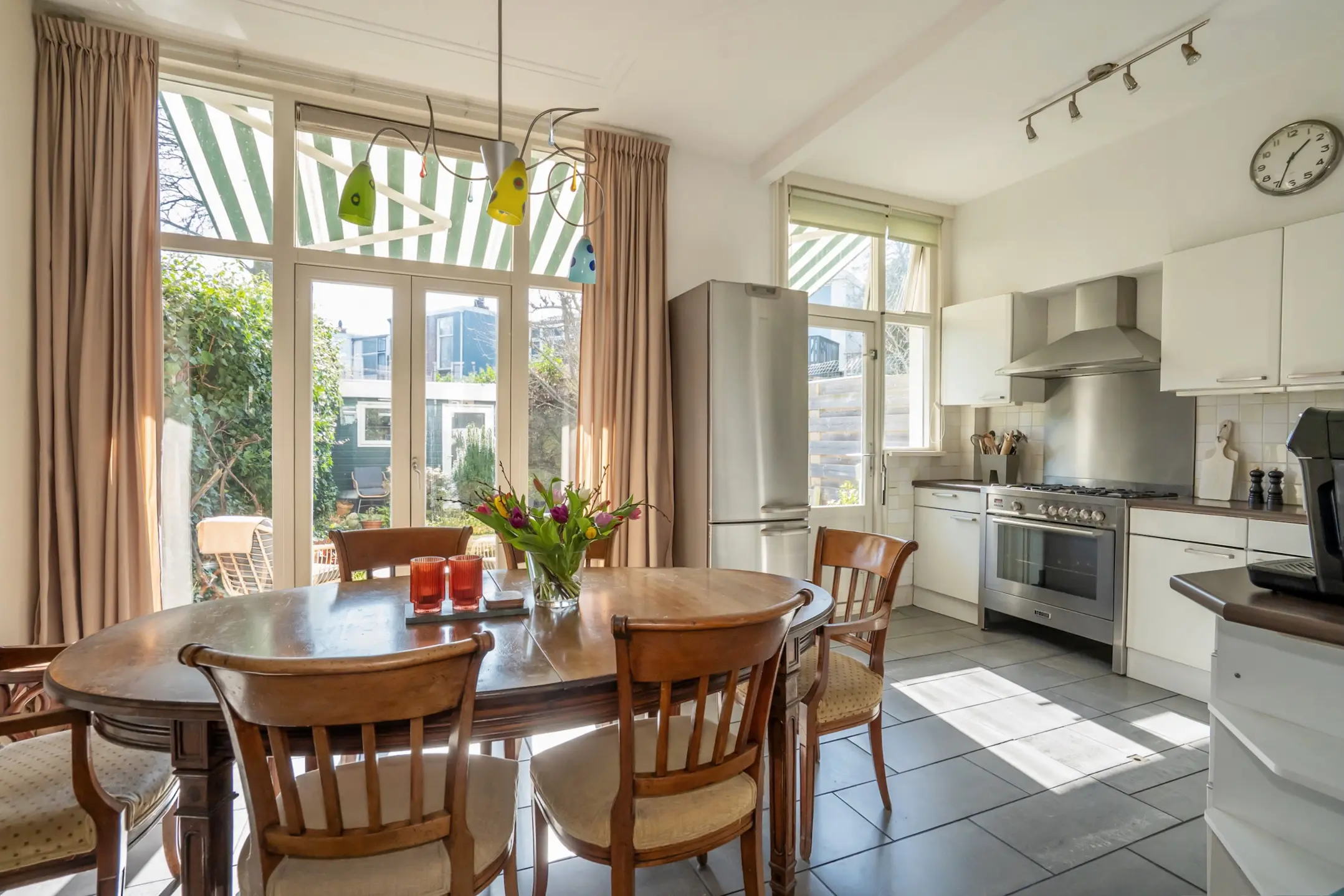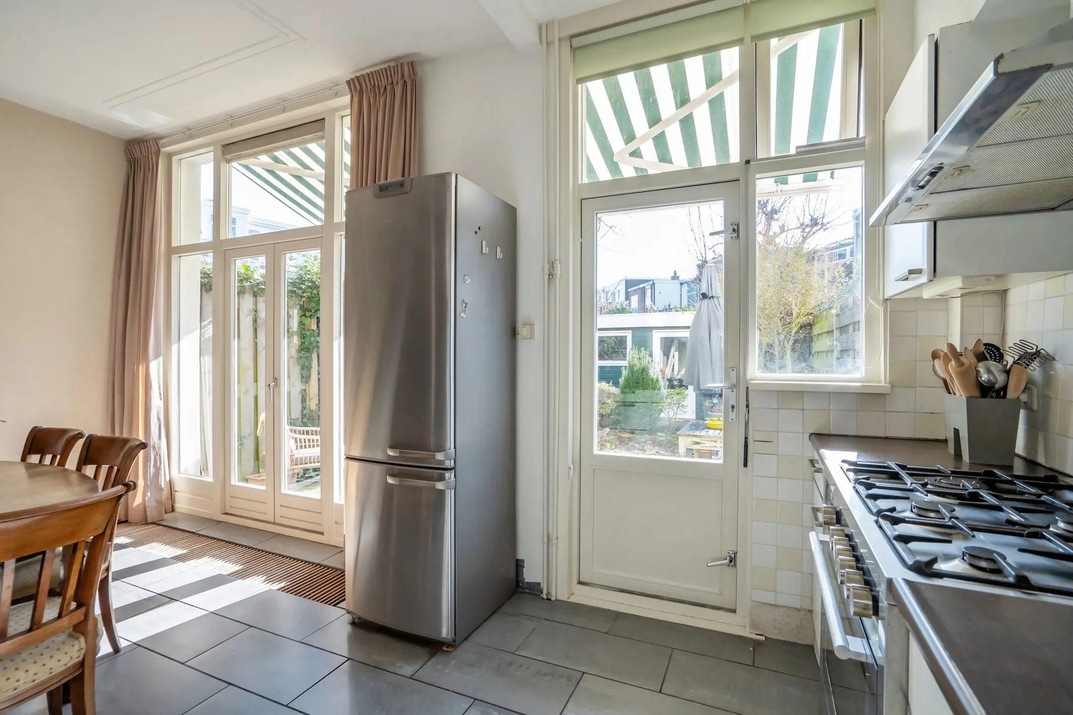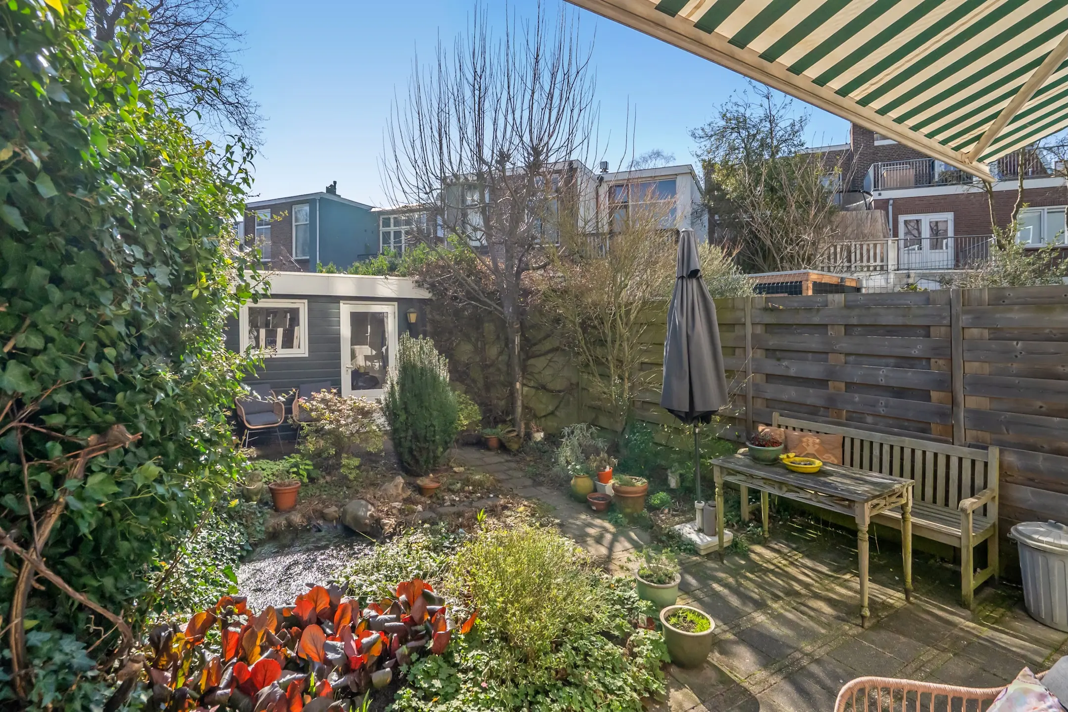 De keuken is compleet uitgevoerd met een vaatwasser, een royaal 6-pits gasfornuis met oven en een warmwaterboiler. Vanuit de keuken geven openslaande deuren toegang tot de heerlijke achtertuin. De tuin is zonnig gelegen op het zuiden en beschikt over elektrische zonwering aan de achtergevel. Achterin de tuin staat een vrijstaande schuur met elektra – ideaal voor fietsen en extra bergruimte.