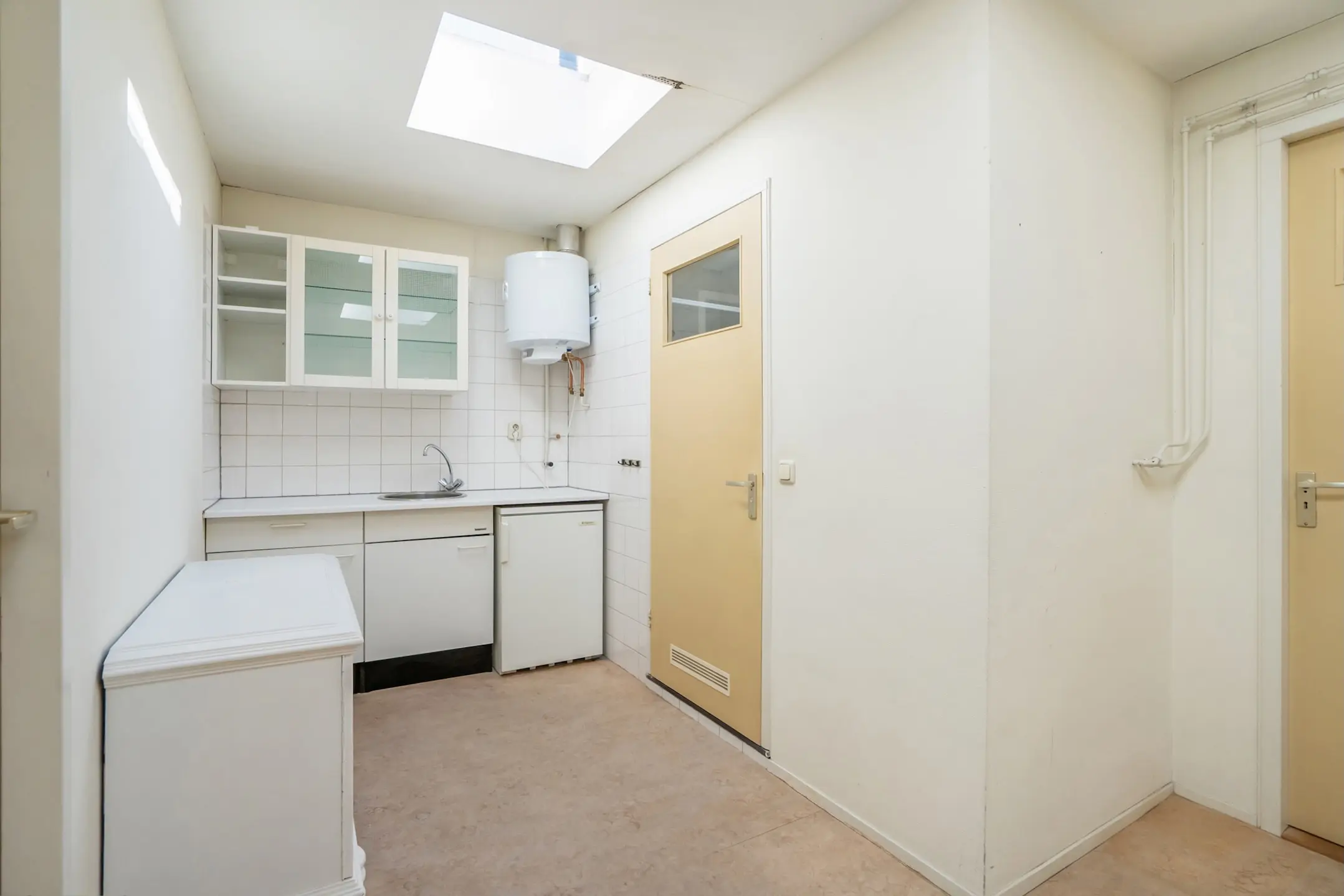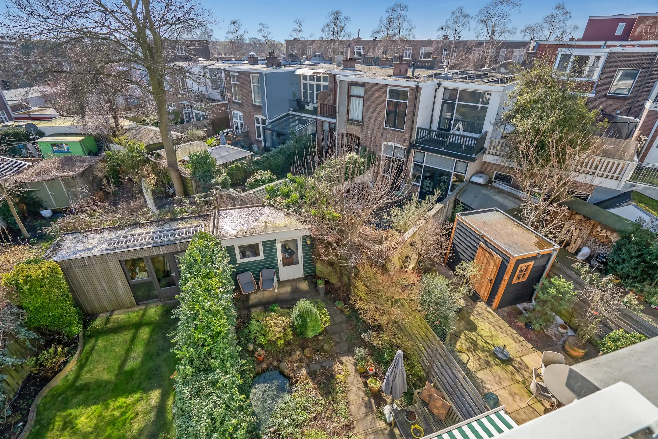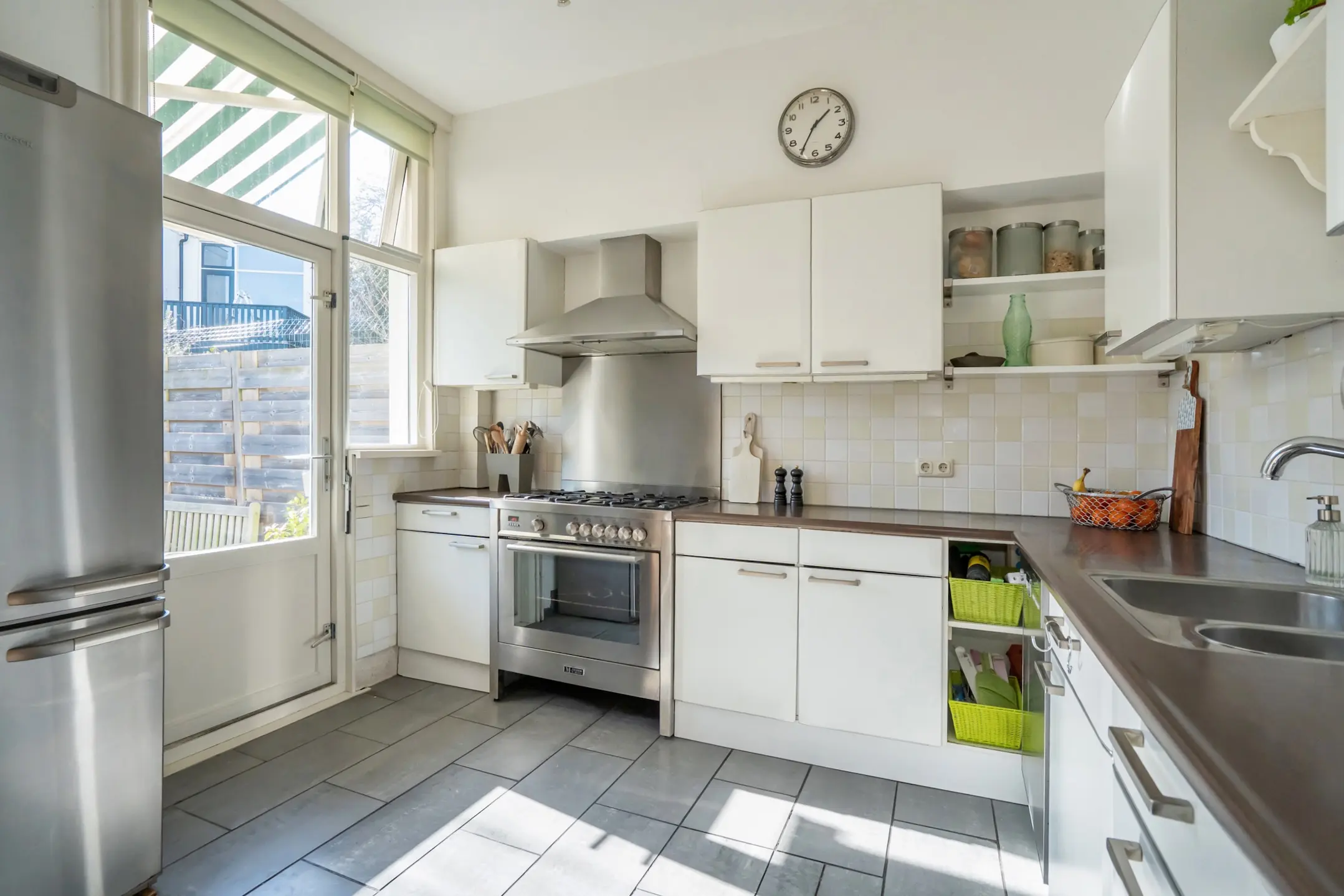 De keuken is compleet uitgevoerd met een vaatwasser, een royaal 6-pits gasfornuis met oven en een warmwaterboiler. Vanuit de keuken geven openslaande deuren toegang tot de heerlijke achtertuin. De tuin is zonnig gelegen op het zuiden en beschikt over elektrische zonwering aan de achtergevel. Achterin de tuin staat een vrijstaande schuur met elektra – ideaal voor fietsen en extra bergruimte.