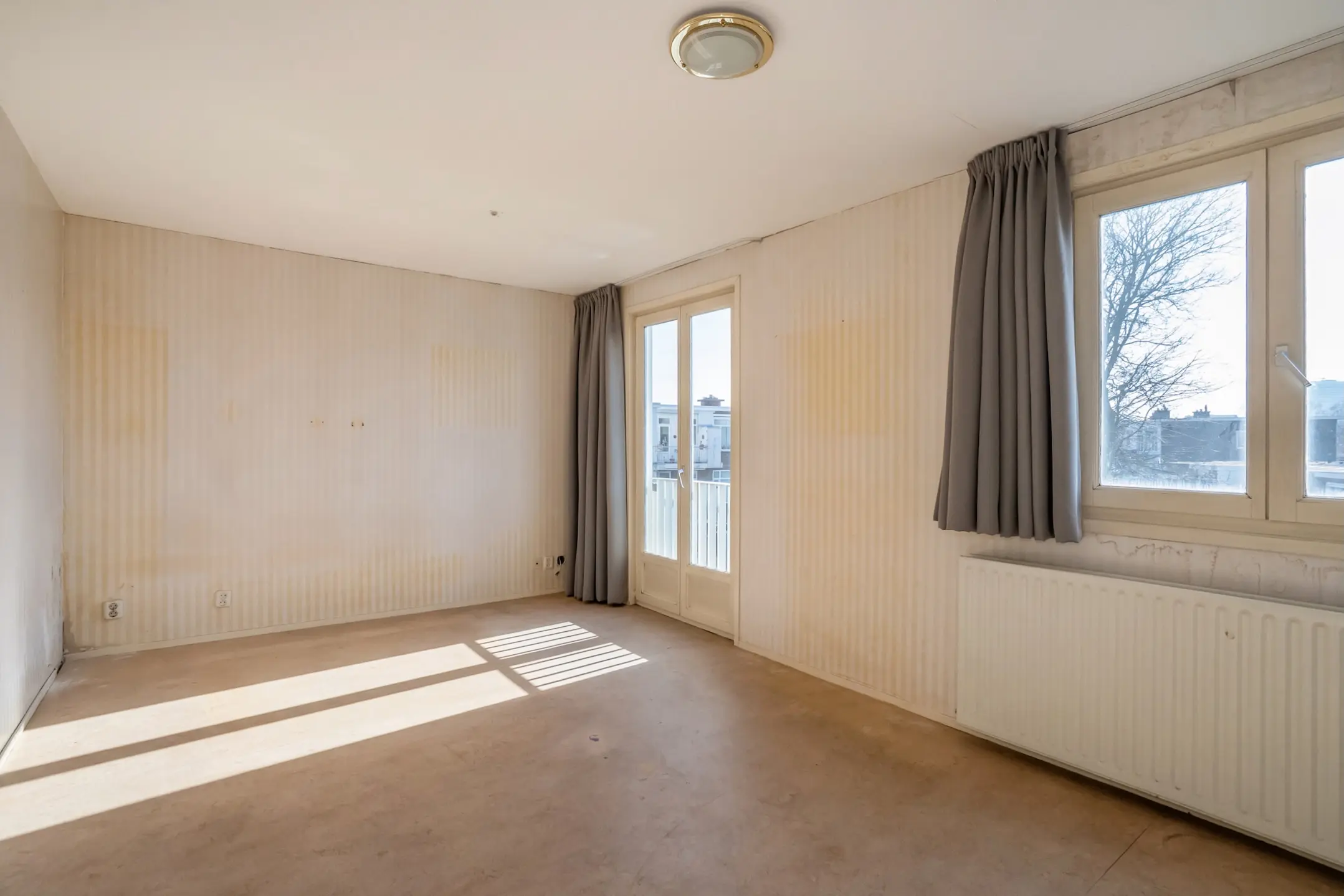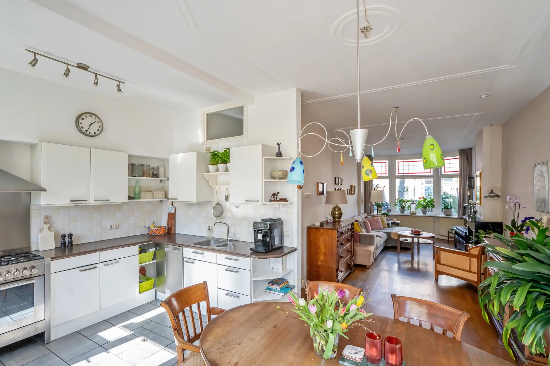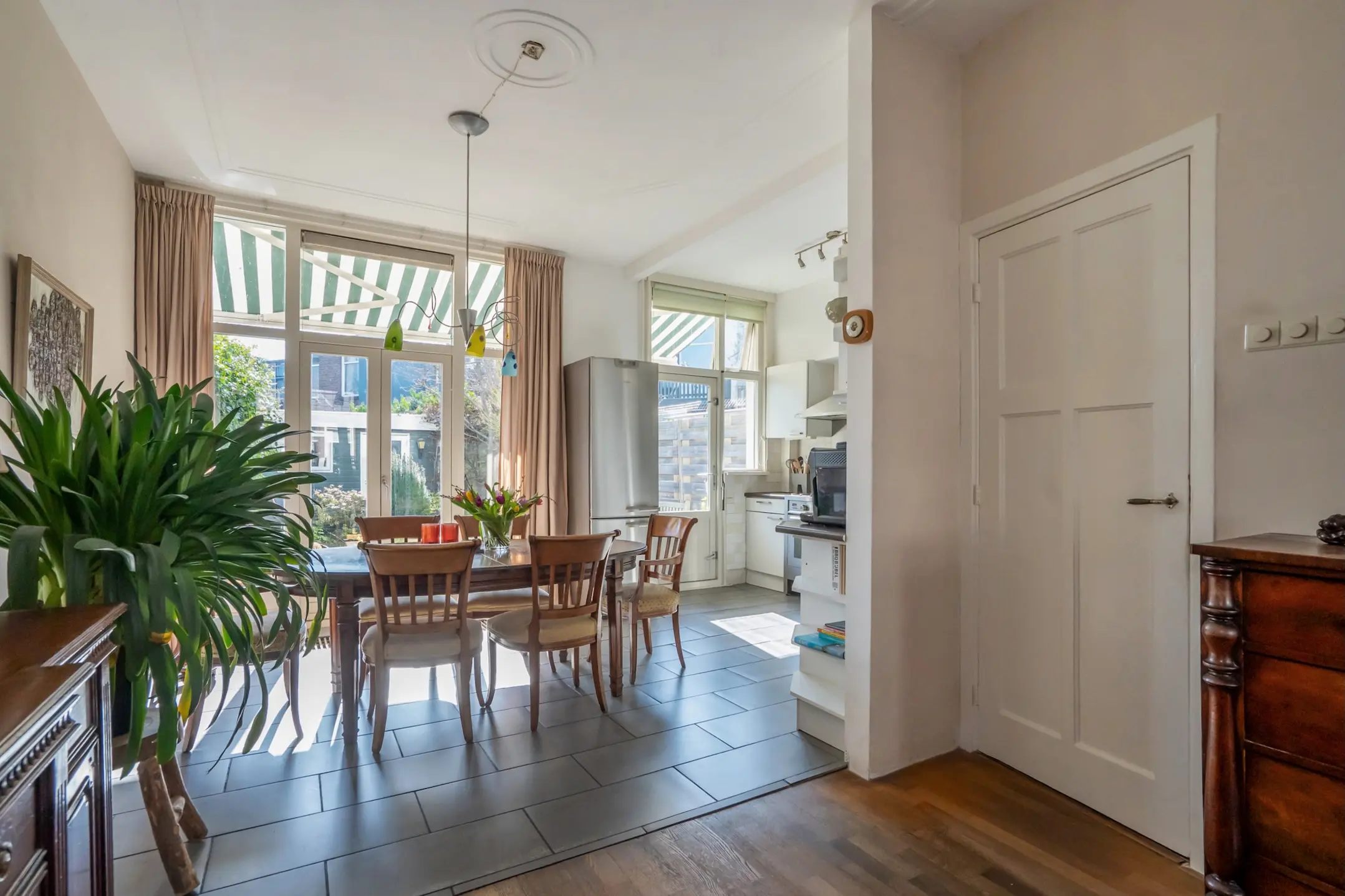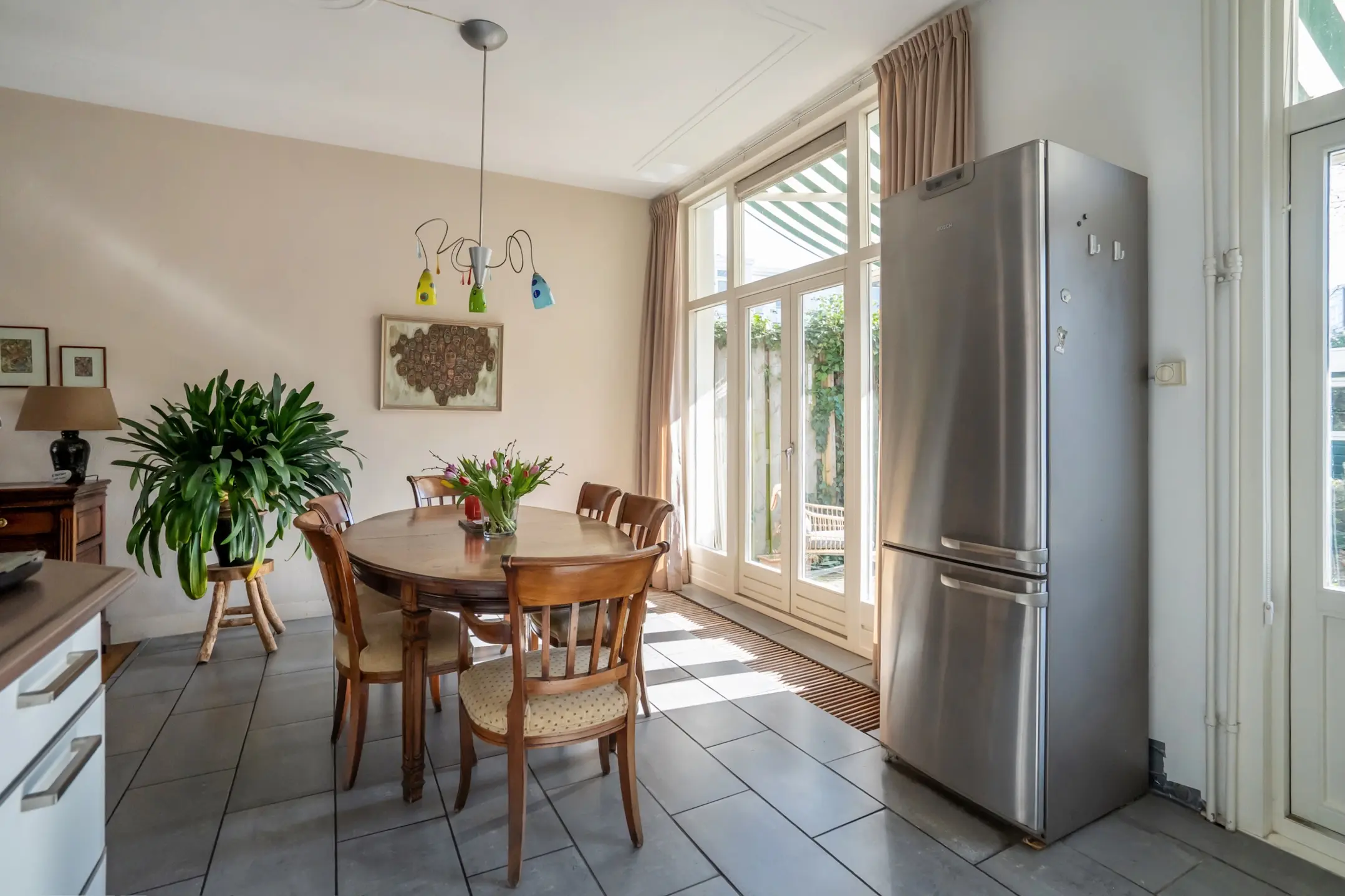 De deur naar de woonkamer opent naar een prachtige, ruime en lichte woon-/eetkamer. De fraaie erker aan de voorzijde biedt vrij uitzicht over de straat en zorgt voor een prettige lichtinval. Aan de achterzijde bevindt zich de eethoek met opengebroken keuken, waardoor een fijne, open leefruimte is ontstaan.