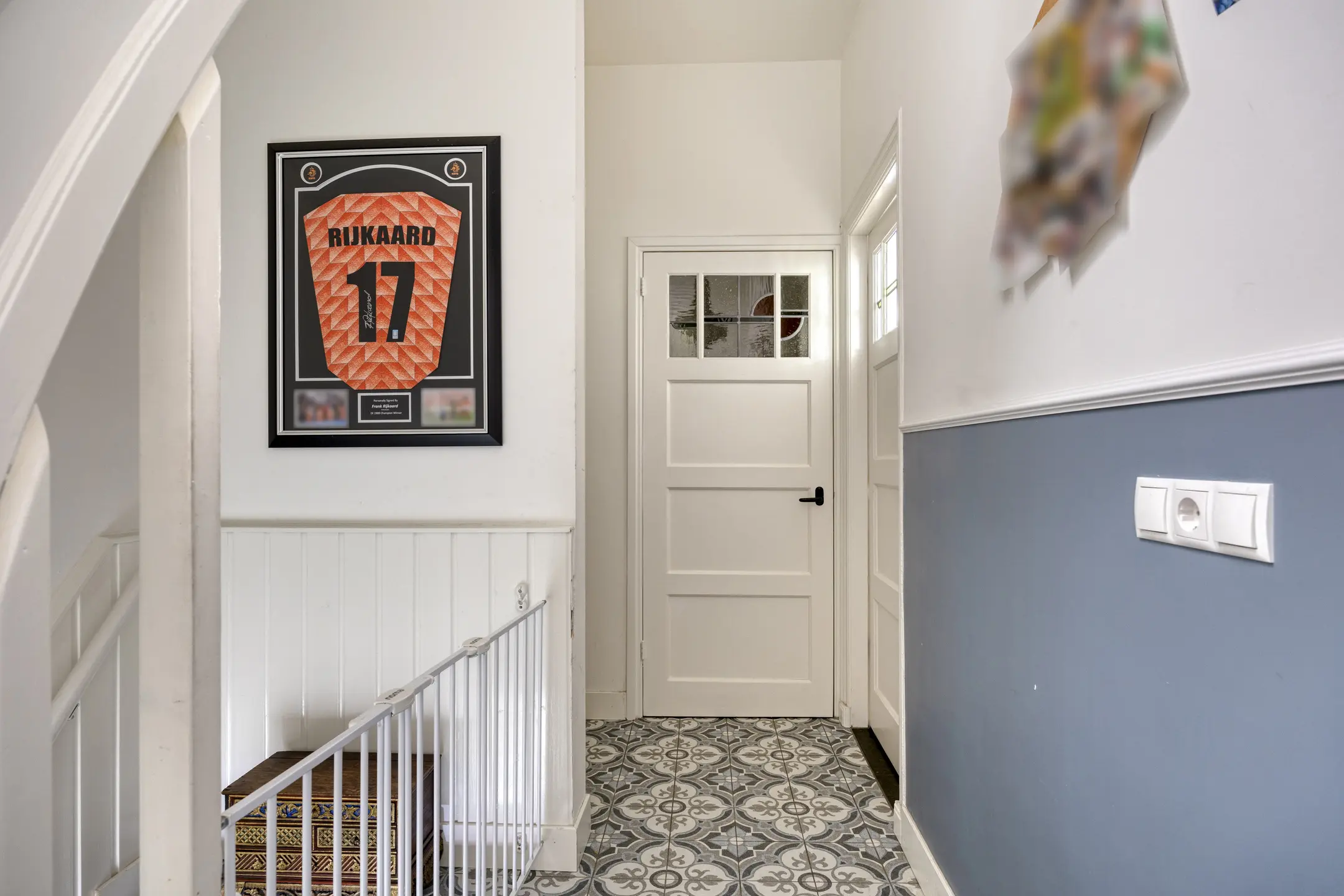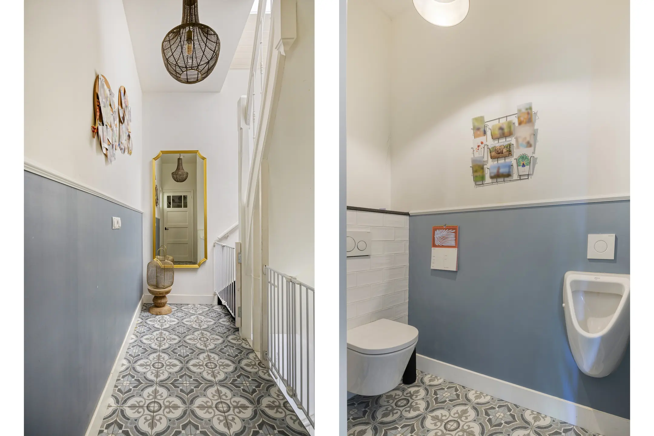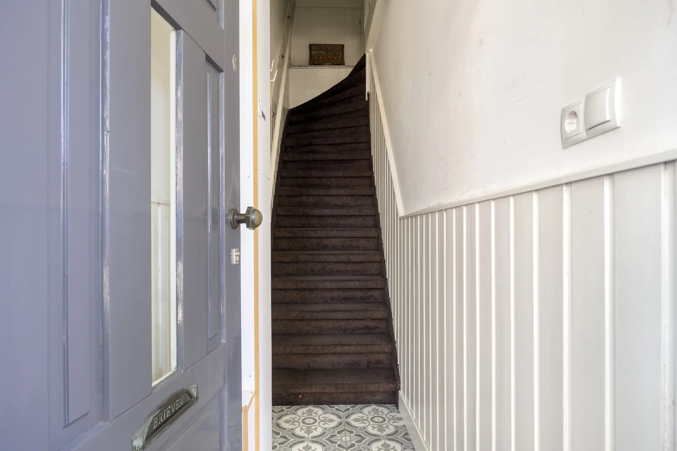 Entree met vernieuwde meterkast (2020). Een trap leidt naar de eerste verdieping. Hier kom je op de hal met een royale garderobe nis en een zeer ruim separaat toilet met fontein én urinoir.