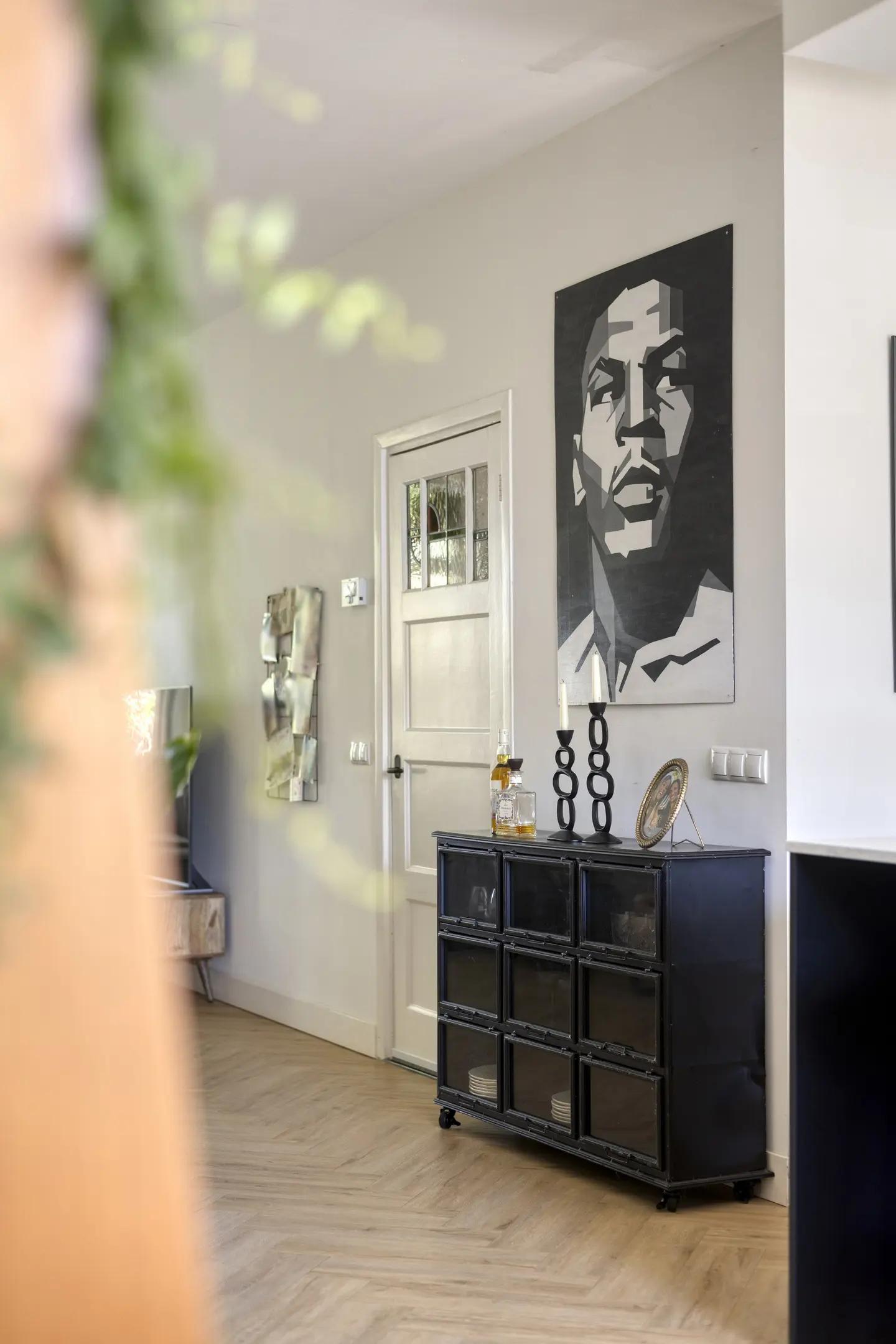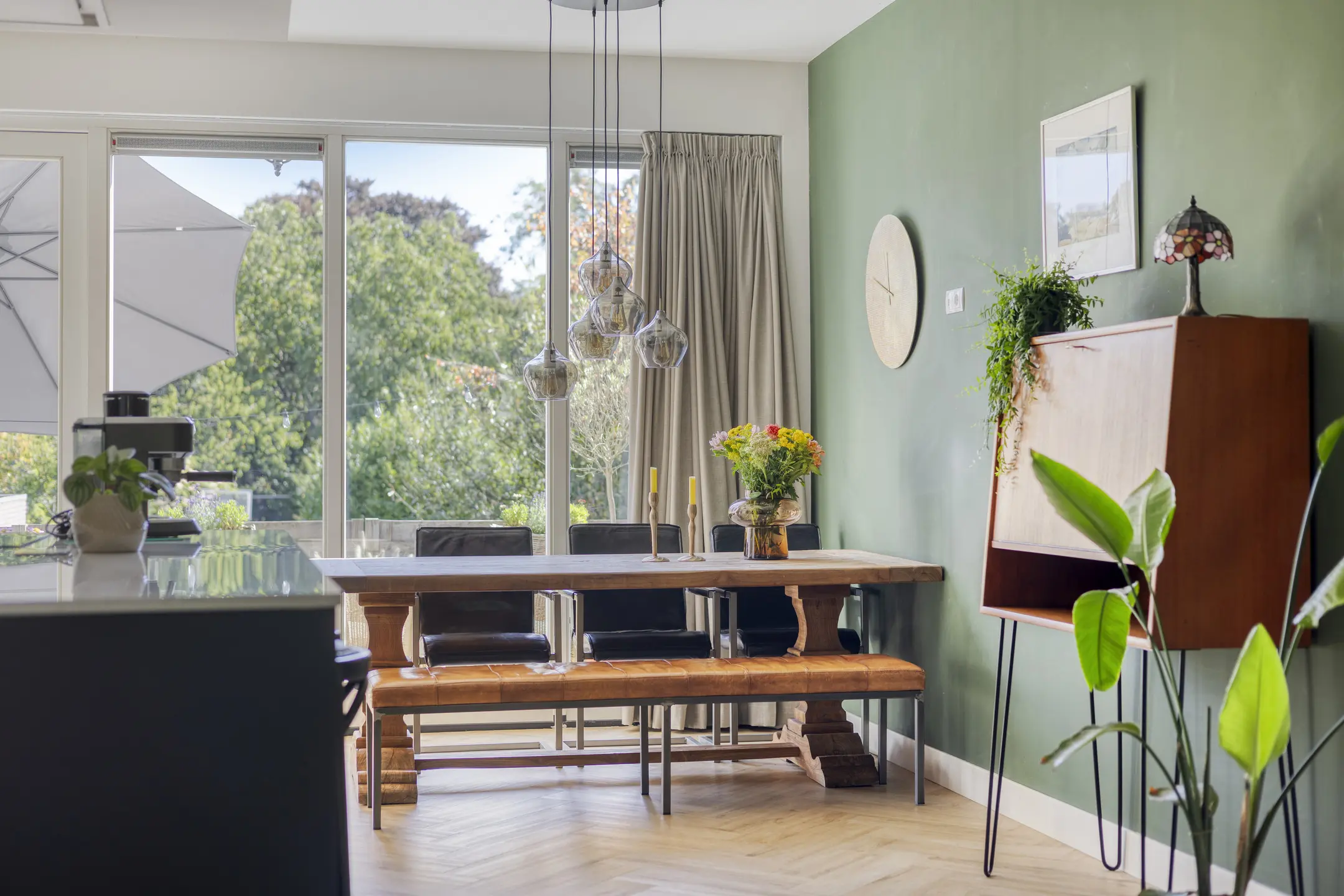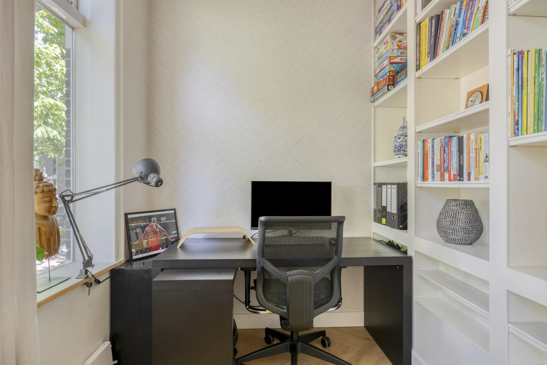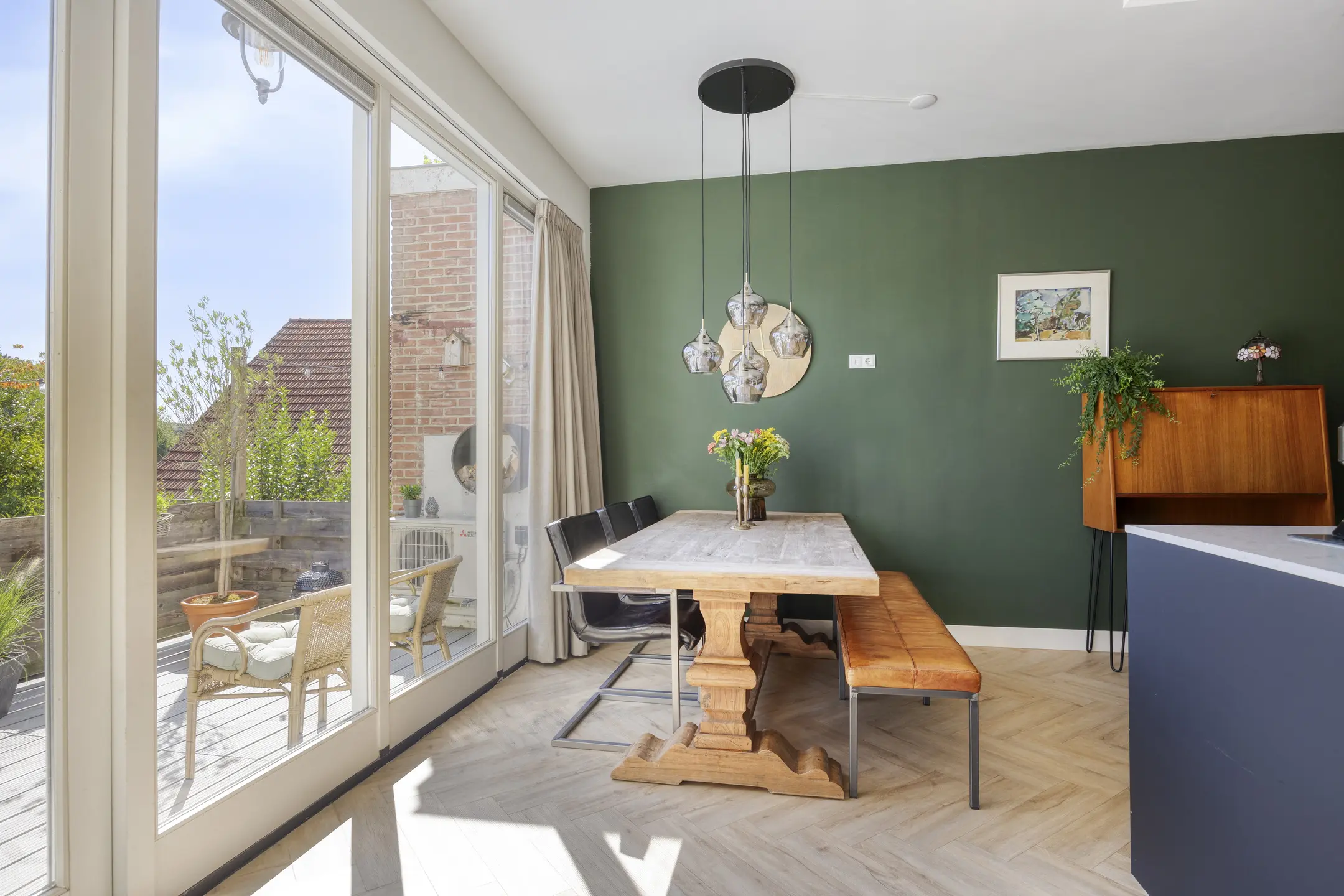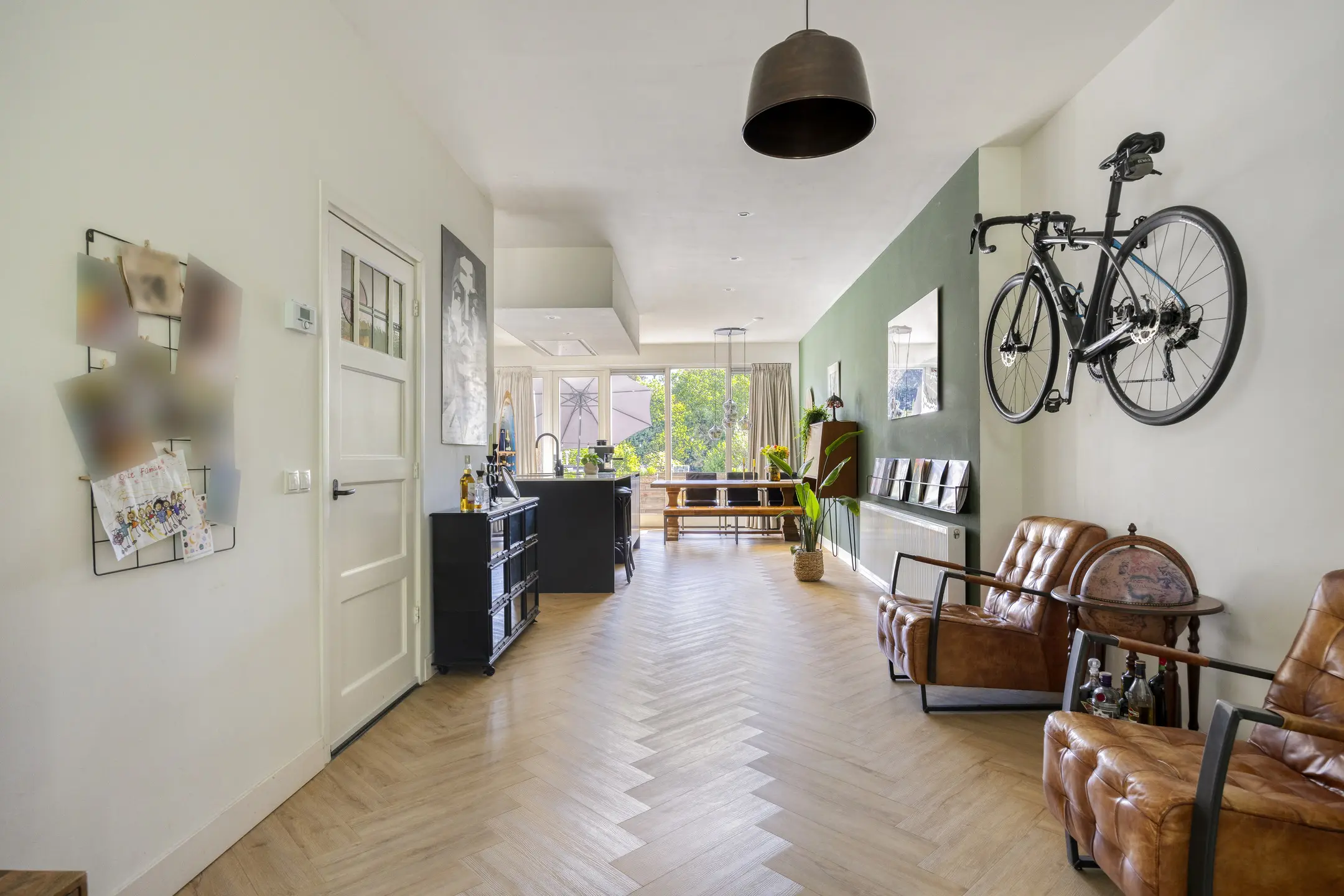 Via de hal betreed je de doorgebroken en uitgebouwde woon-/eetkamer. Aan de voorzijde bevindt zich de lichte woonkamer met grote raampartijen en uitzicht over de straat. De doorgebroken zijkamer biedt zich perfect aan als een rustige werk- of studeerhoek.