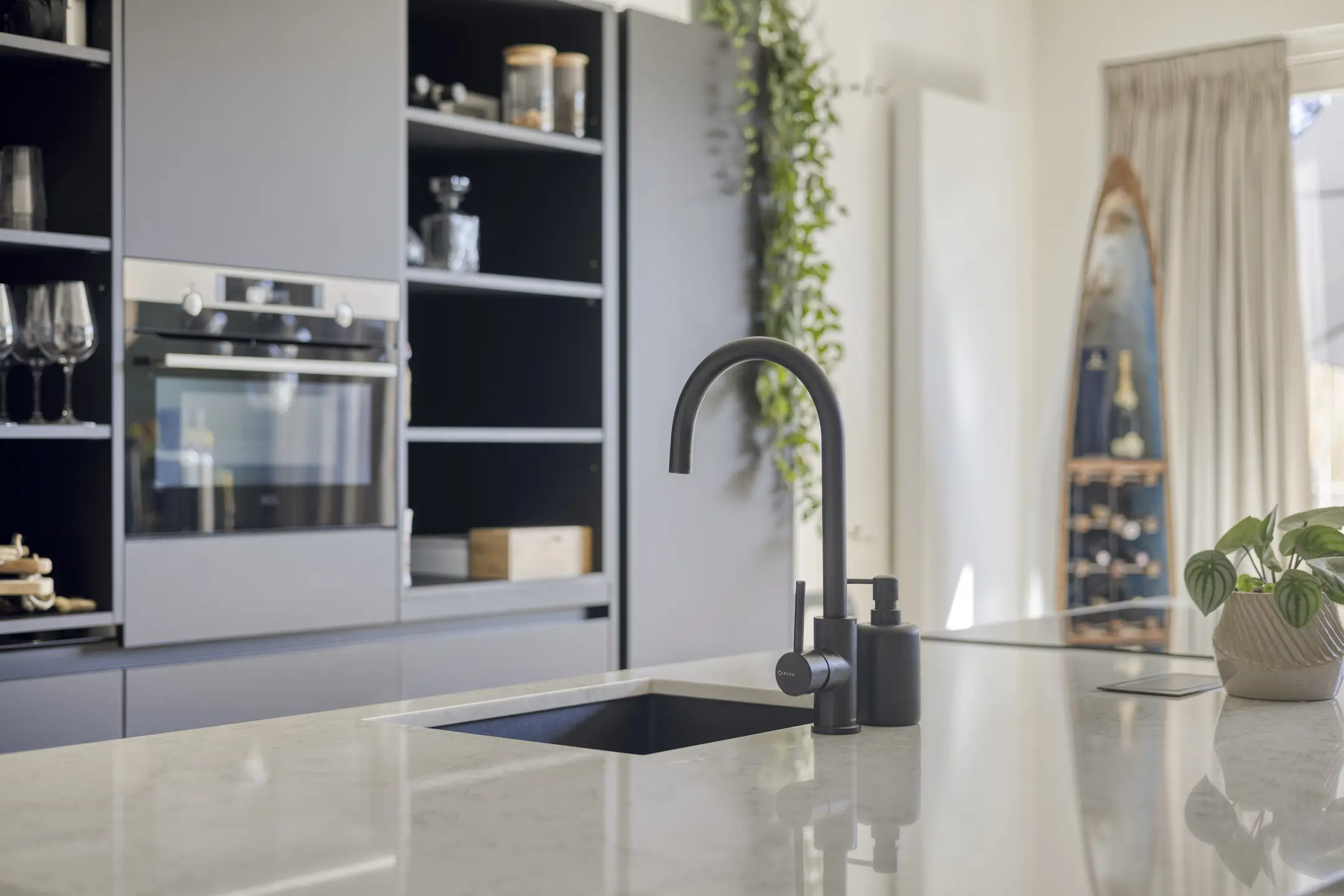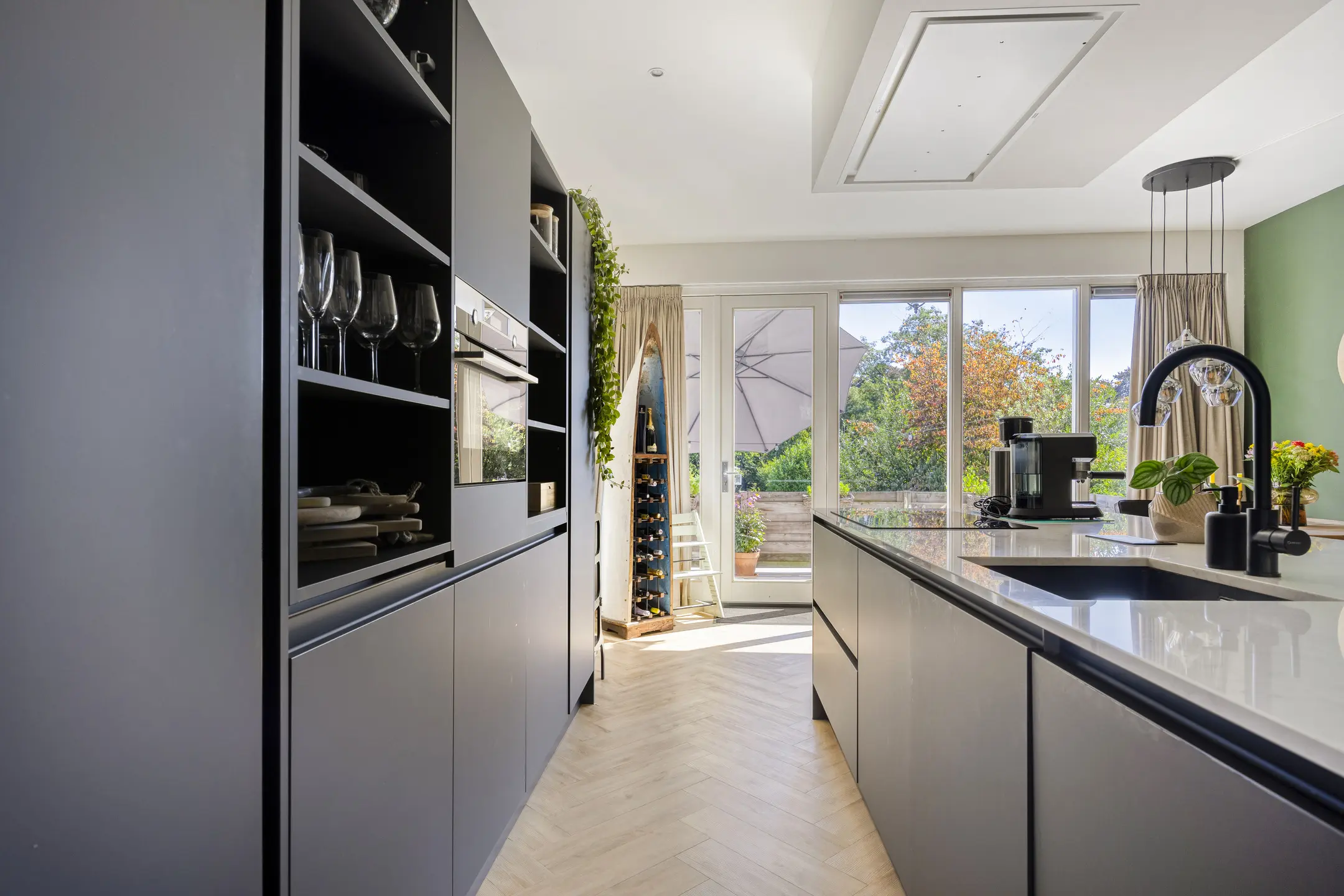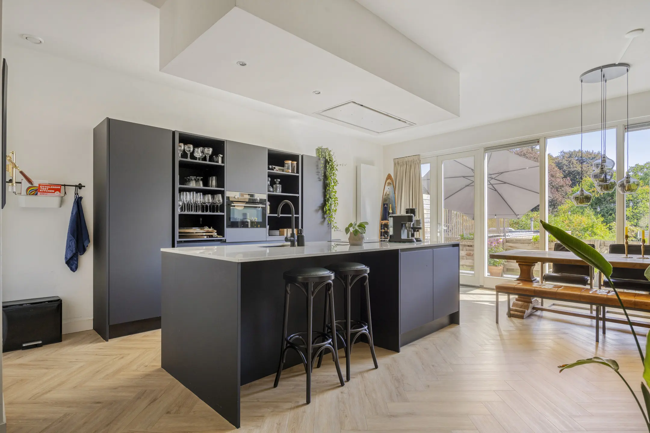 Aan de achterzijde ligt de luxe woonkeuken met kook- en spoeleiland, een breakfast bar en volop bergruimte. De keuken is voorzien van complete AEG-inbouwapparatuur waaronder een inductiekookplaat, vaatwasser, grote koelkast, grote vriezer en een combi-oven. Vanuit de keuken geven openslaande deuren toegang tot een heerlijk ruim terras op het oosten.