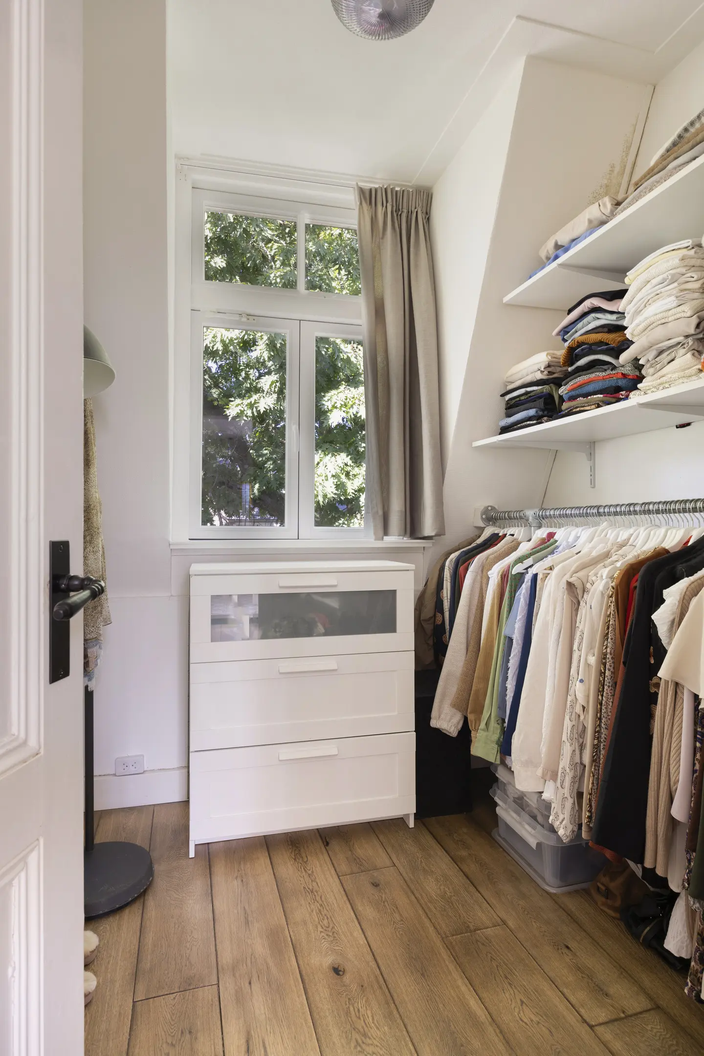 Via stijlvolle paneel schuifdeuren met glas-in-lood bereik je de achtergelegen master bedroom. Deze kamer is zeer licht door de grote ramen, beschikt over airconditioning en een op maat gemaakte walk-in closet achter een scheidingsmuur.