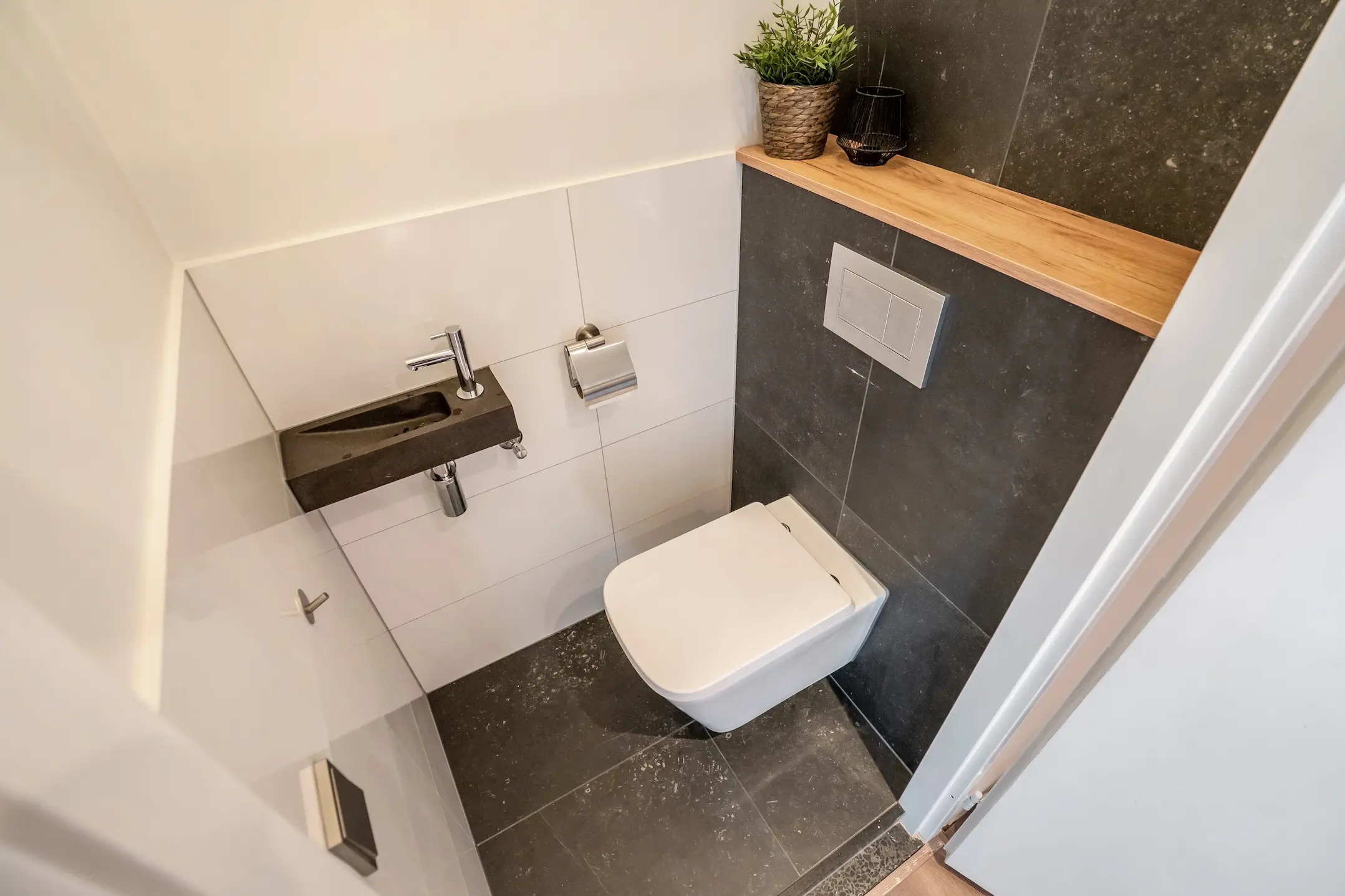 Bij binnenkomst kom je in een open en lichte ontvangsthal met een modern toilet voorzien van fontein.