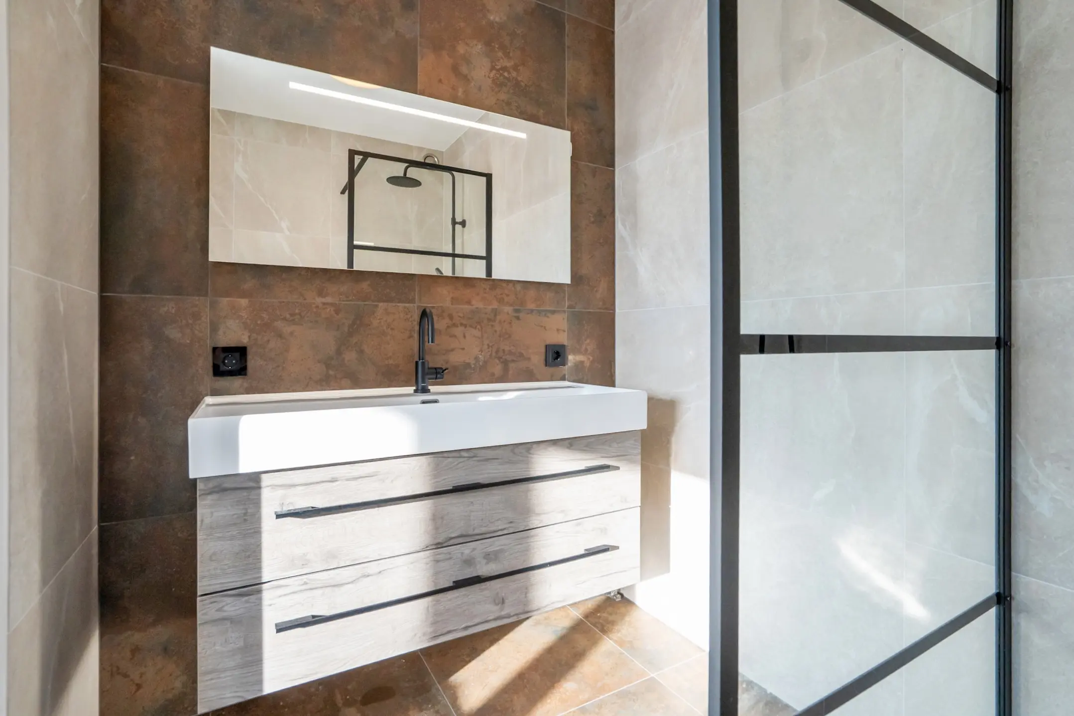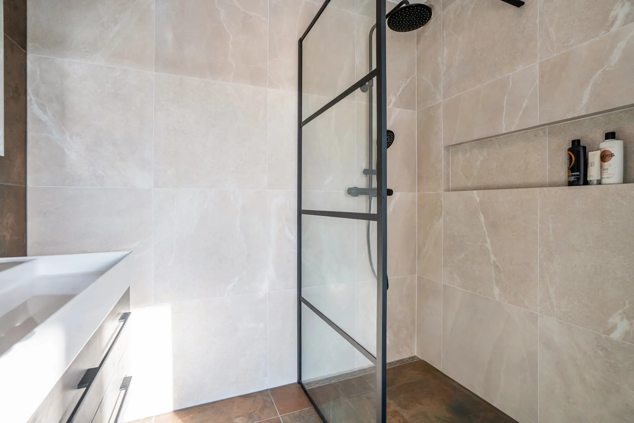 De moderne badkamer is stijlvol afgewerkt met modieuze wand- en vloertegels, een ruime inloopdouche met hand- en stortdouche, handige nisjes voor shampoo en douchegellen en een breed wastafelmeubel.