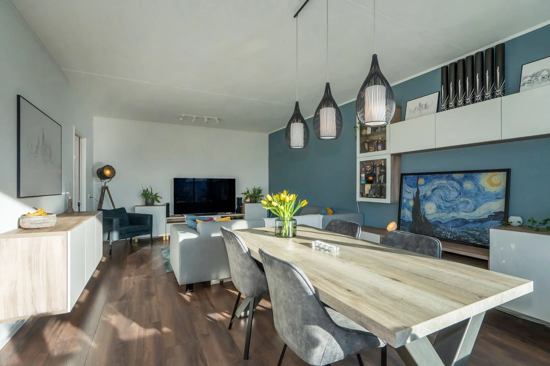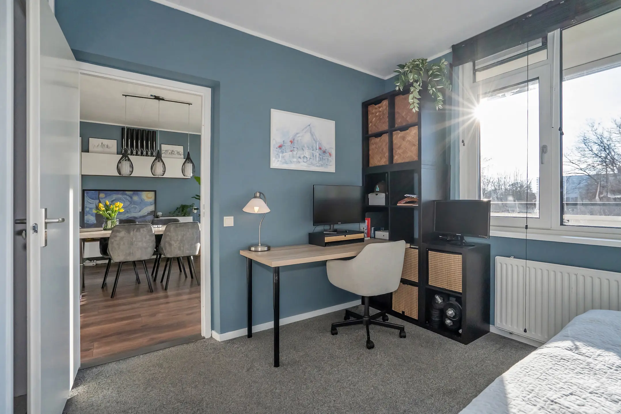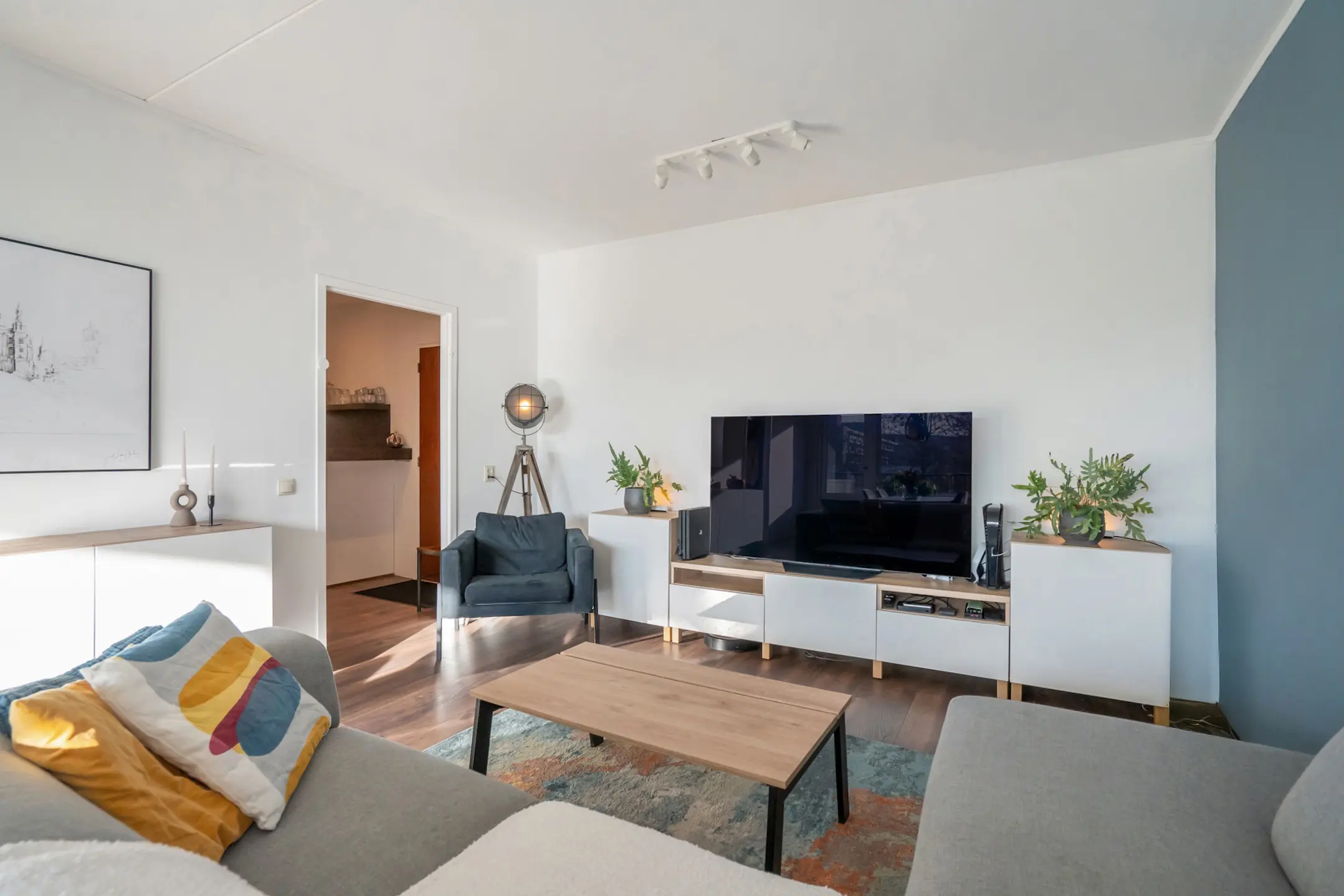 De ruime woon-/eetkamer is volledig afgewerkt met een nette laminaatvloer en strakke wanden met vliesbehang en fraai sauswerk. Via de woonkamer stap je zo het zonnige balkon op het zuidwesten op – perfect om na een lange dag van de zon te genieten.