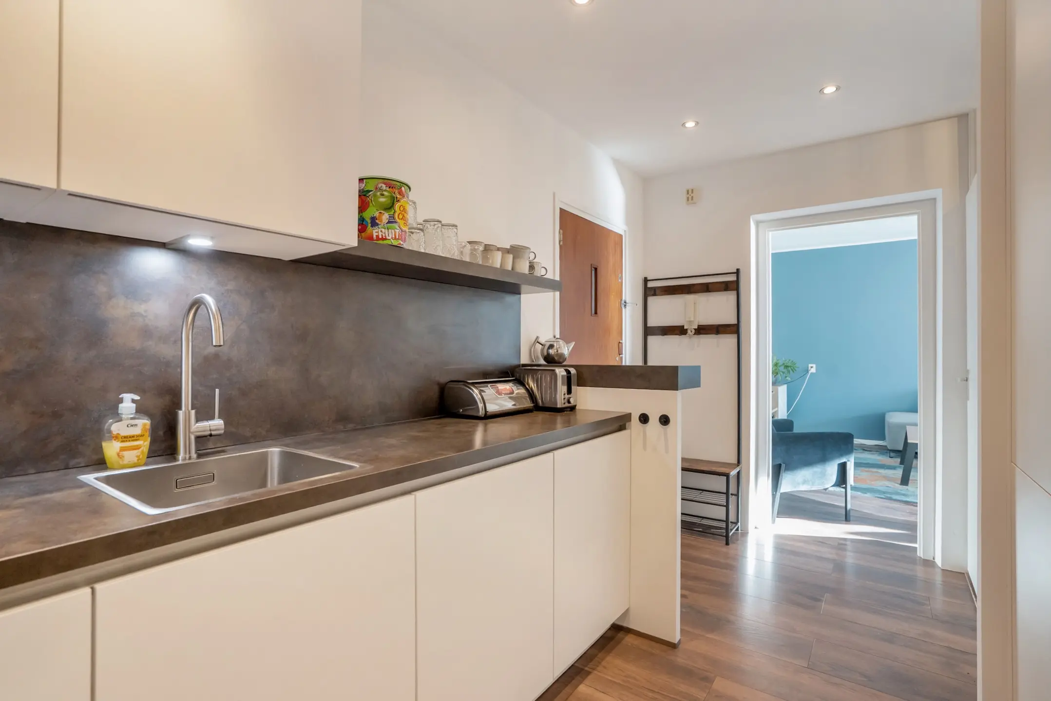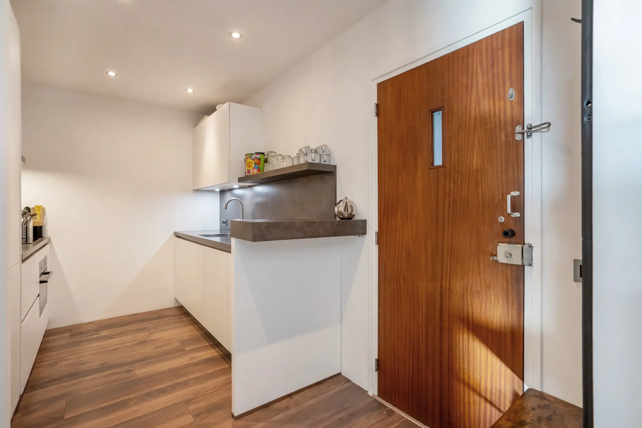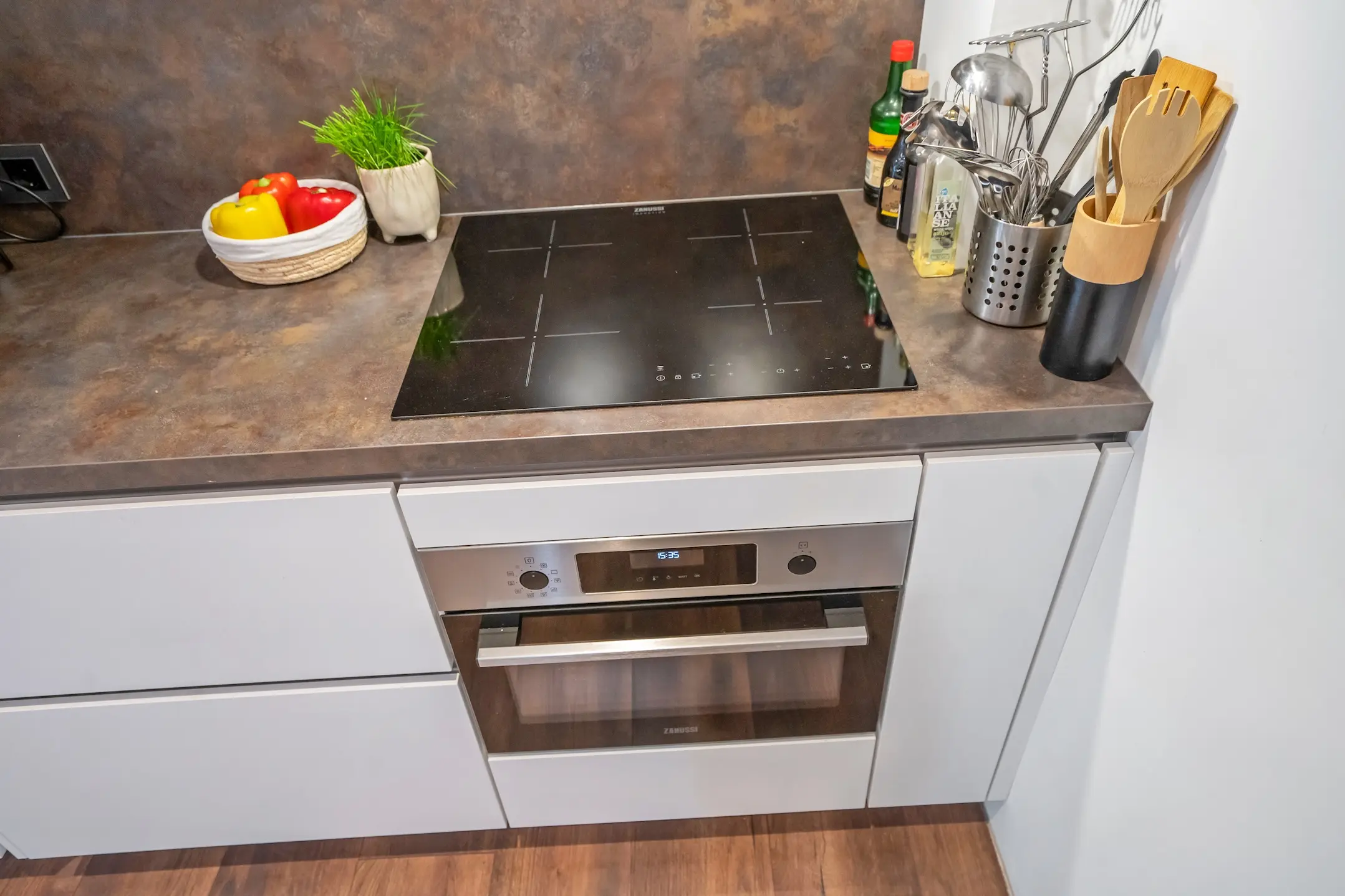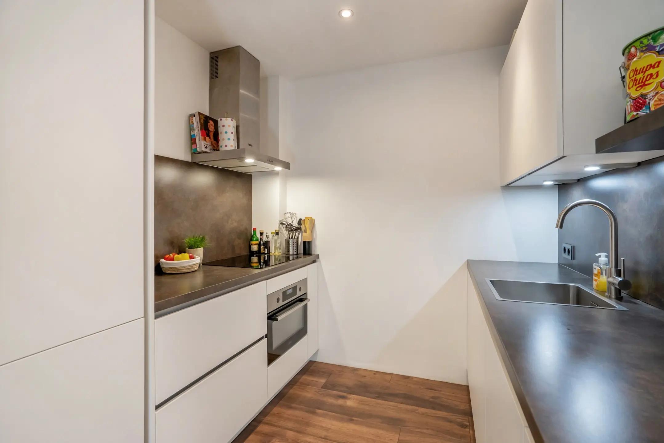De strakke, semi-open keuken is uitgevoerd met een bruin aanrechtblad en lichte kasten en laden en is van alle gemakken voorzien: koelkast, vriezer, 4-pits inductiekookplaat met afzuiging, vaatwasser en spoelbak met mengkraan. Ideaal voor wie van koken én gezelligheid houdt.