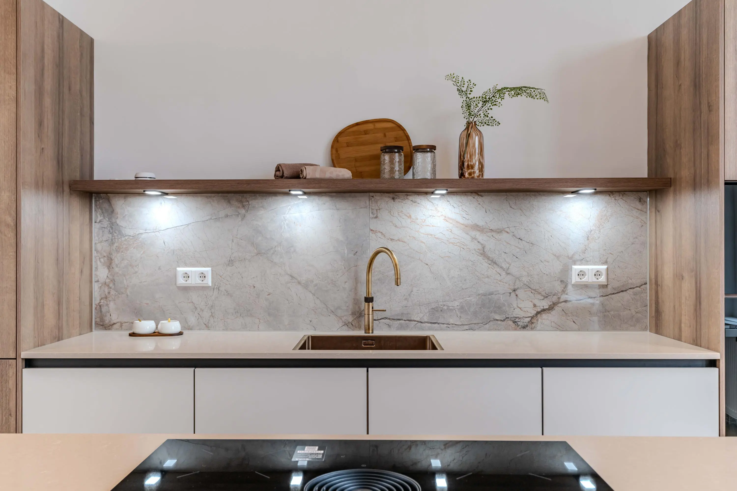 De luxe open keuken is compleet uitgevoerd met een beige werkblad en bijpassende kasten en laden. De keuken is volledig uitgerust met hoogwaardige inbouwapparatuur, waaronder een vierpits inductiekookplaat met geïntegreerde afzuiging, oven, magnetron, koel-/vriescombinatie, vaatwasser en een spoelbak met Quooker/mengkraan. Aangrenzend bevindt zich de sfeervolle eetkamer met raampartij en uitzicht op het dakterras.