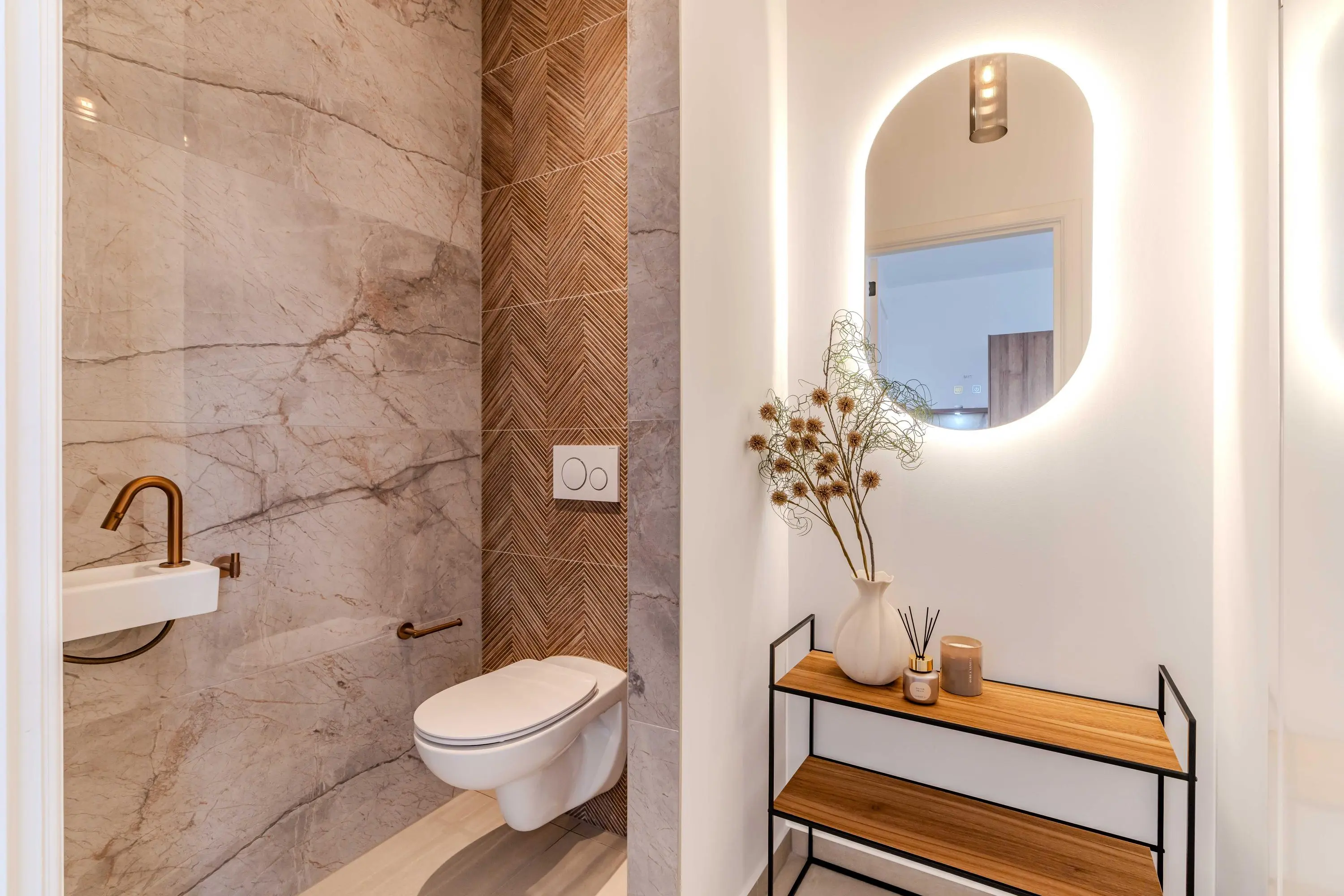 Modern zwevend toilet met fontein, alsmede een separate ruimte met verlichte spiegelwand en praktische berging.