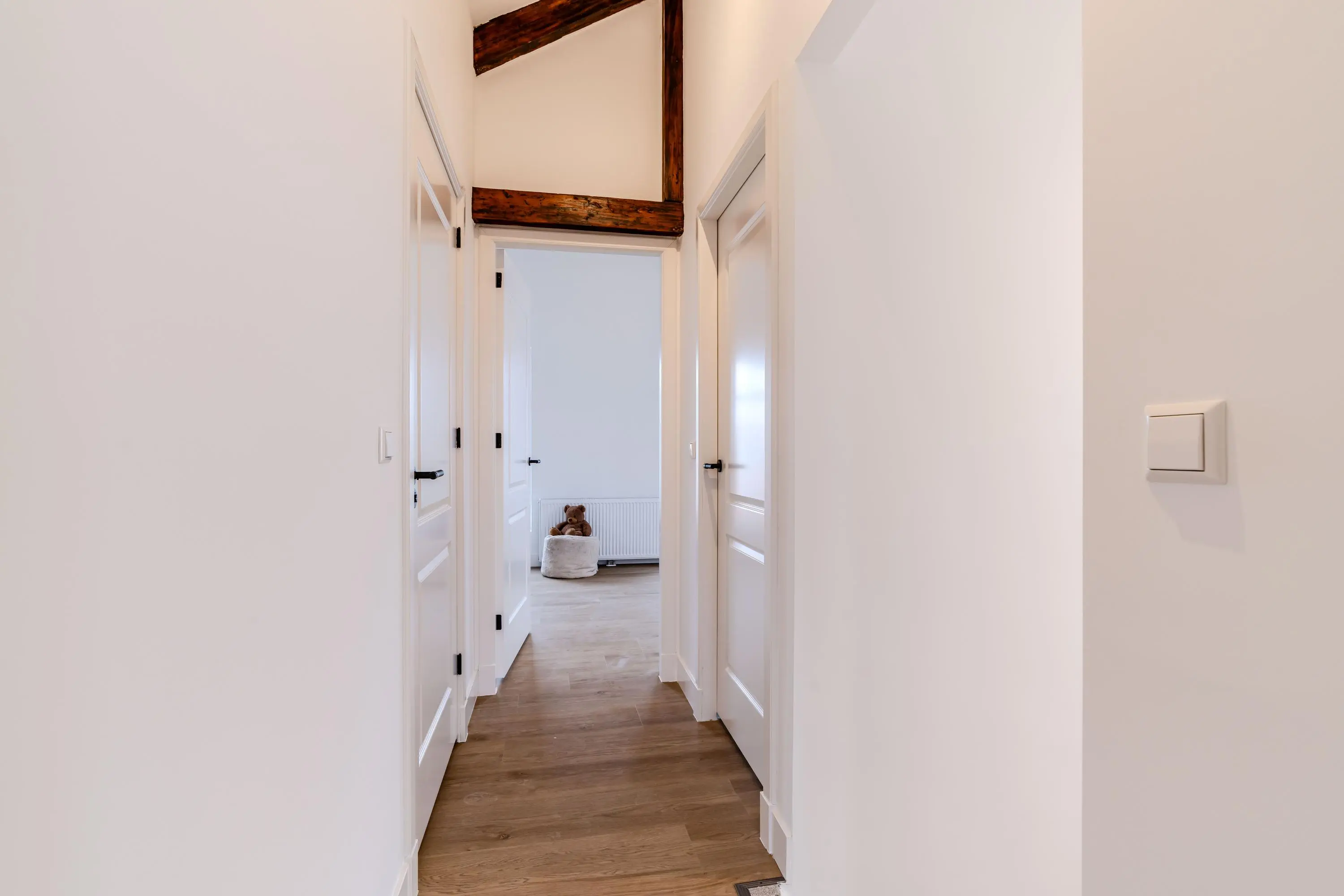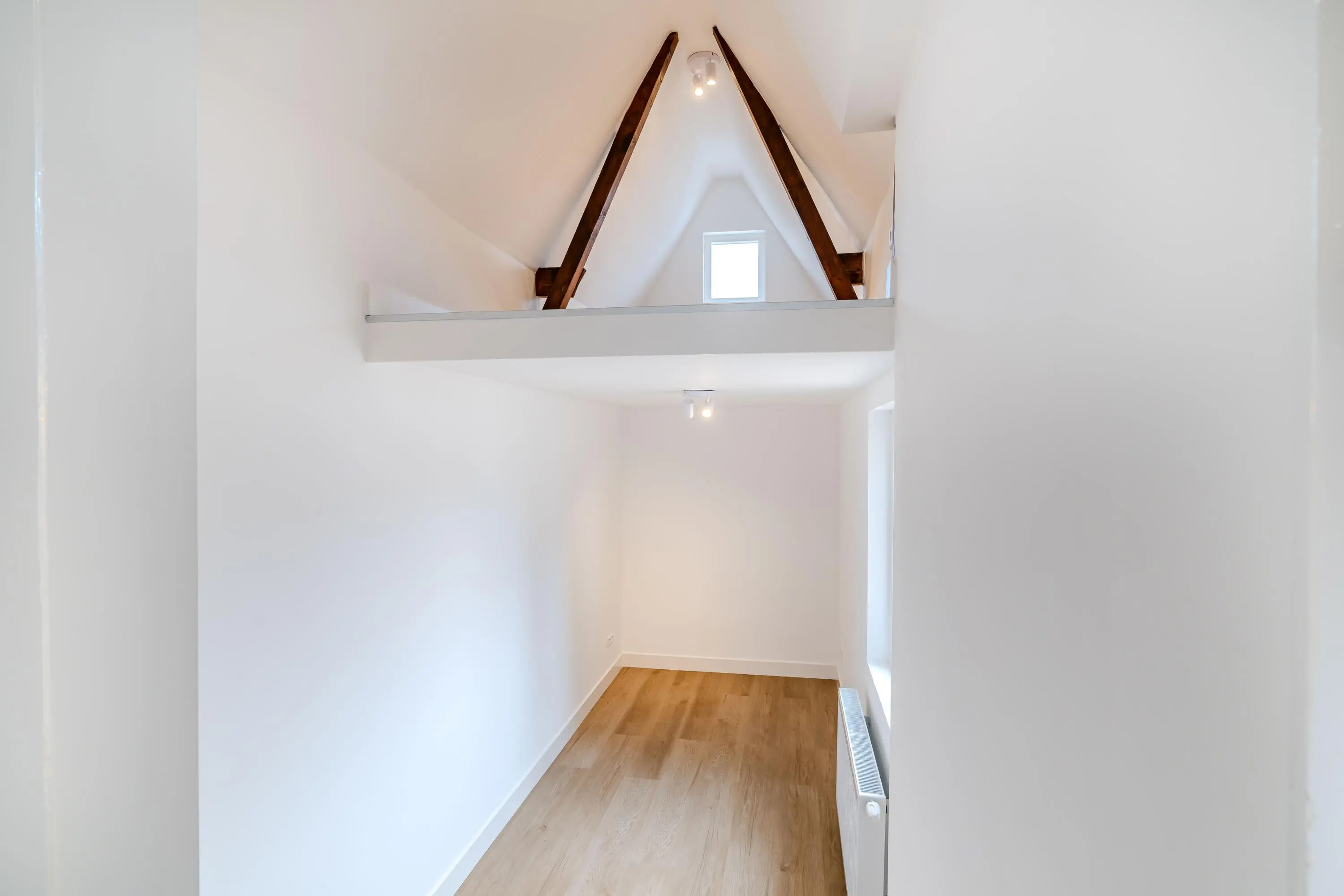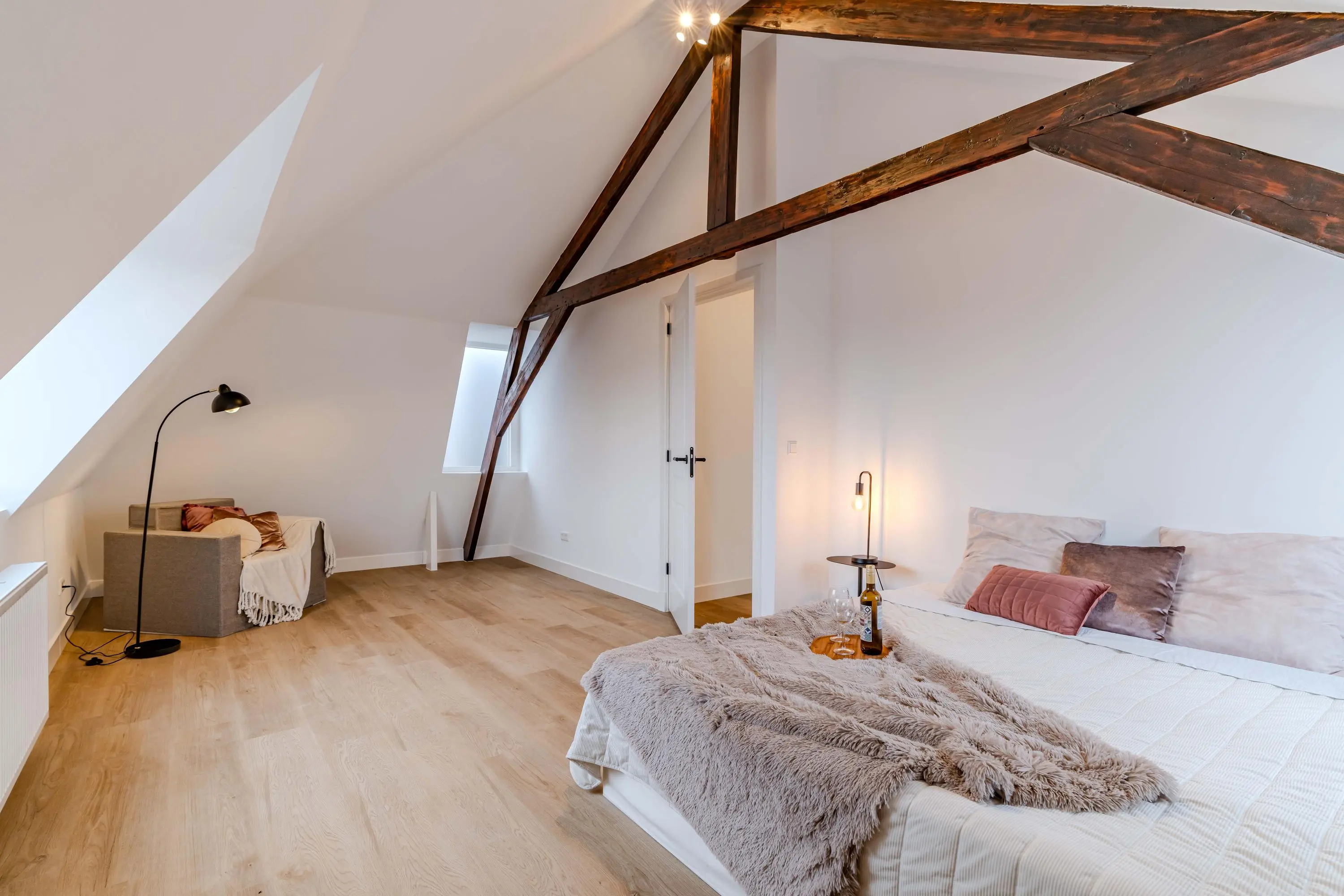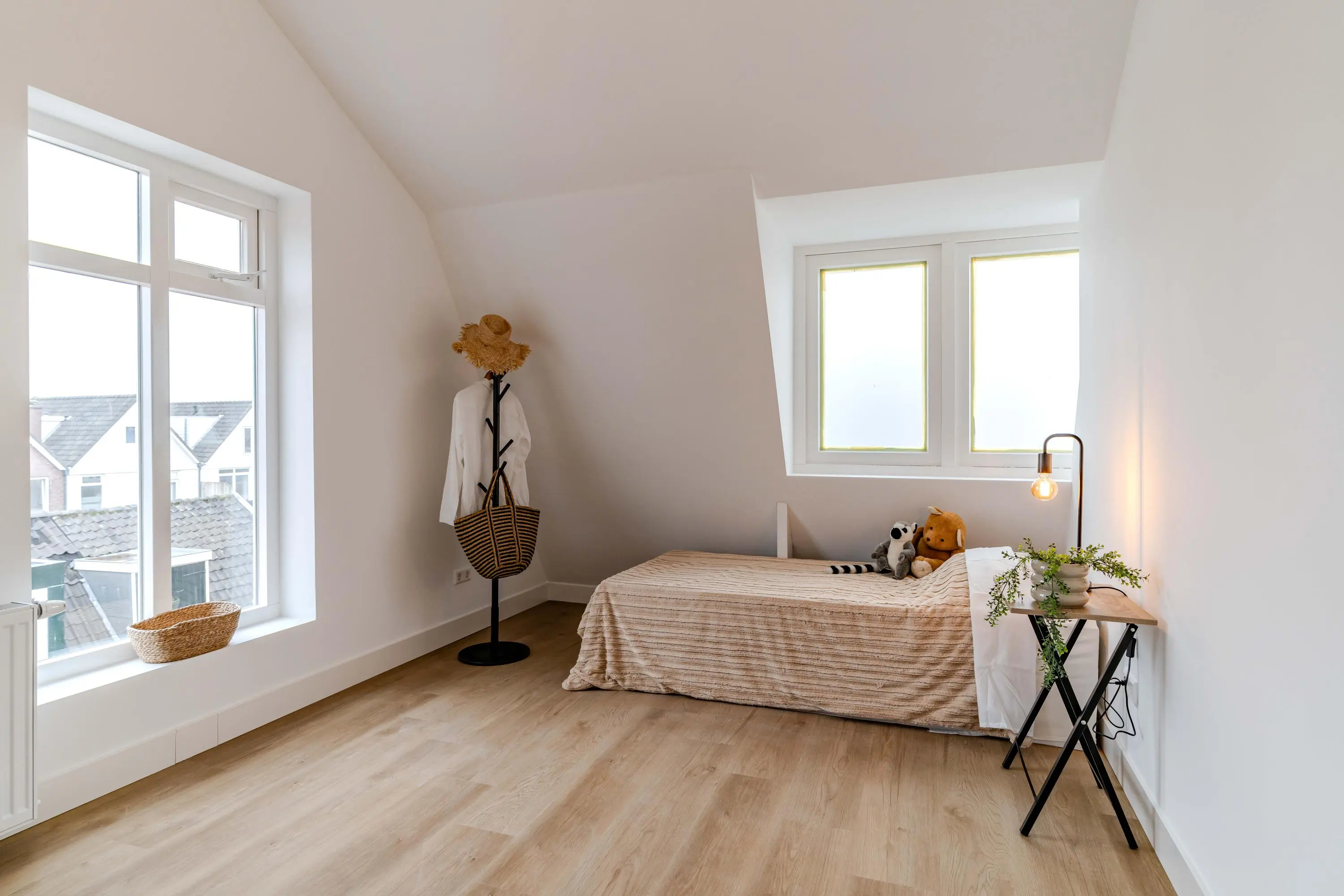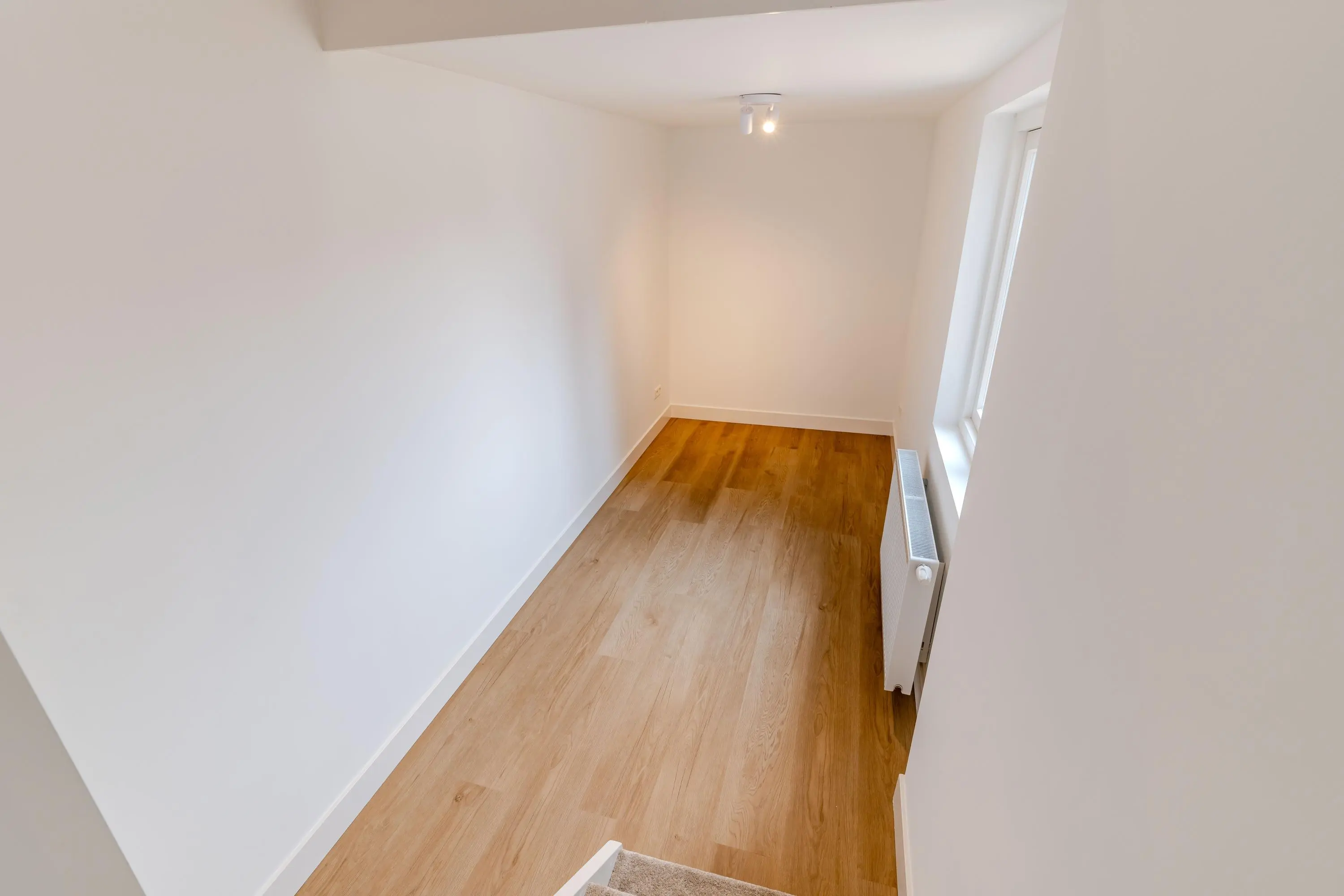 Aan de achterzijde bevindt zich een multifunctionele kamer, ideaal als thuiswerkplek, speelkamer of logeerkamer. De zichtbare dakspanten geven deze ruimte extra karakter.