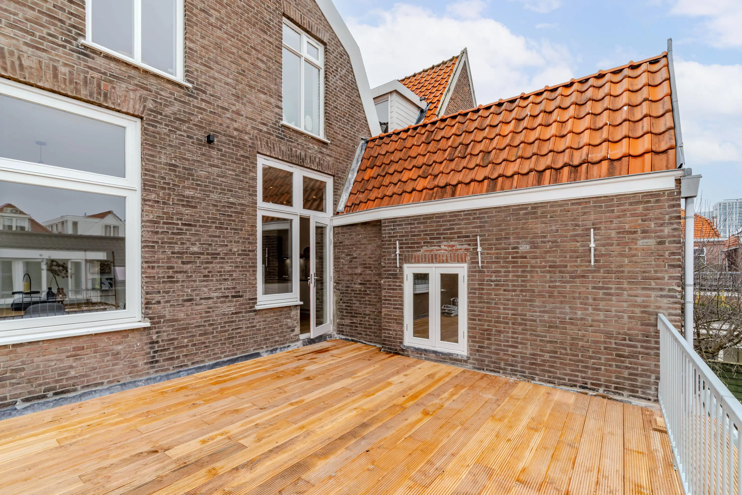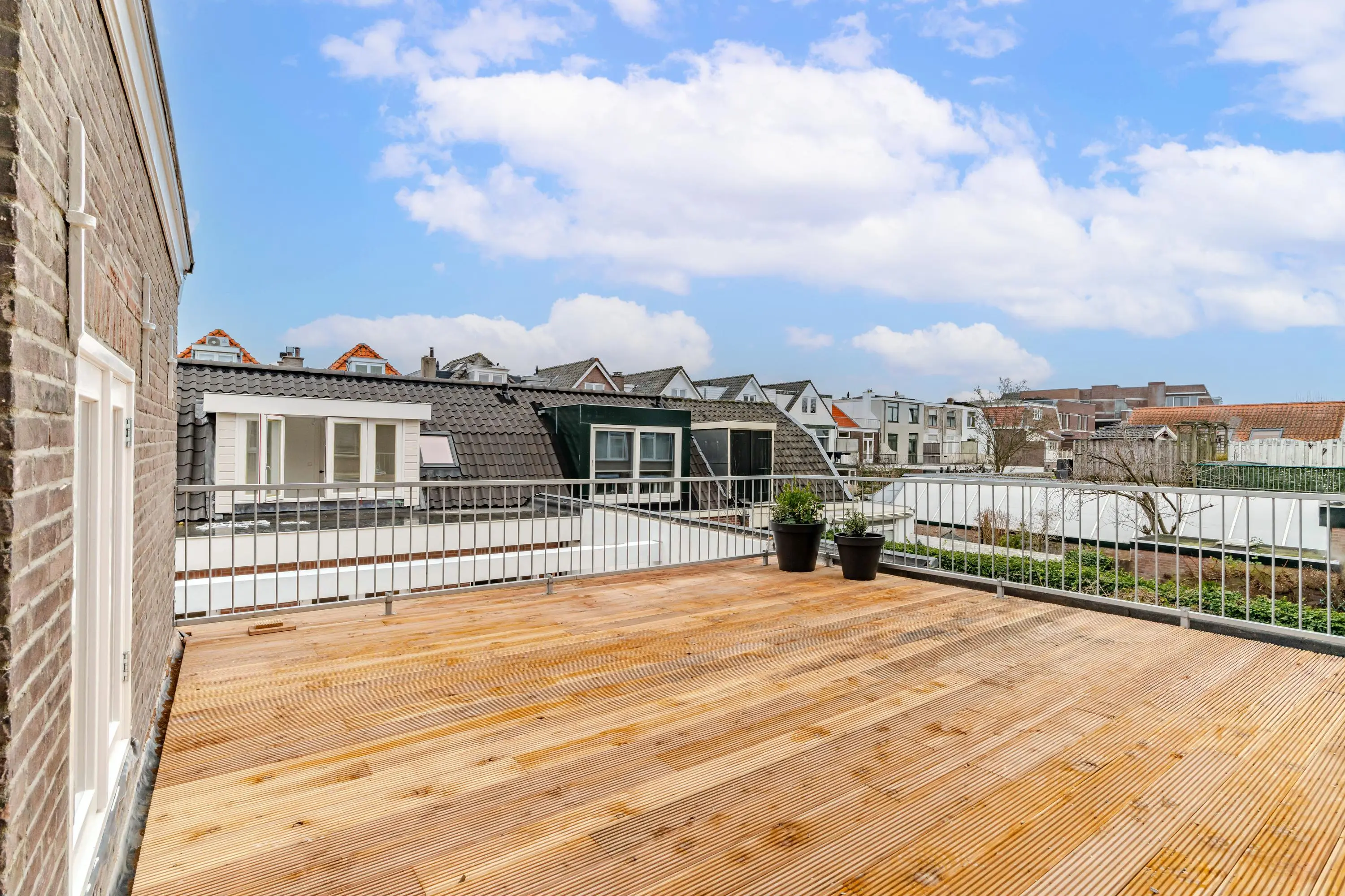 Vanuit de keuken is er directe toegang tot het terras: een heerlijke buitenruimte op het zonnige zuidwesten, ideaal voor de middag- en avondzon. Het royale dakterras is voorzien van een houten vlonder en een stalen balustrade.