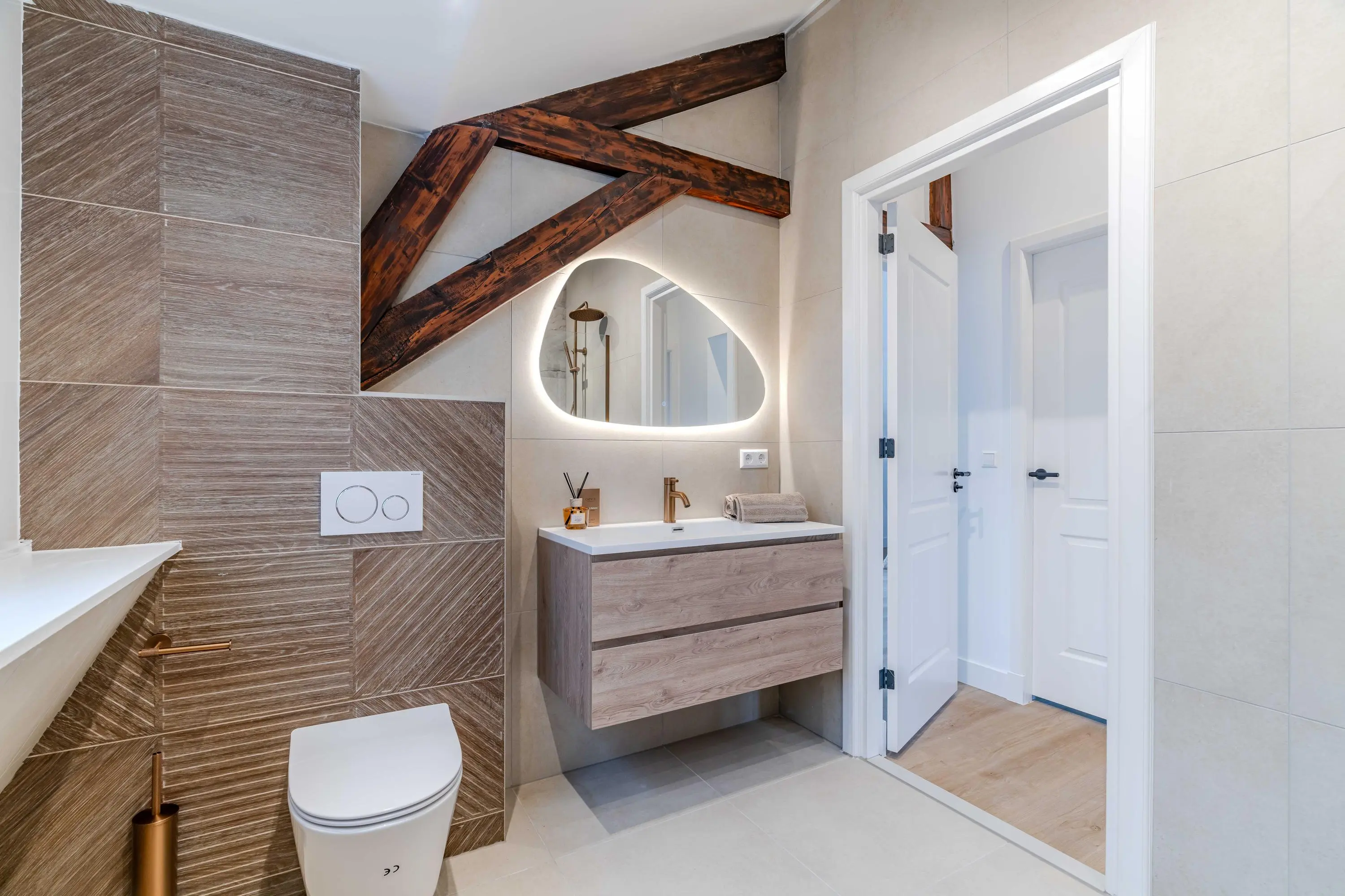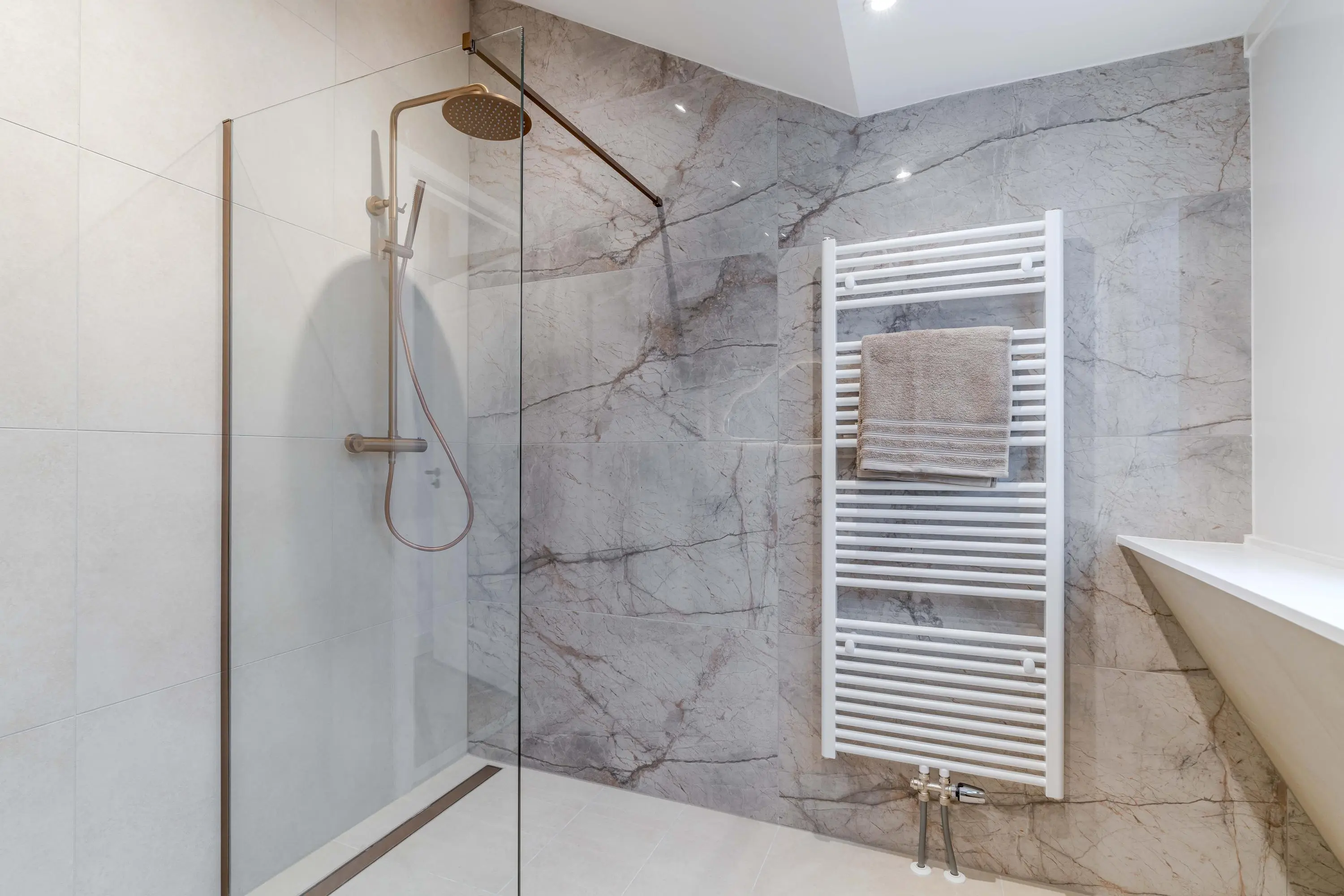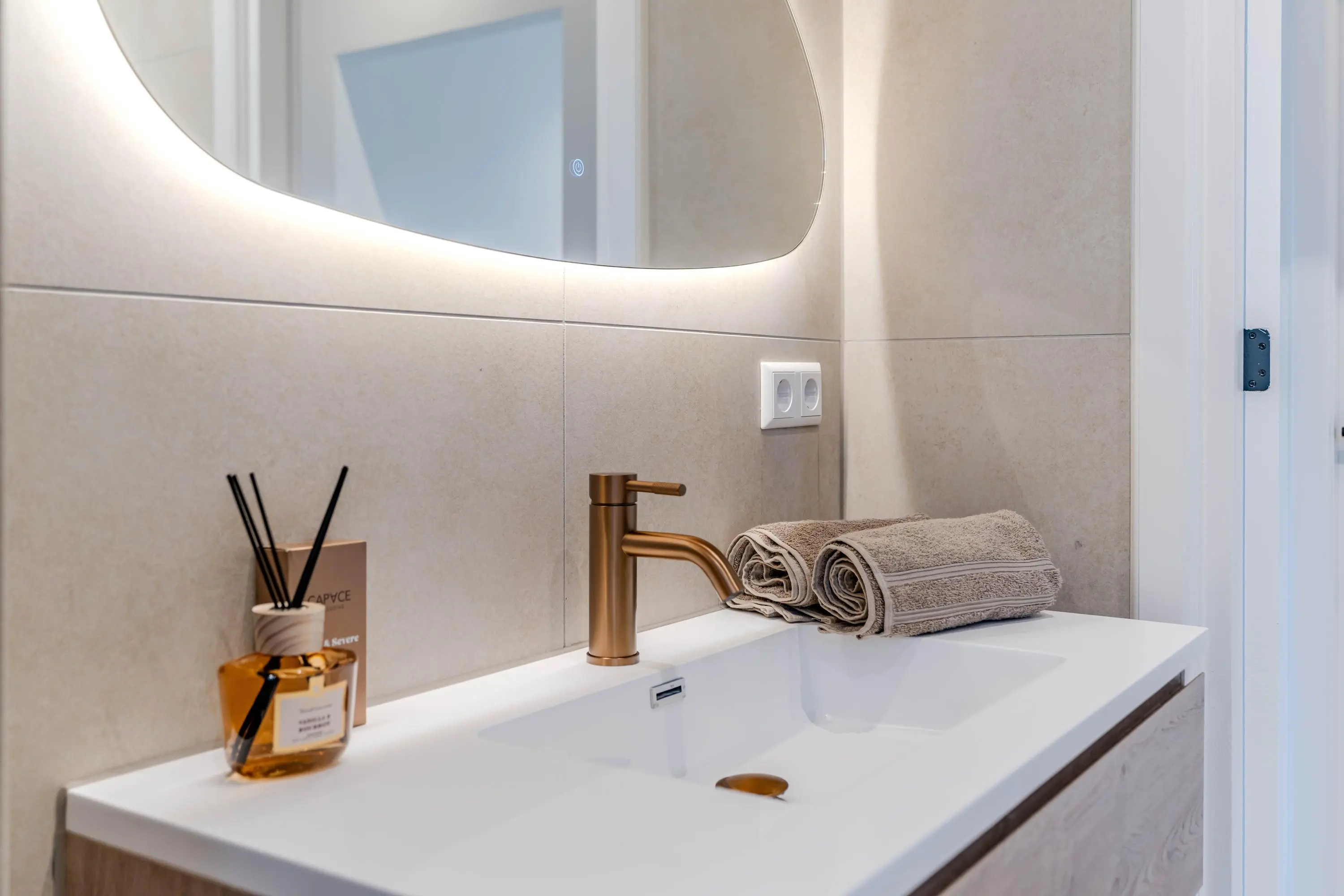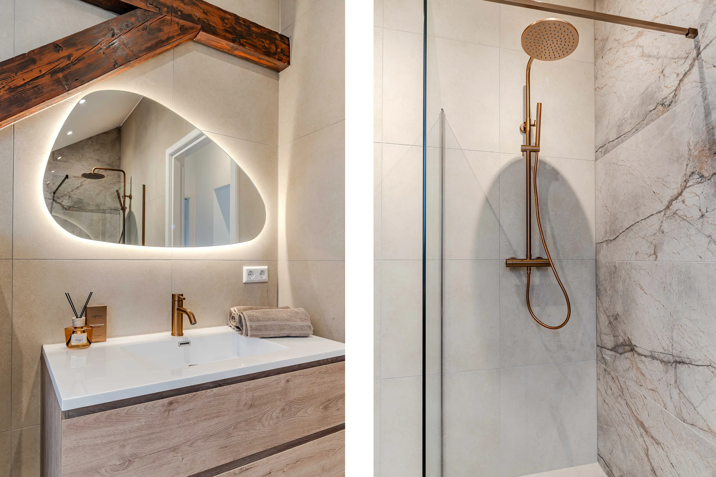 De luxe badkamer is stijlvol afgewerkt met beige wand- en vloertegels en een strak gestuukt plafond. De badkamer is voorzien van een royale inloopdouche met hand- en stortdouche, modern wastafelmeubel, zwevend toilet, designradiator, verlichte en verwarmde spiegel en inbouwspots.