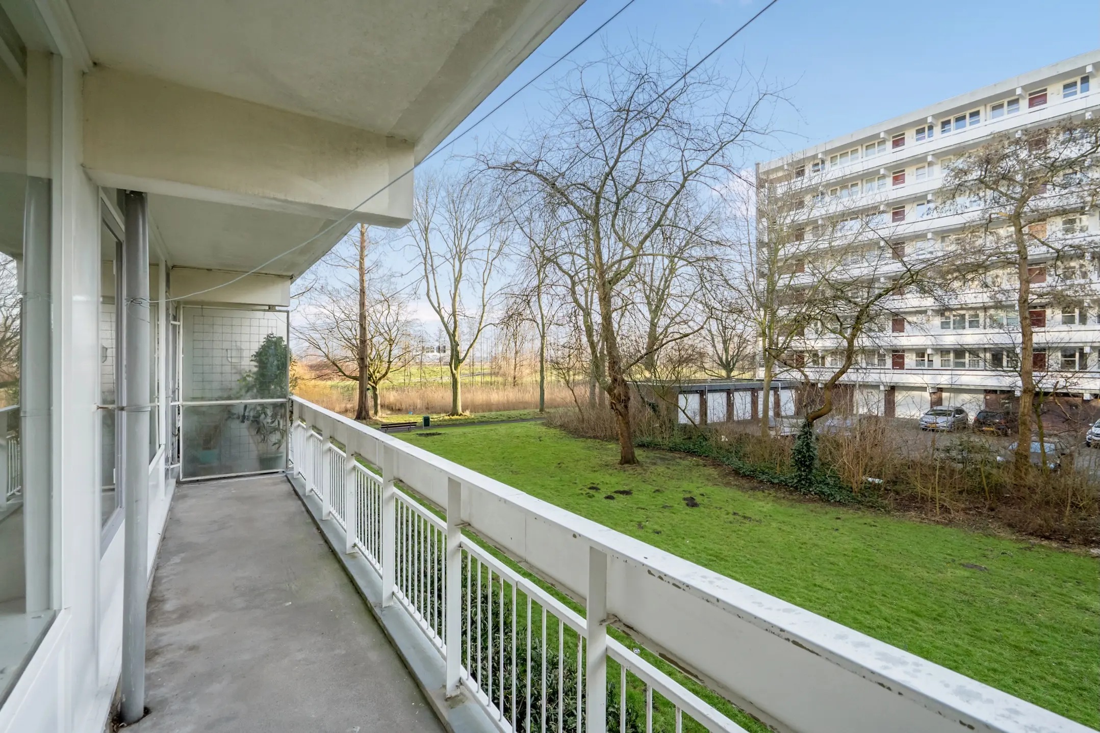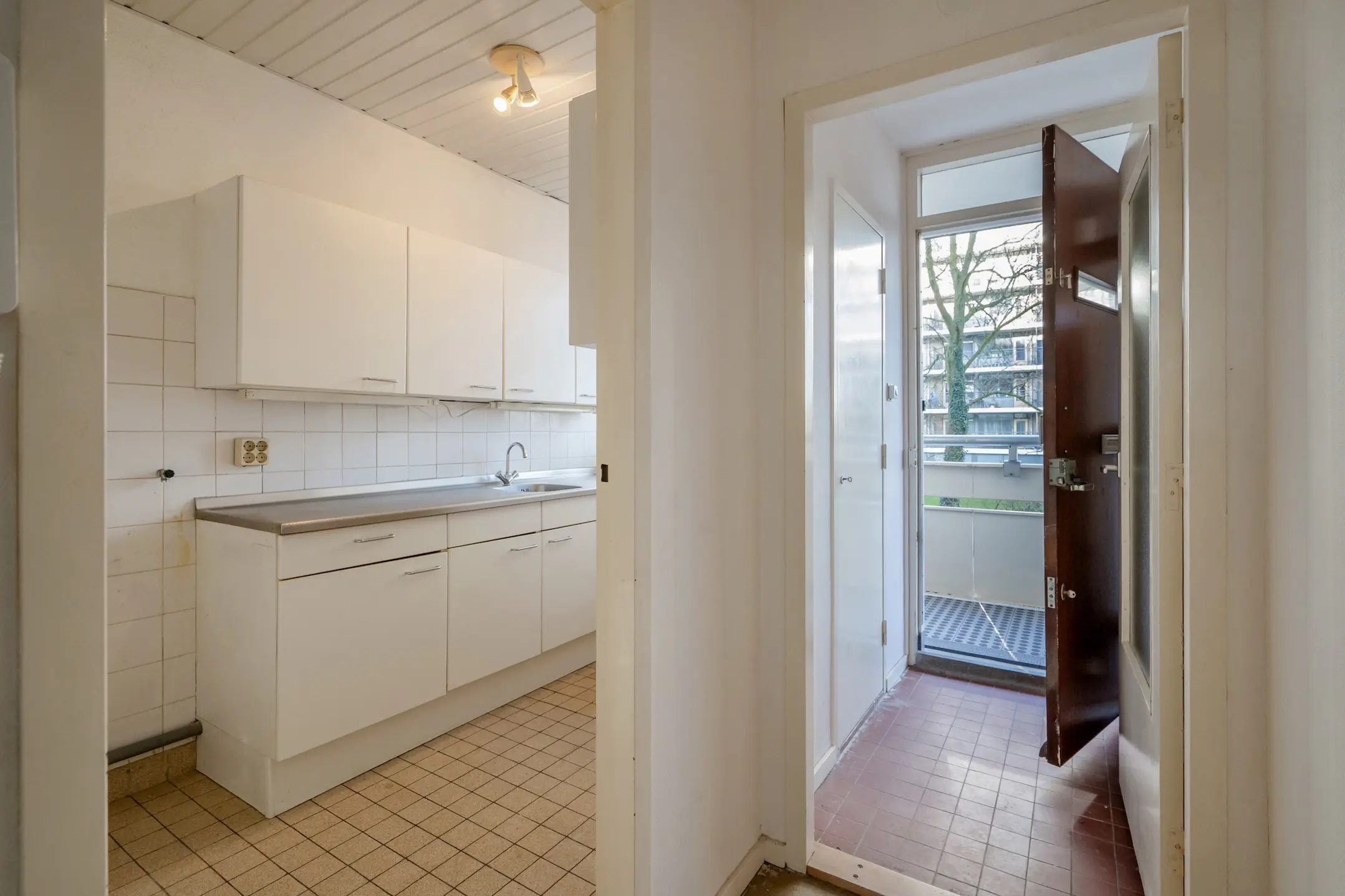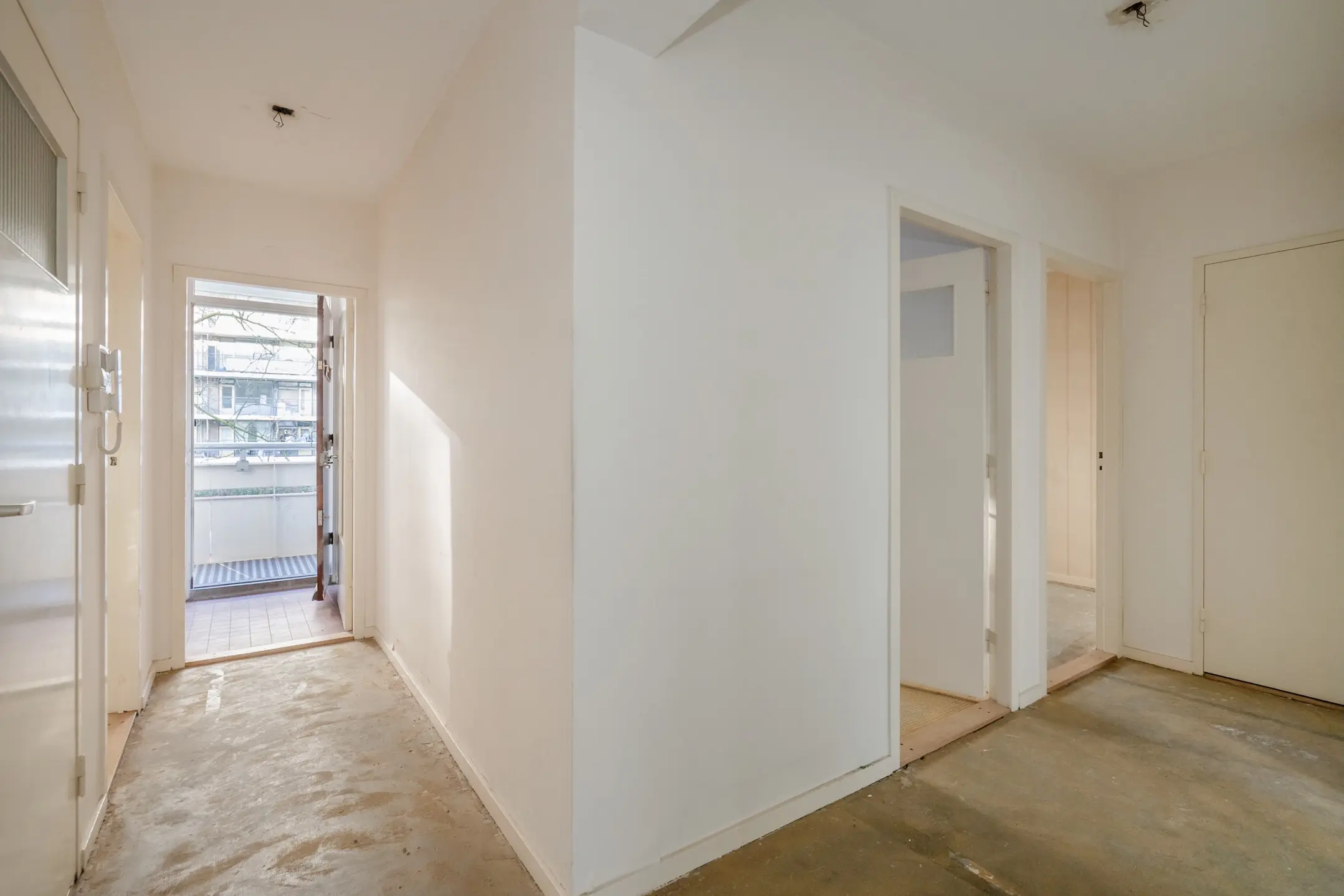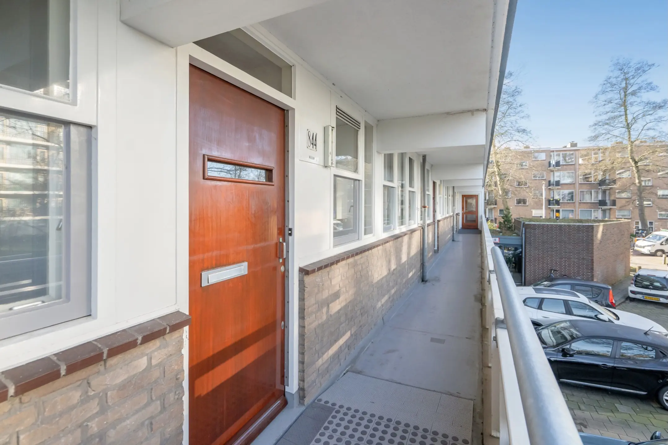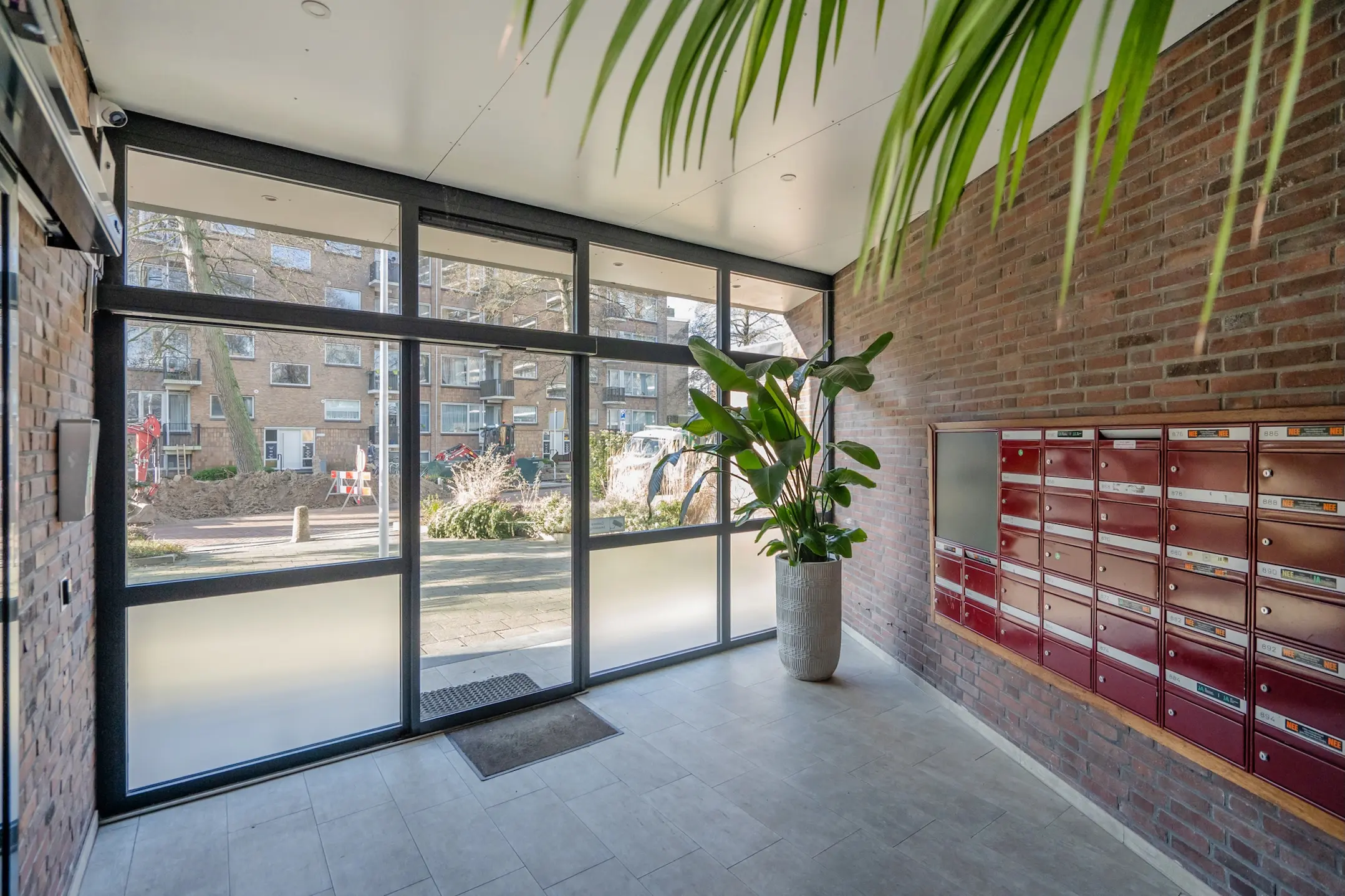 Gesloten portiek met bellentableau, brievenbussen en intercom. Trap of lift naar de eerste etage. Middels galerij toegang tot de woning. Entree, vestibule, meterkast (2 groepen). L-vormige gang met vaste kast. Separaat toilet.