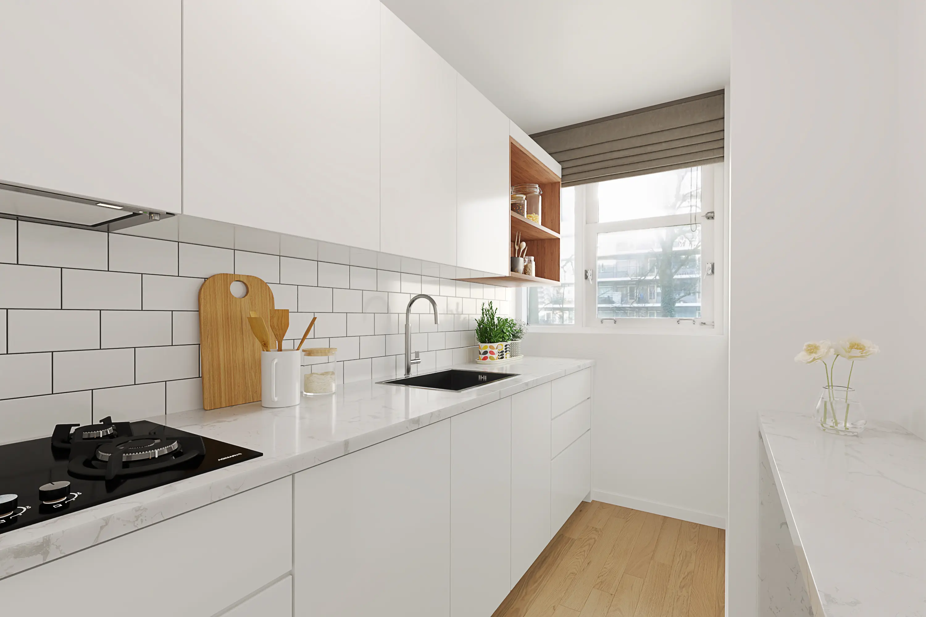 Royale lichte woon-/eetkamer, middels een deur toegang tot het zonnig balkon gelegen op het zuidoosten. Voorgelegen keuken met keukenblok, elektrische boiler en diverse opbergkasten.
