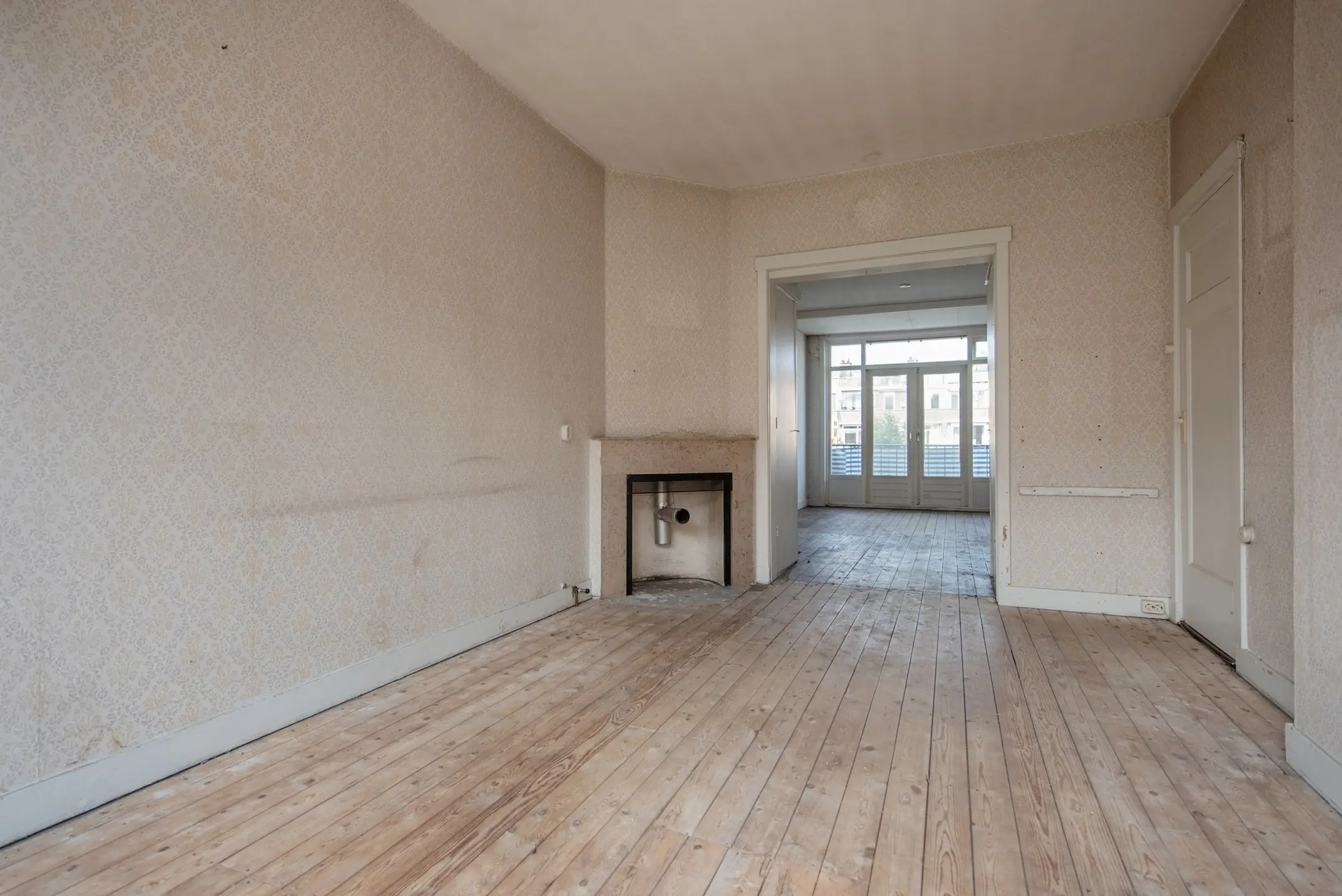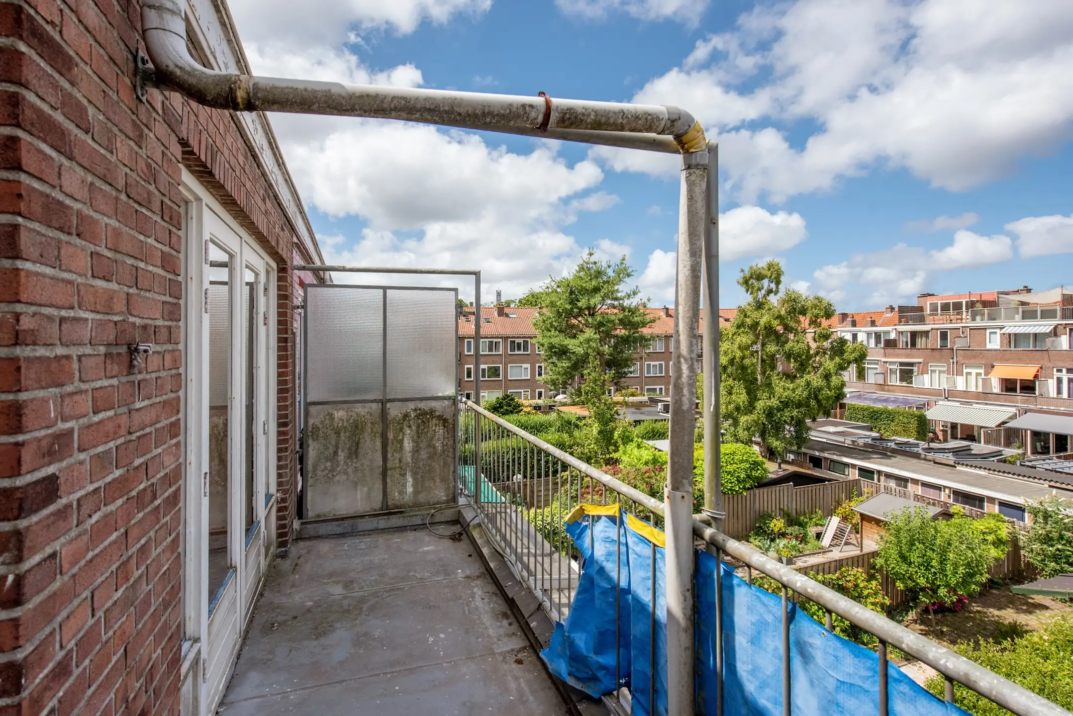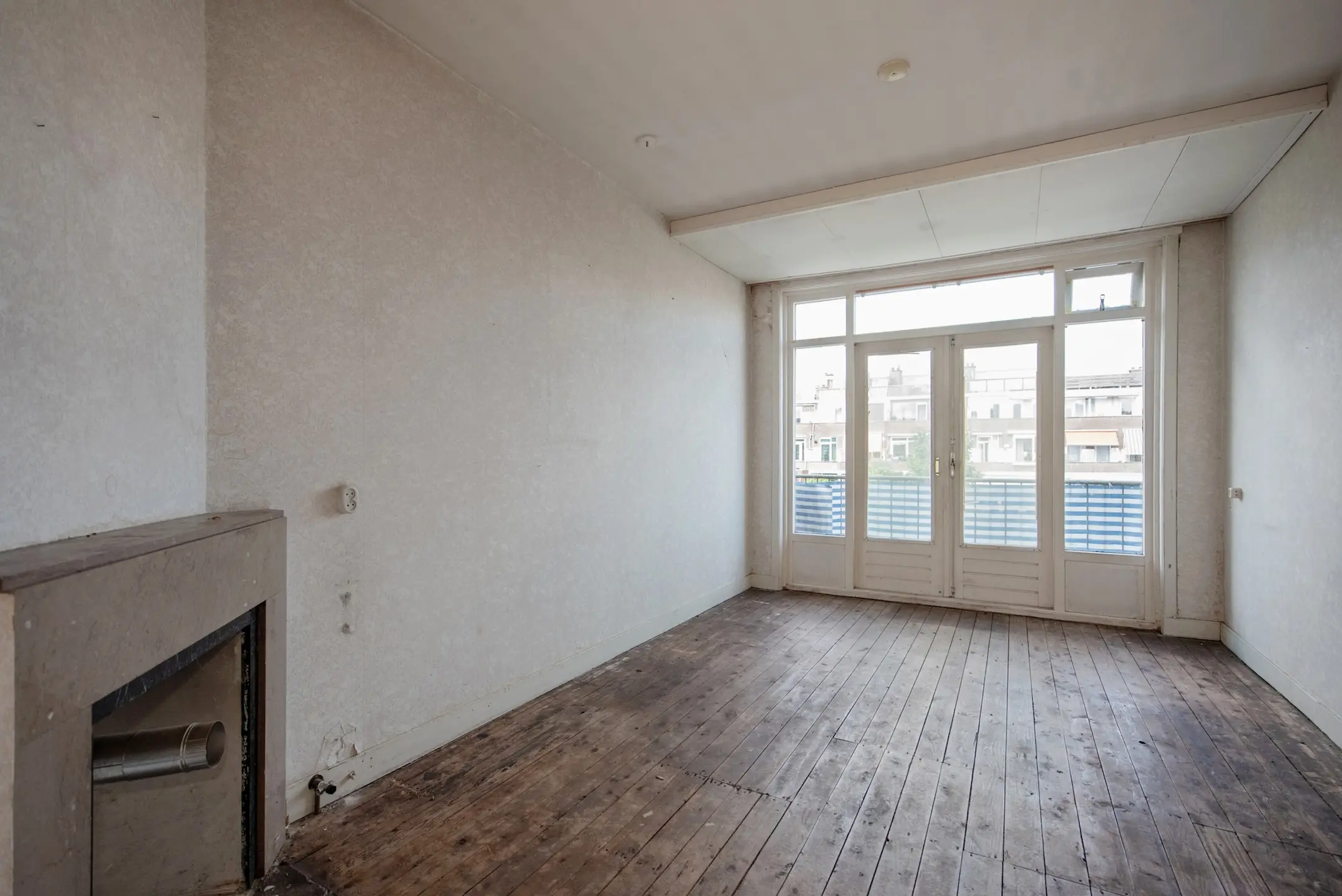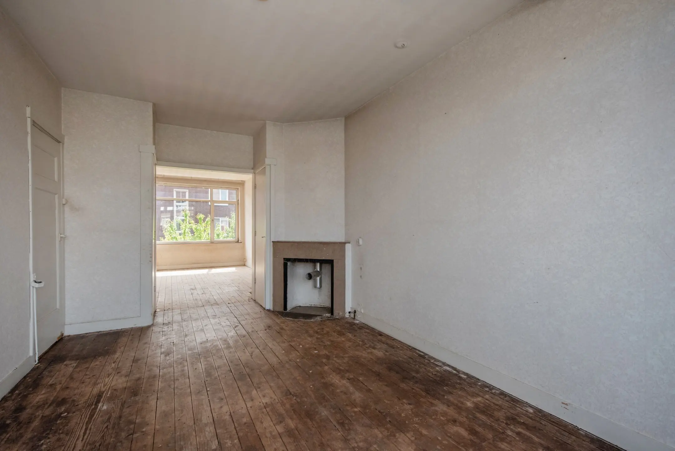De lichte woonkamer aan de voorzijde is voorzien van een karakteristieke schouw en praktische inbouwkasten. Aansluitend bevindt zich de eetkamer, eveneens met een sfeervolle schouw. Openslaande deuren toegang tot het zonnige balkon op het westen, met een fraai uitzicht over de groene achtertuinen.