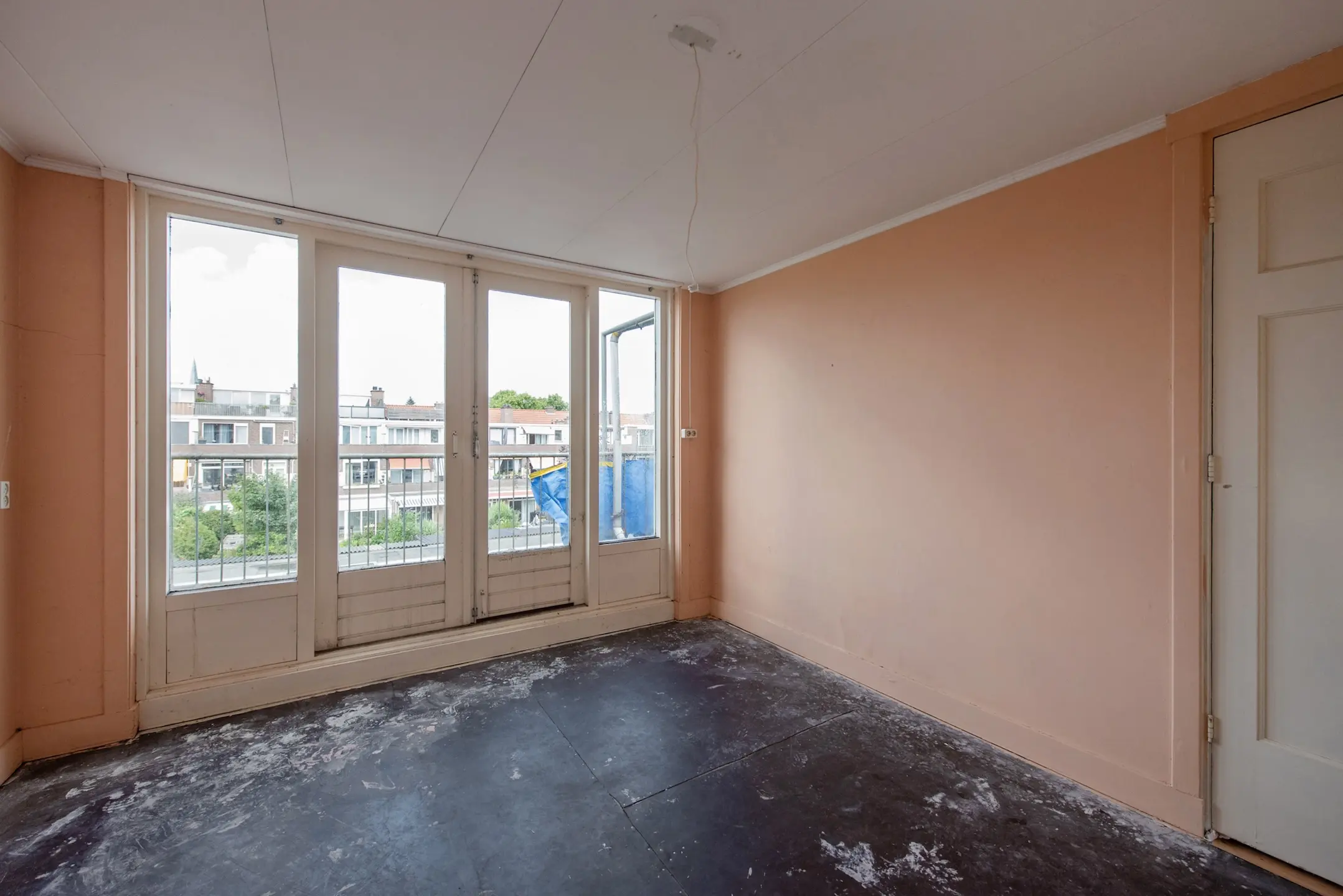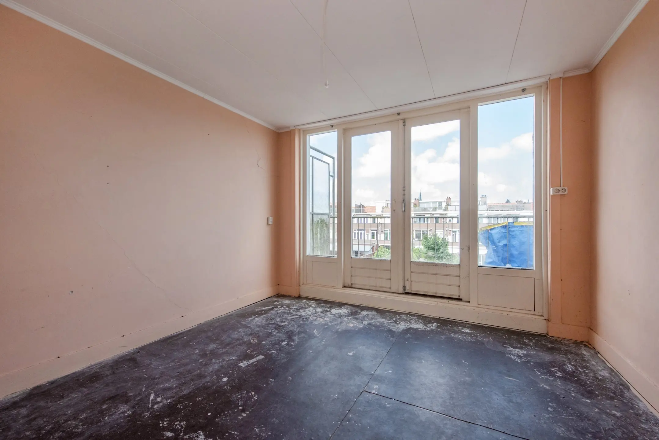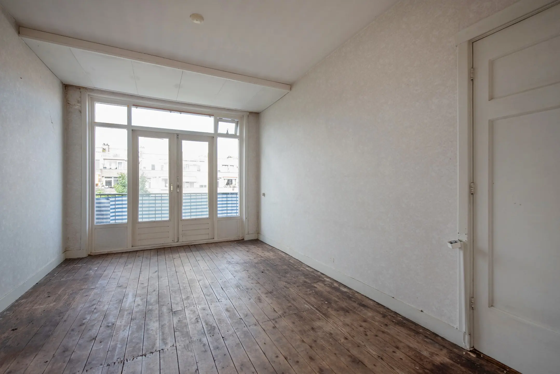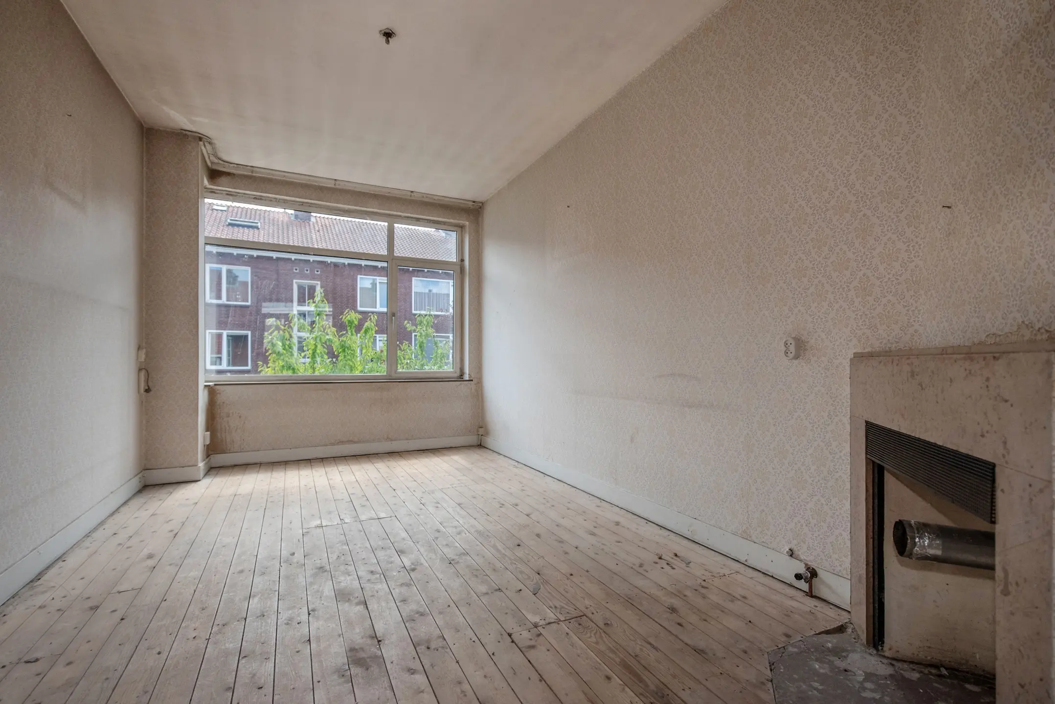 De lichte woonkamer aan de voorzijde is voorzien van een karakteristieke schouw en praktische inbouwkasten. Aansluitend bevindt zich de eetkamer, eveneens met een sfeervolle schouw. Openslaande deuren toegang tot het zonnige balkon op het westen, met een fraai uitzicht over de groene achtertuinen.