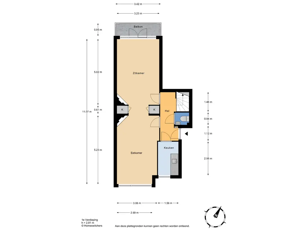 Open portiek, entree woning. De hal geeft toegang tot de diverse vertrekken en beschikt over een meterkast (4 groepen). Toilet met fontein.