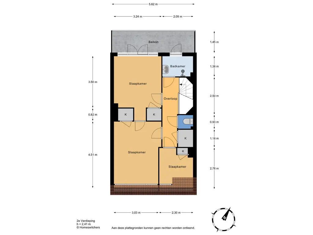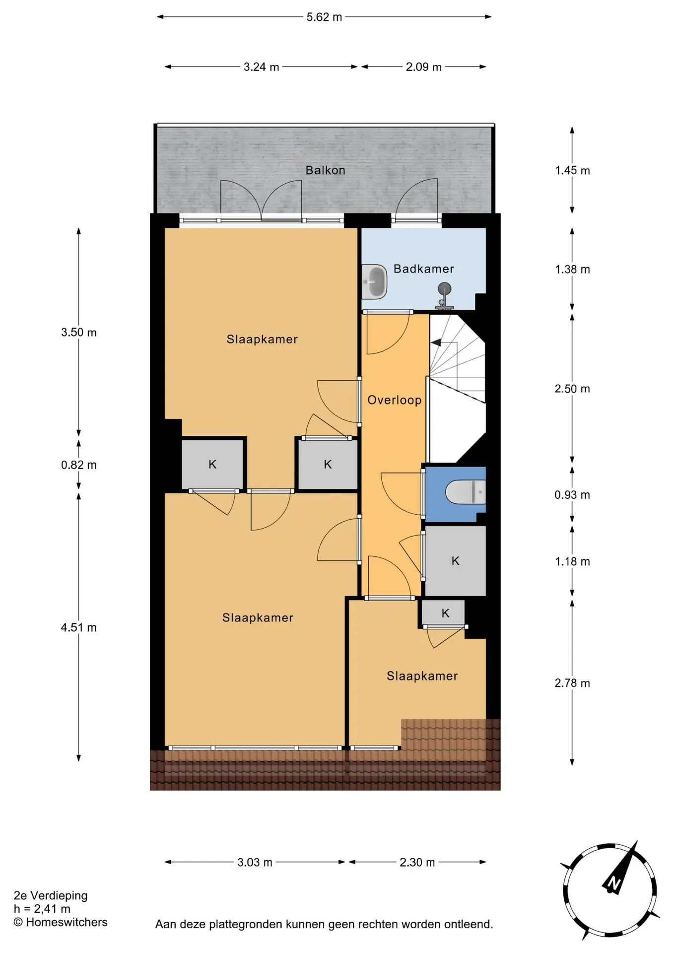 Aan de voorzijde zijn nog twee slaapkamers gesitueerd, waarvan één met een dakkapel. Vanuit de hal op deze verdieping is er tevens toegang tot een tweede toilet en de badkamer, voorzien van een douche, wastafel en toegang tot het achtergelegen balkon.