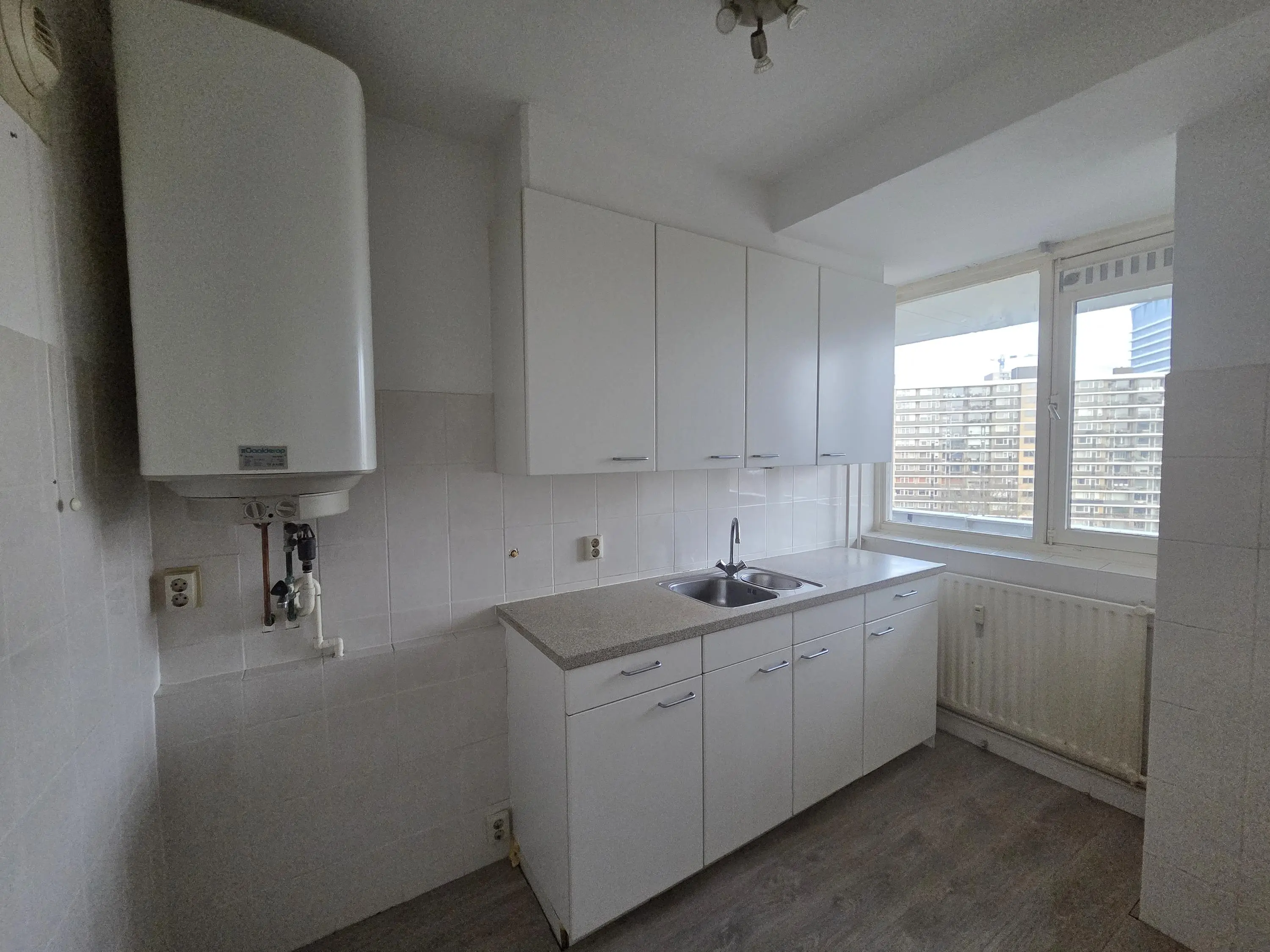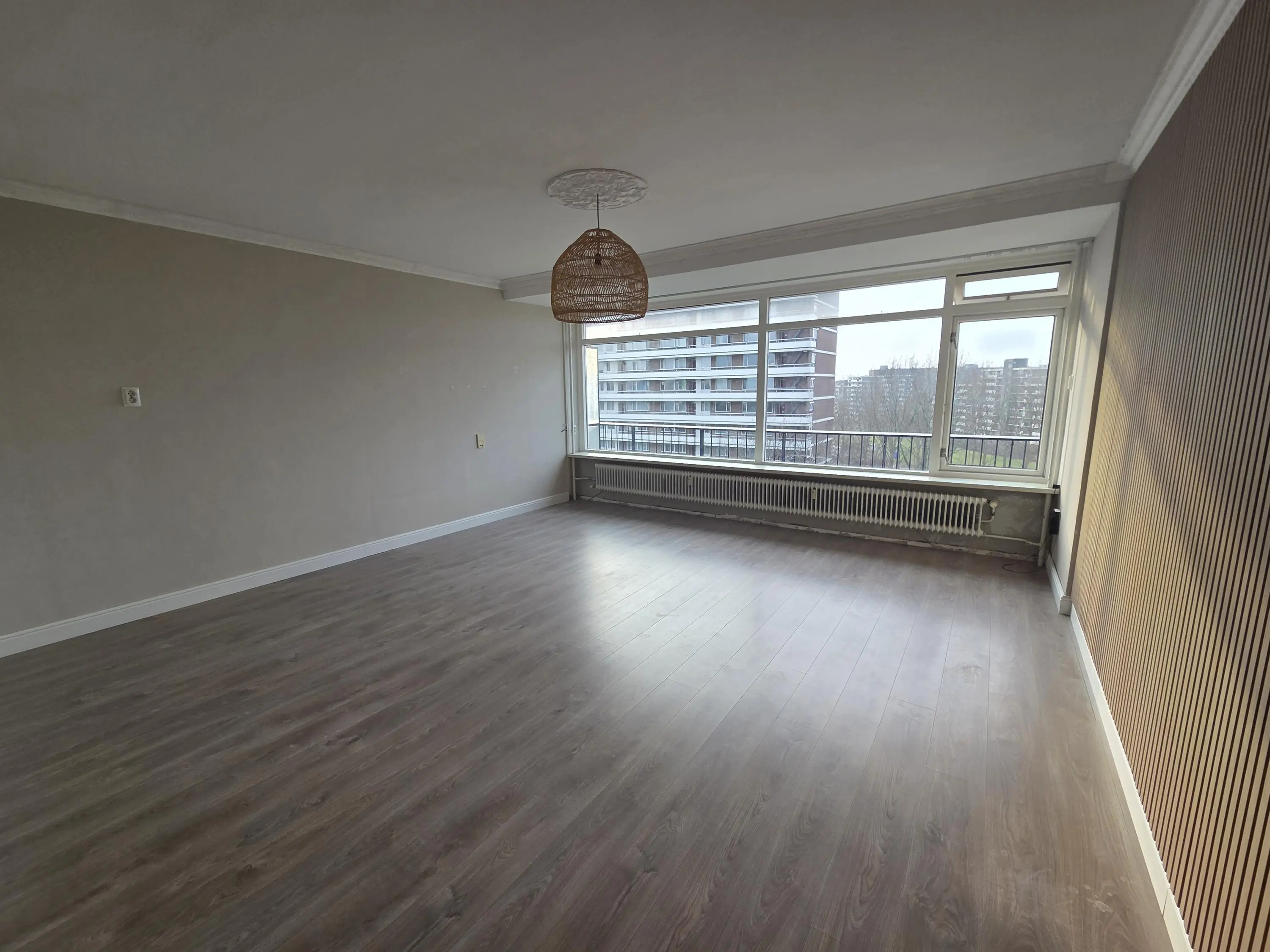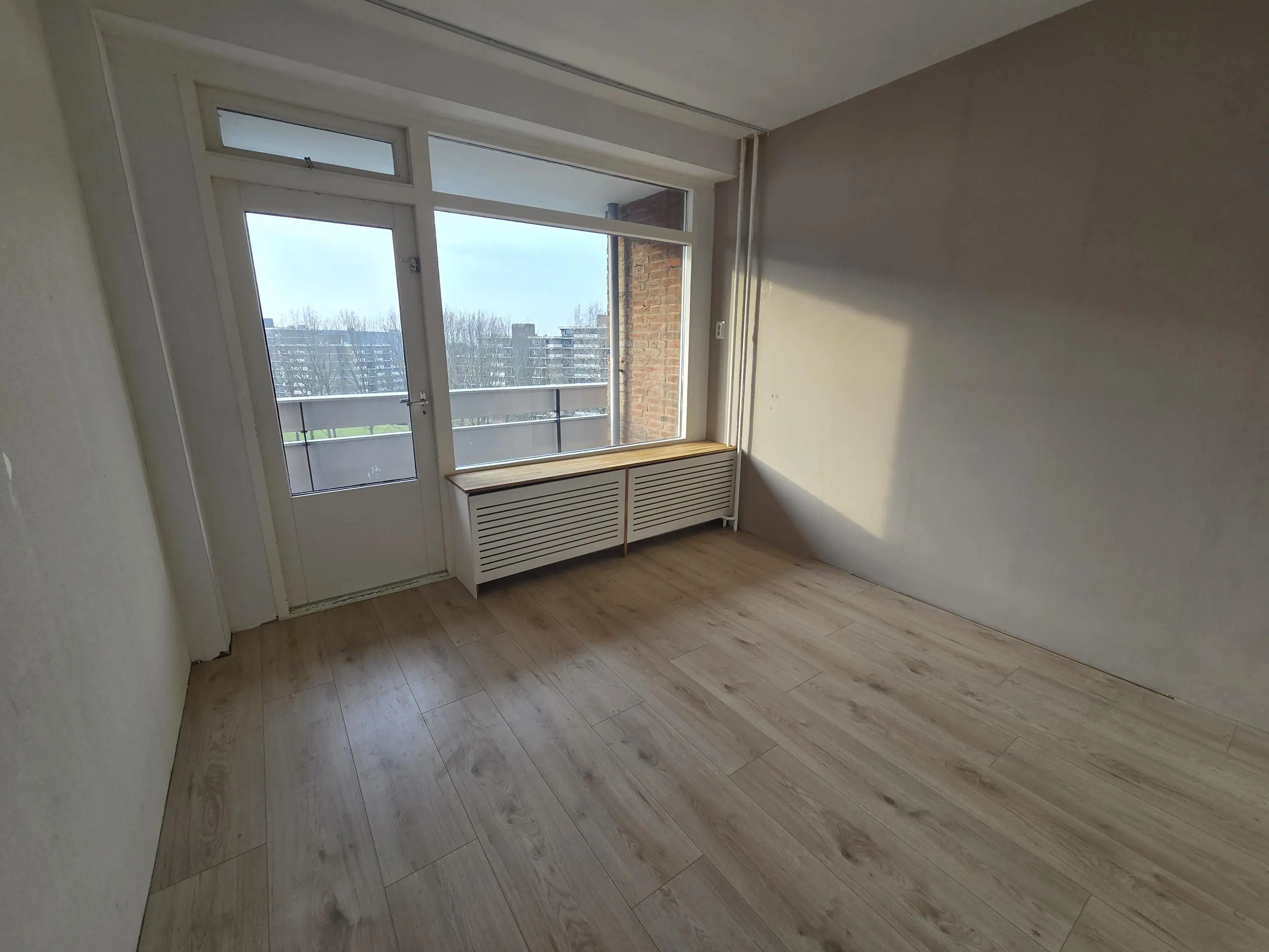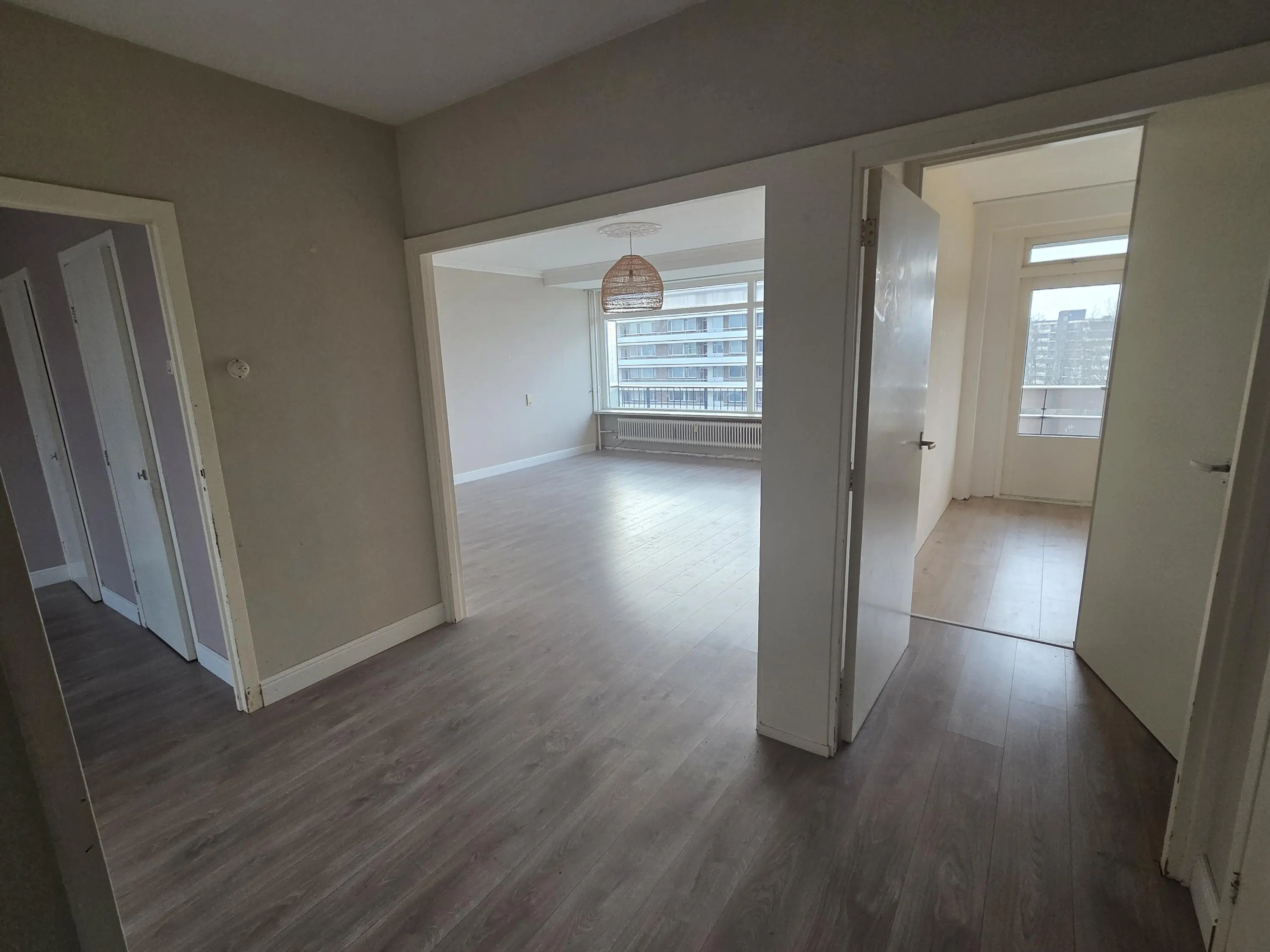 Afgesloten hoofdentree met bellentableau en brievenbussen, liften en trappenhuis, toegang tot de woning vanaf de galerij, tochthalletje, ruime hal in open verbinding met de doorgebroken woon-/eetkamer. Weids uitzicht en vanwege de grote raampartijen is de woning heerlijk licht. Balkon pal op het zuiden, doorloop naar zeembalkon. In de woonkamer een vaste kast.