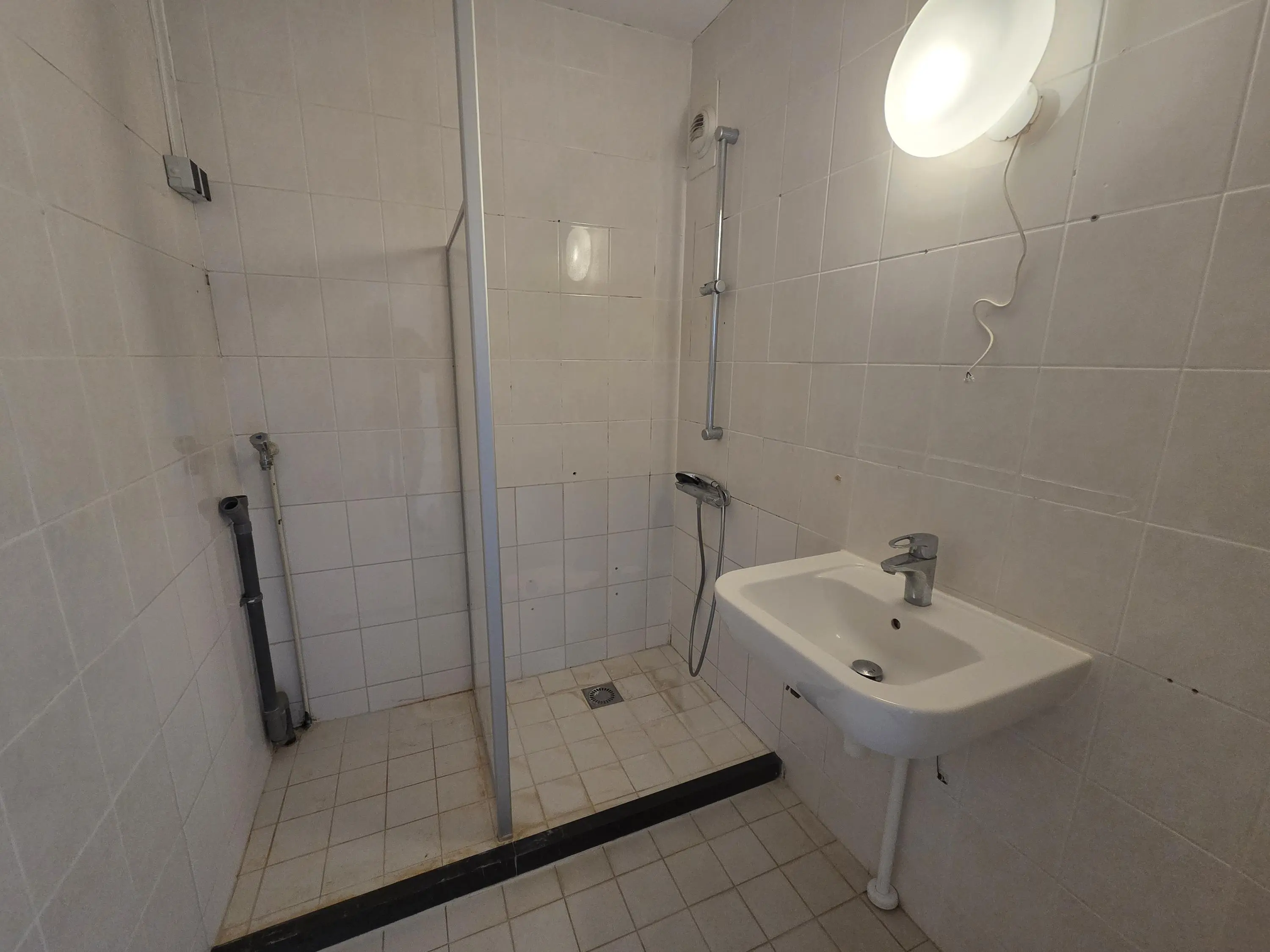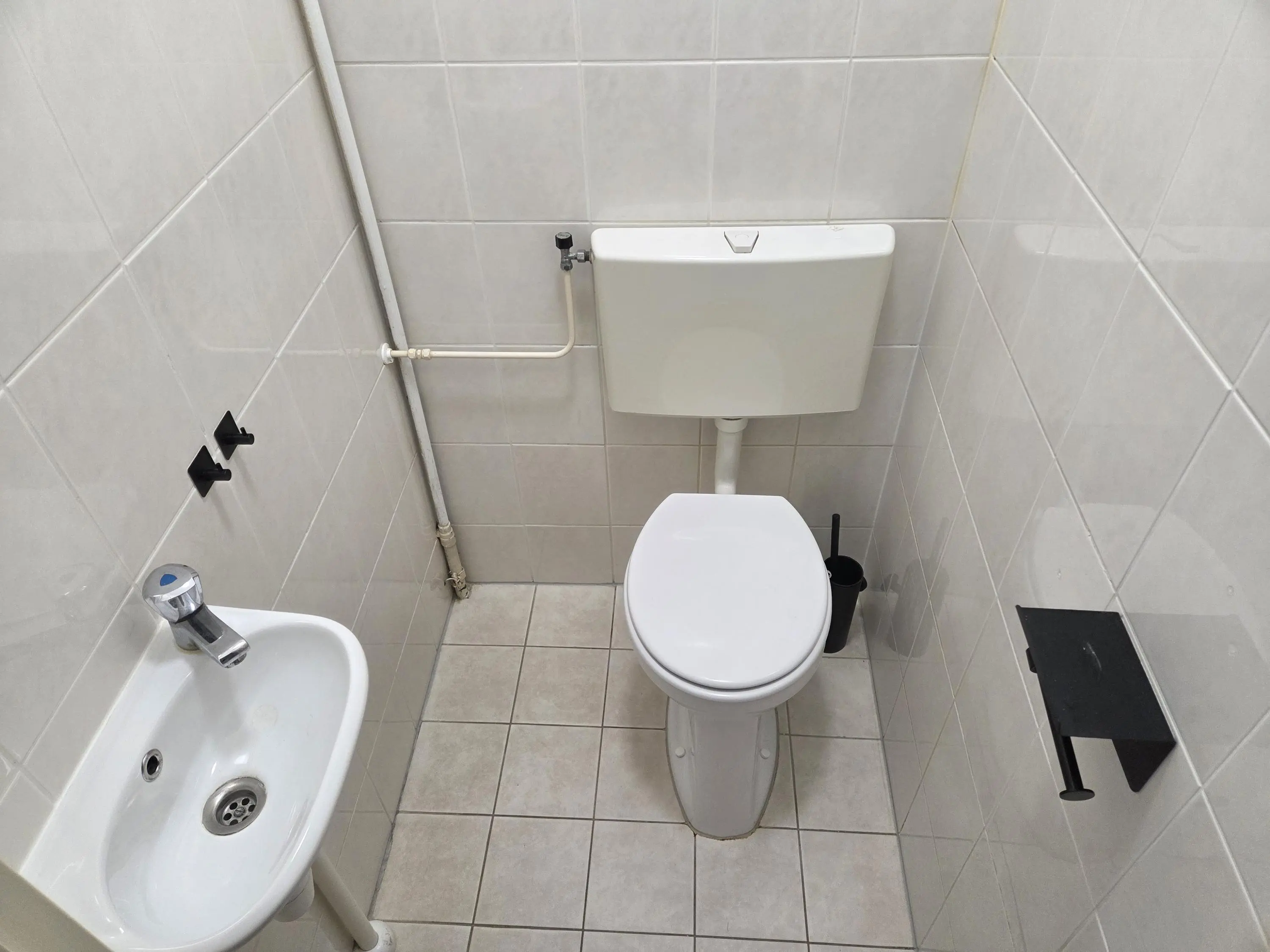 Ruime, eenvoudige badkamer, separaat eenvoudig toilet met fonteintje.