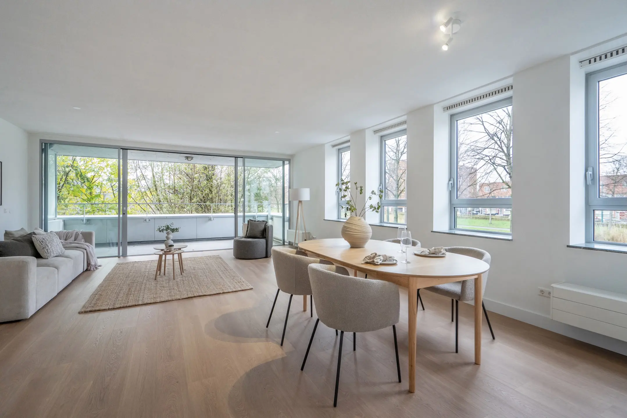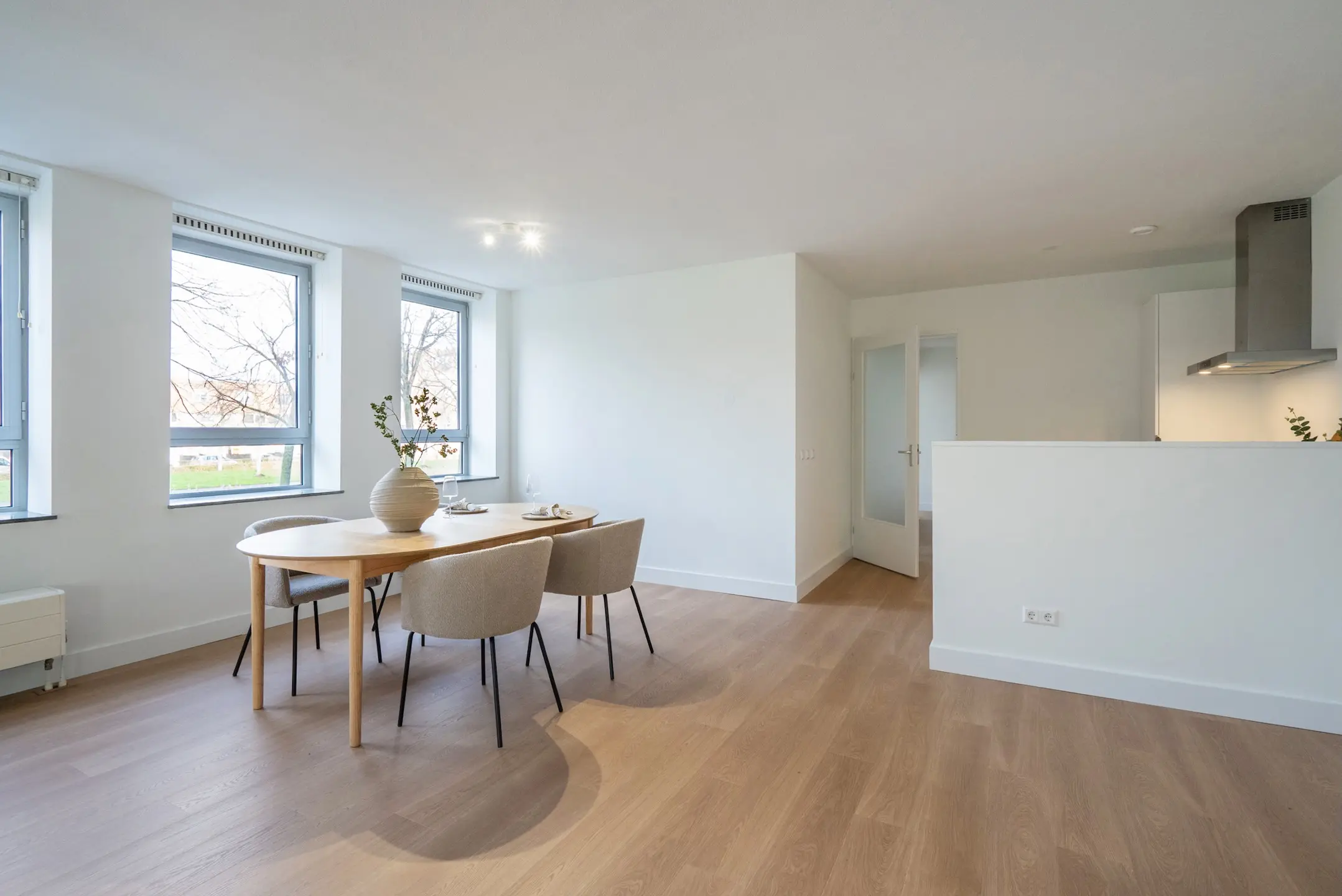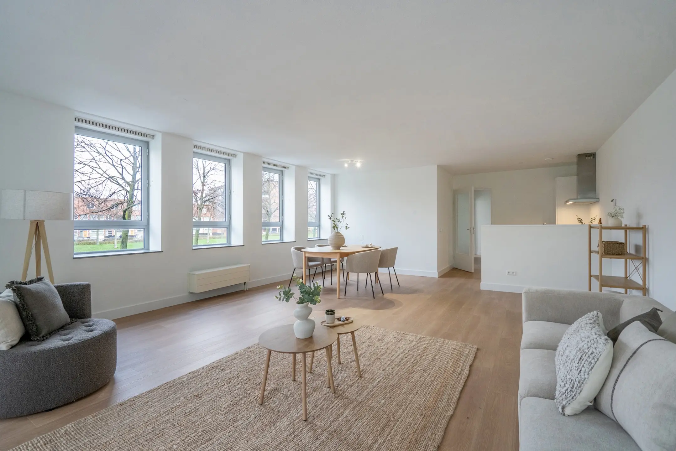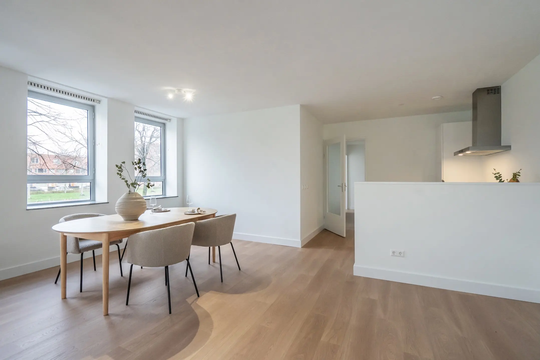 De royale woon- en eetkamer vormt het hart van de woning. De fraaie laminaatvloer met hoge plinten en strak gestuukte wanden zorgen voor een moderne uitstraling. Dankzij de grote raampartijen is de woonkamer bijzonder licht en biedt deze een prettige sfeer om te ontspannen of gasten te ontvangen. Vanuit de woonkamer stapt u direct het brede, zonnige balkon op. De perfecte plek om te genieten van de buitenlucht en het vrije uitzicht.