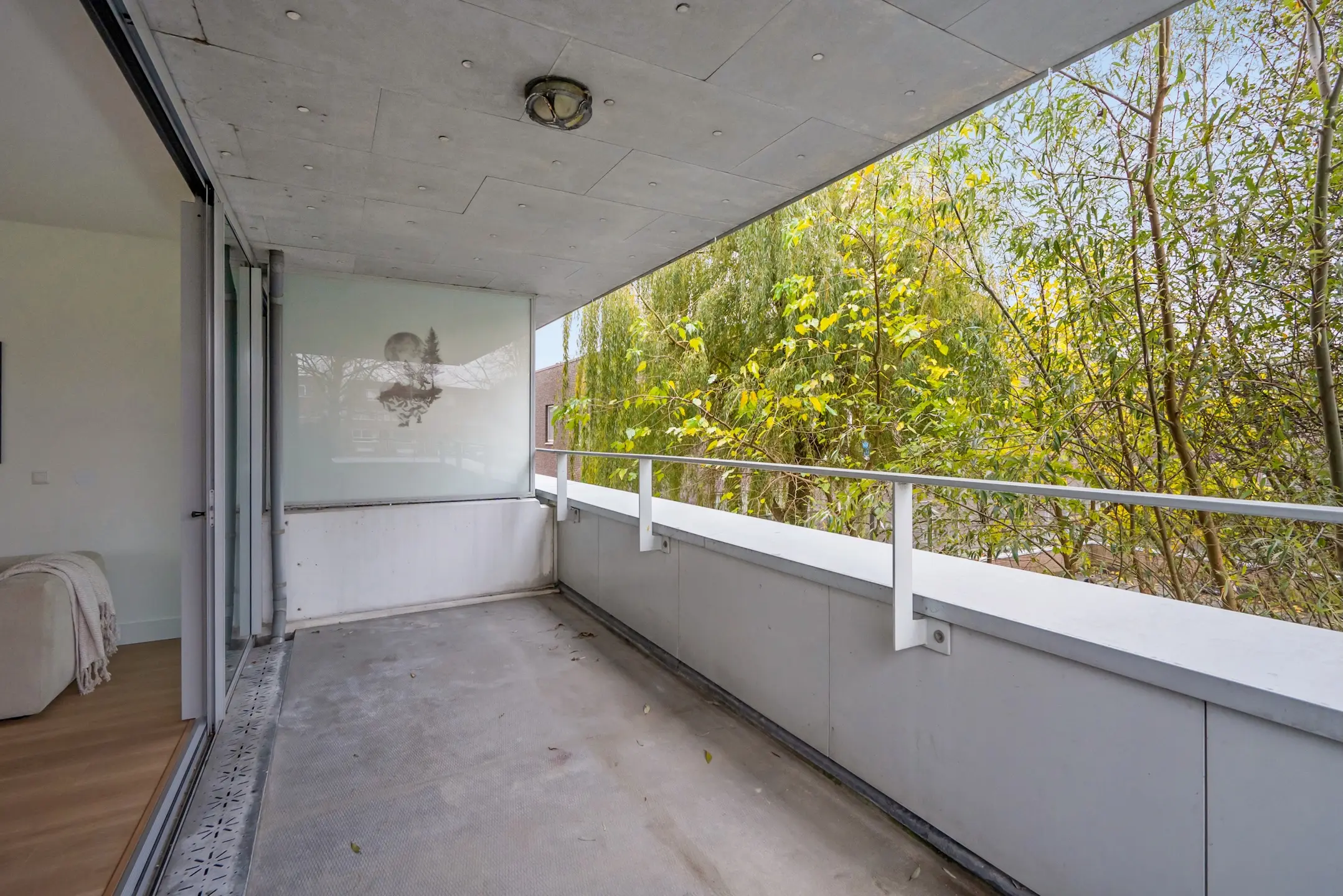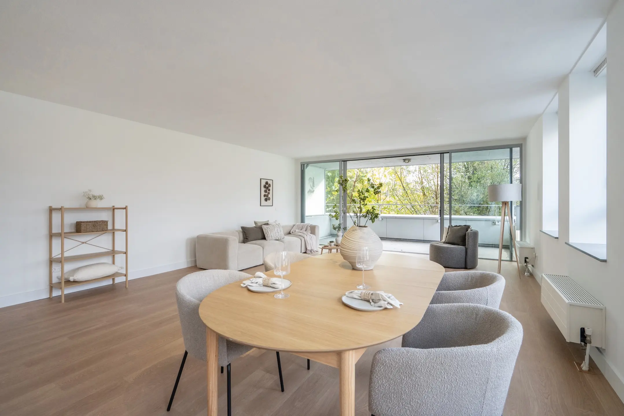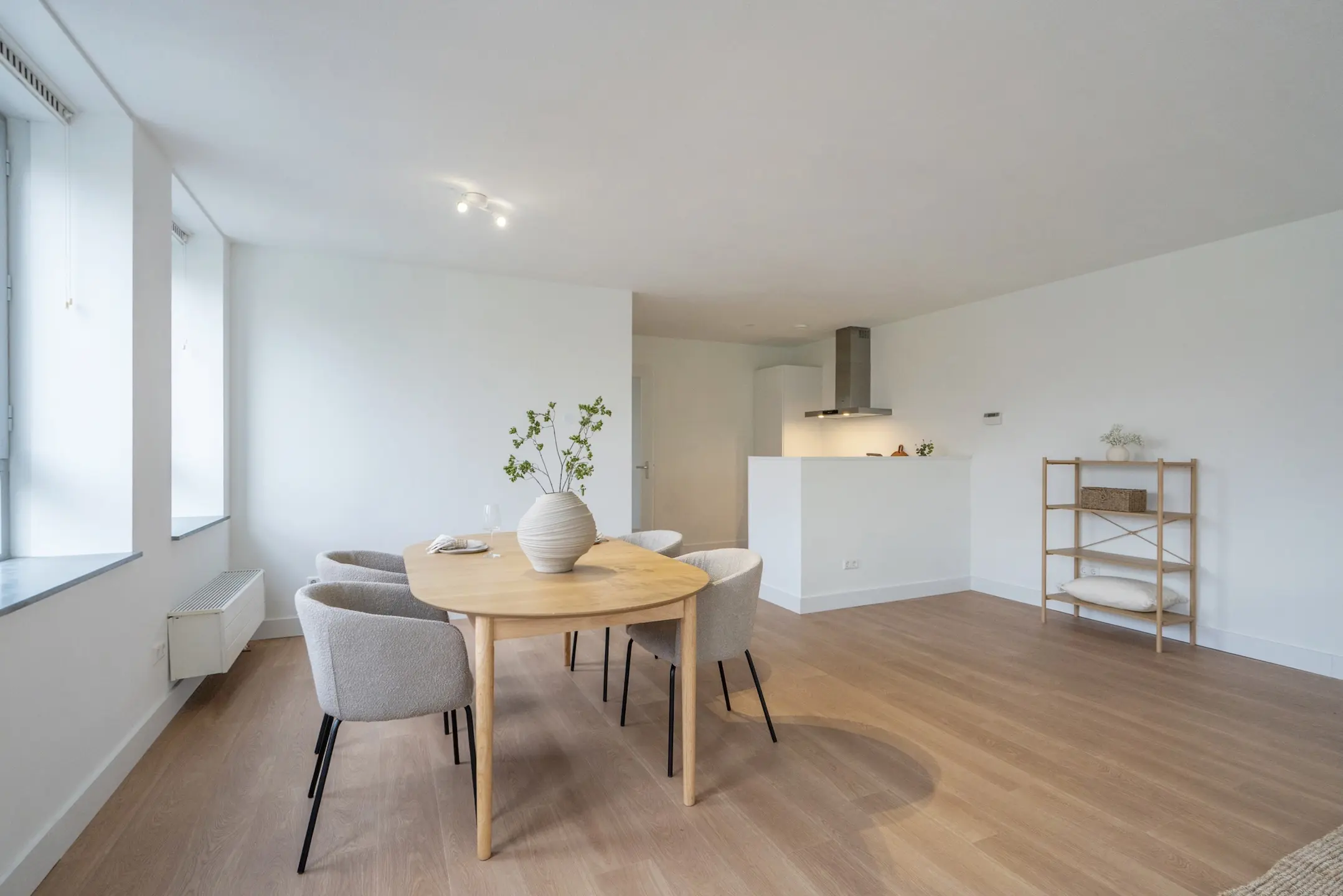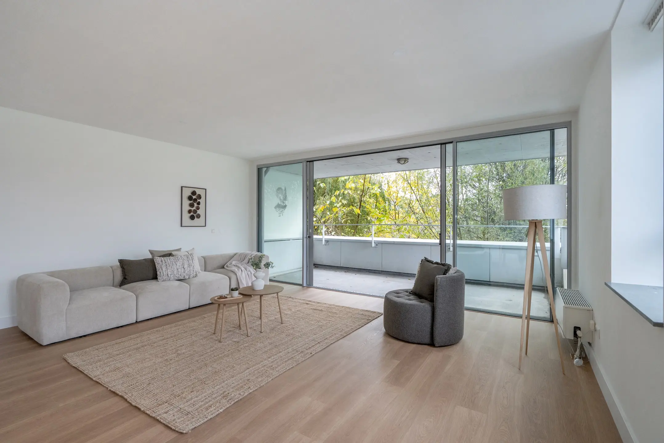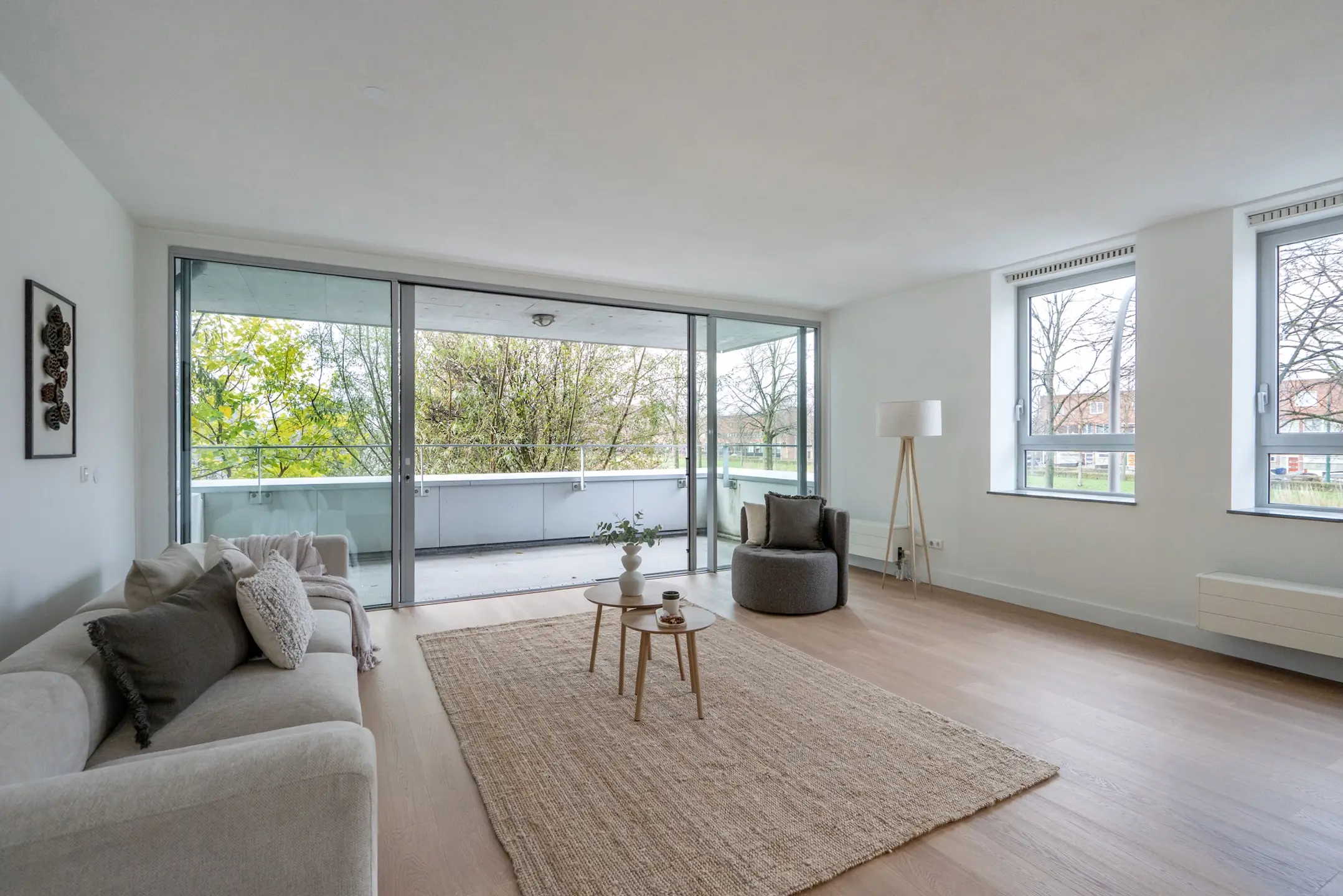De royale woon- en eetkamer vormt het hart van de woning. De fraaie laminaatvloer met hoge plinten en strak gestuukte wanden zorgen voor een moderne uitstraling. Dankzij de grote raampartijen is de woonkamer bijzonder licht en biedt deze een prettige sfeer om te ontspannen of gasten te ontvangen. Vanuit de woonkamer stapt u direct het brede, zonnige balkon op. De perfecte plek om te genieten van de buitenlucht en het vrije uitzicht.