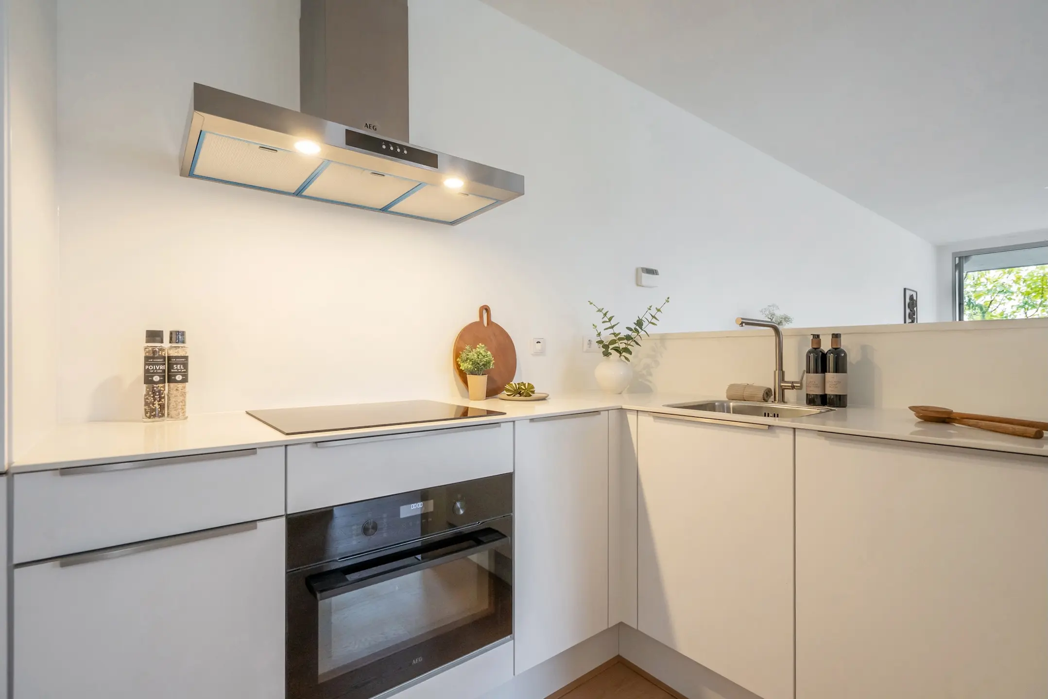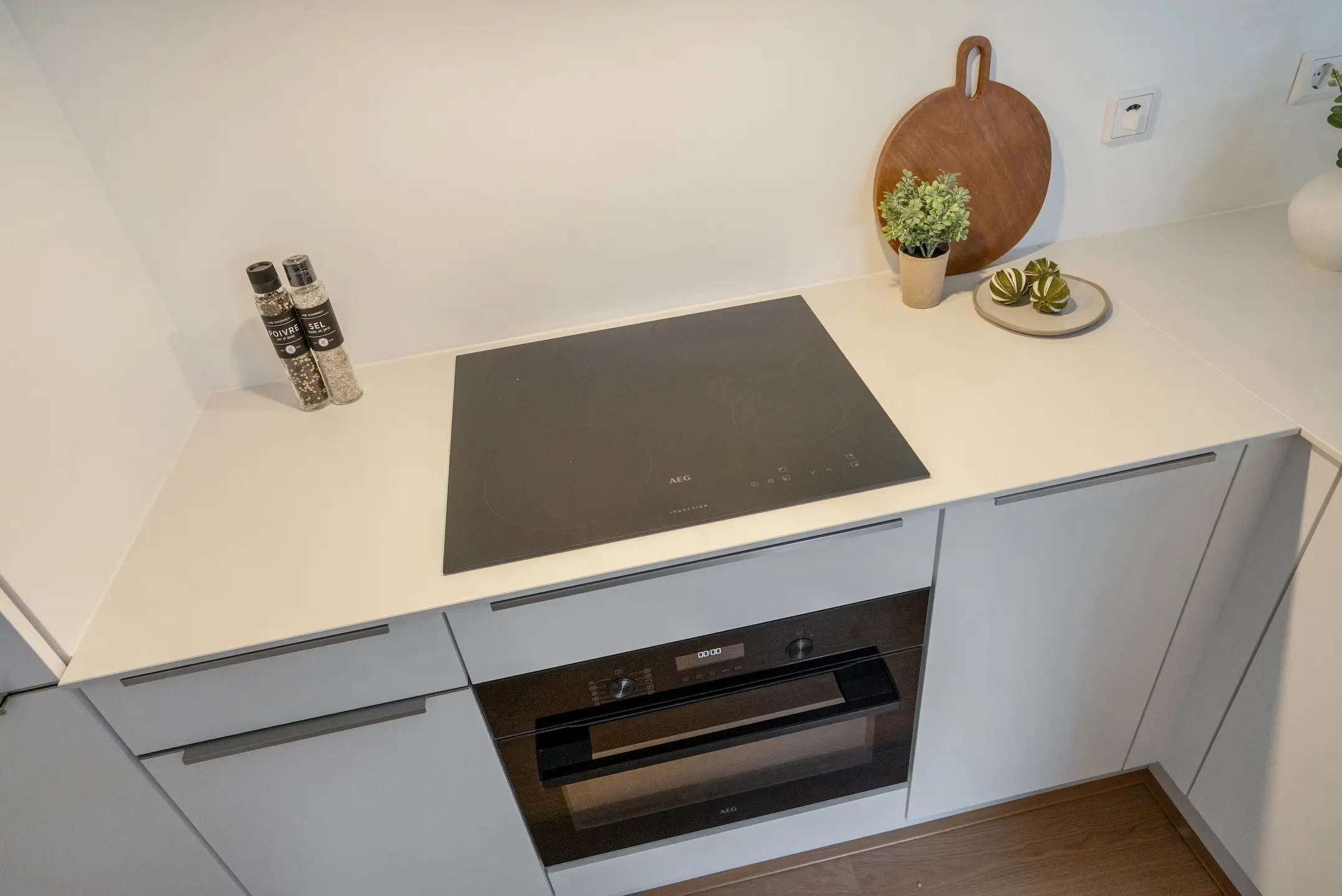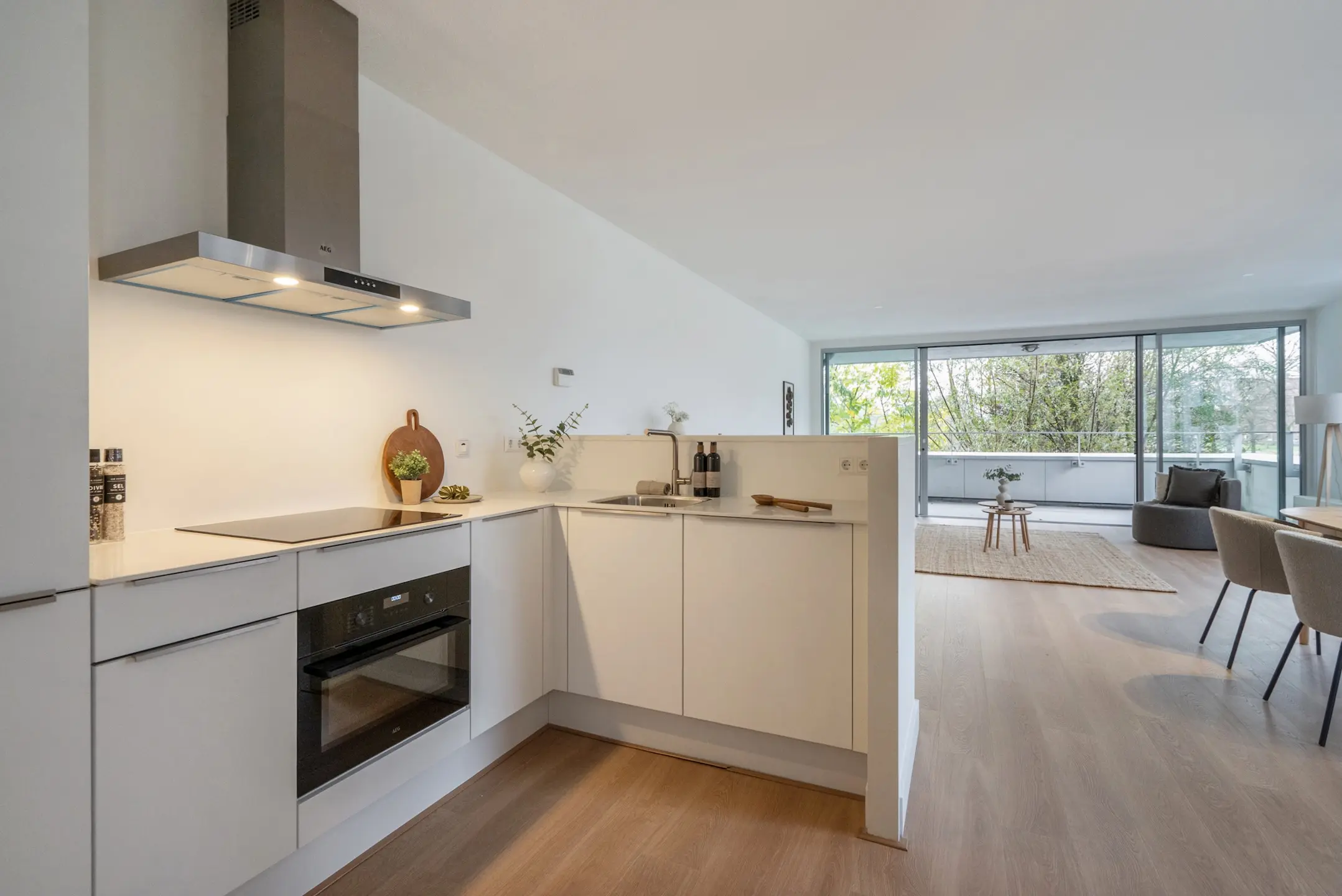 De moderne open keuken is uitgevoerd in een stijlvolle, neutrale L-opstelling met een composiet werkblad en witte matte kasten. De keuken is voorzien van hoogwaardige inbouwapparatuur, waaronder een inductiekookplaat, combi magnetron/oven, afzuigkap, koelkast, vriezer en vaatwasser – ideaal voor de kookliefhebber.