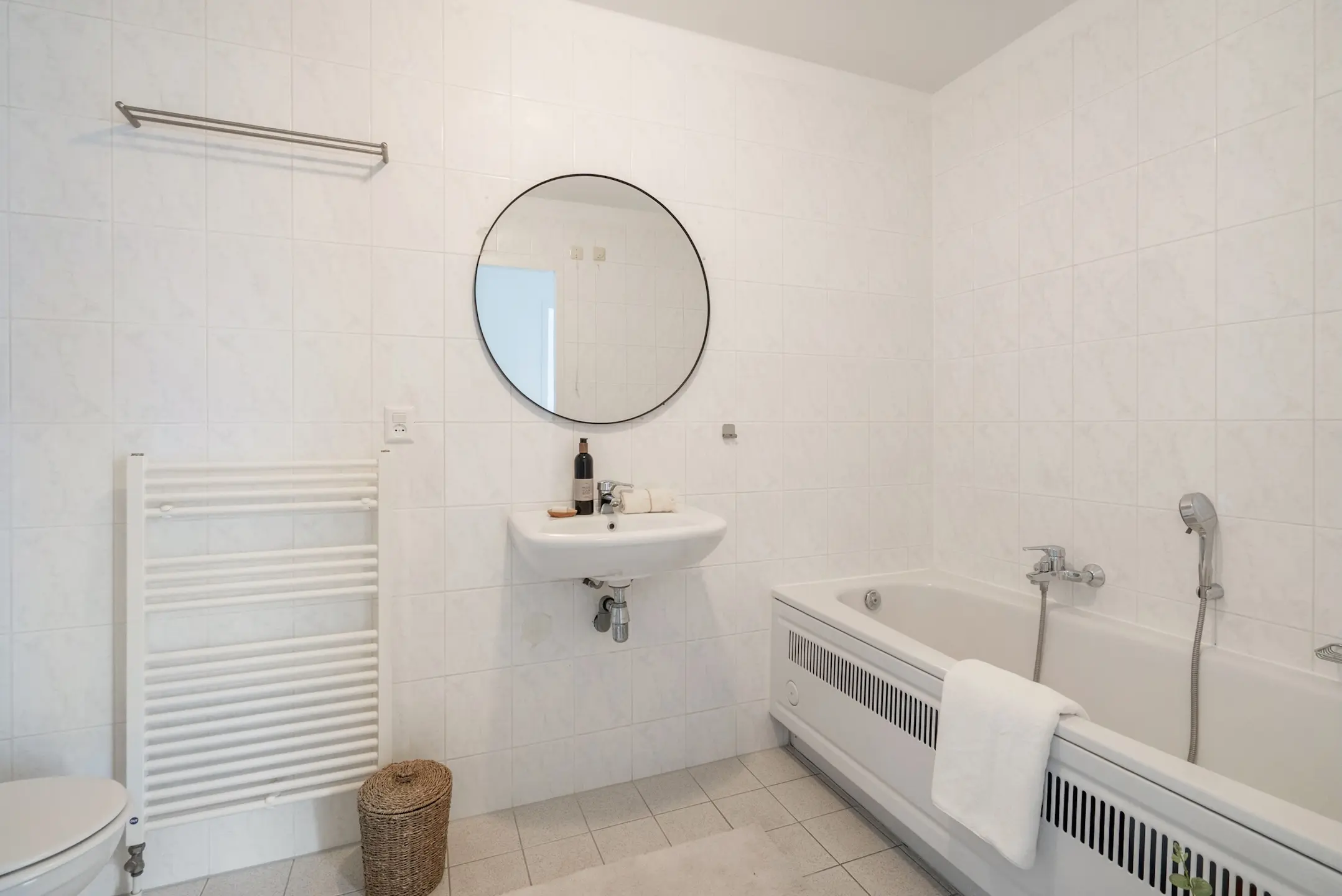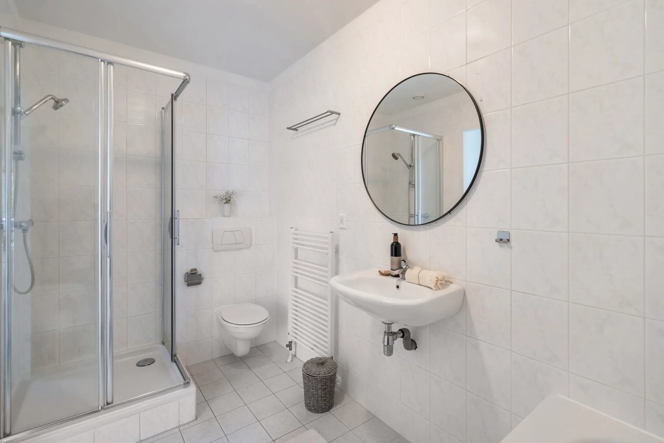 De moderne badkamer is keurig afgewerkt in neutrale tinten en voorzien van een ligbad met handdouche, een aparte douchehoek, een wastafelmeubel, designradiator en een 2e vrij hangend toilet.