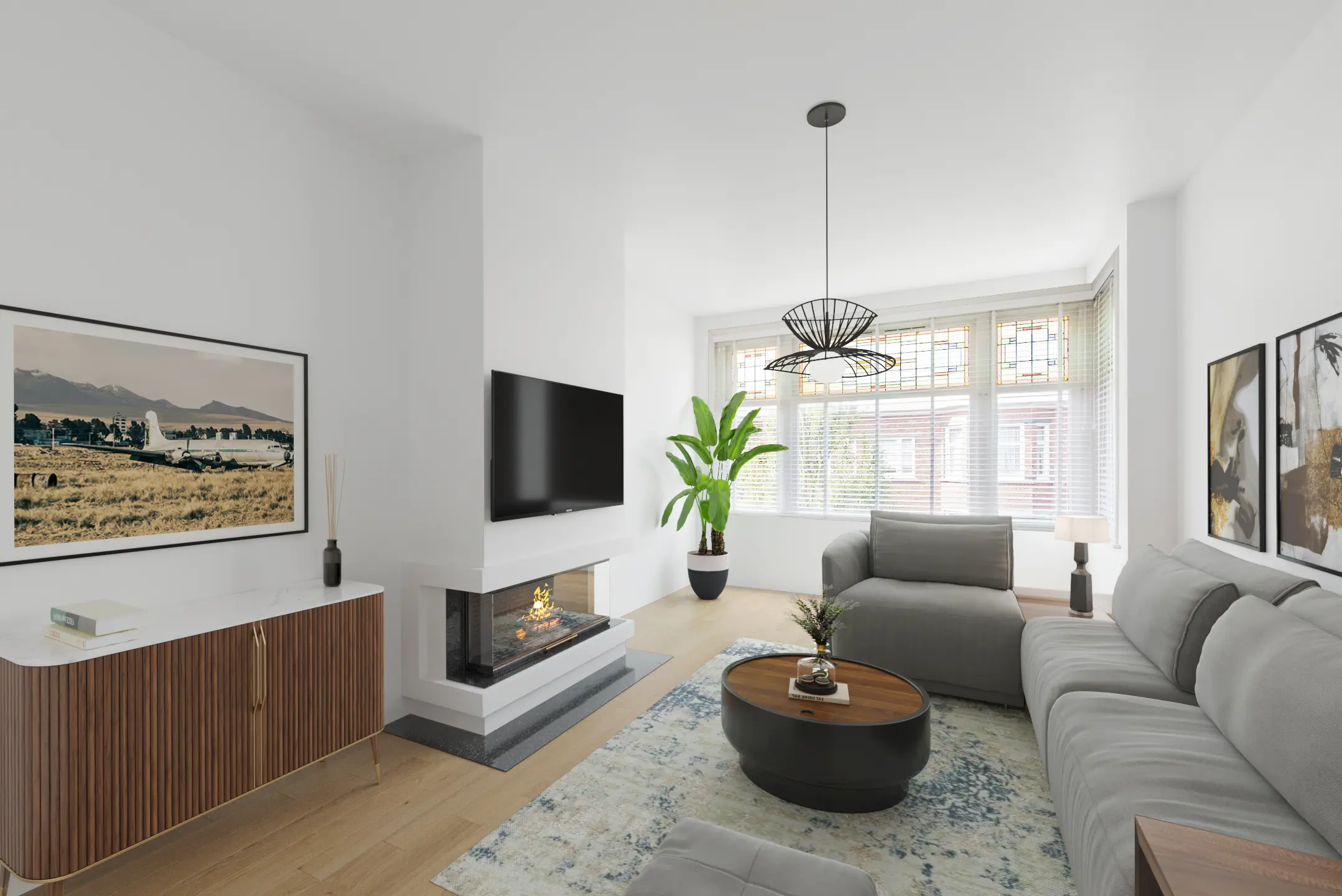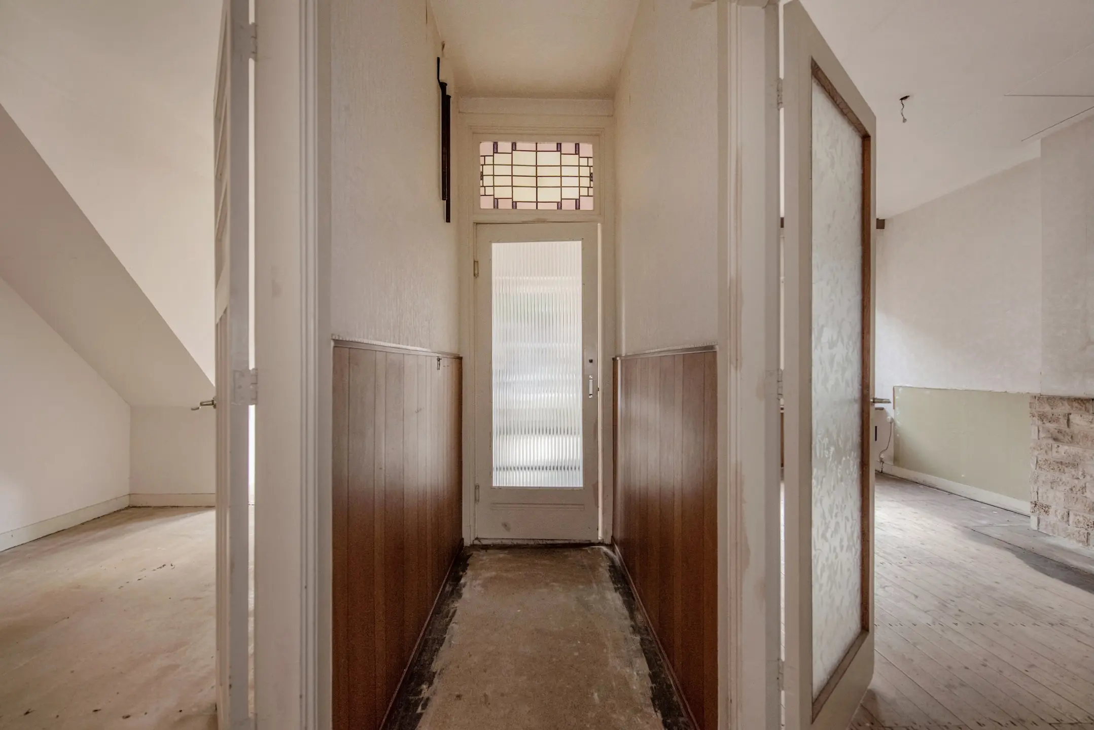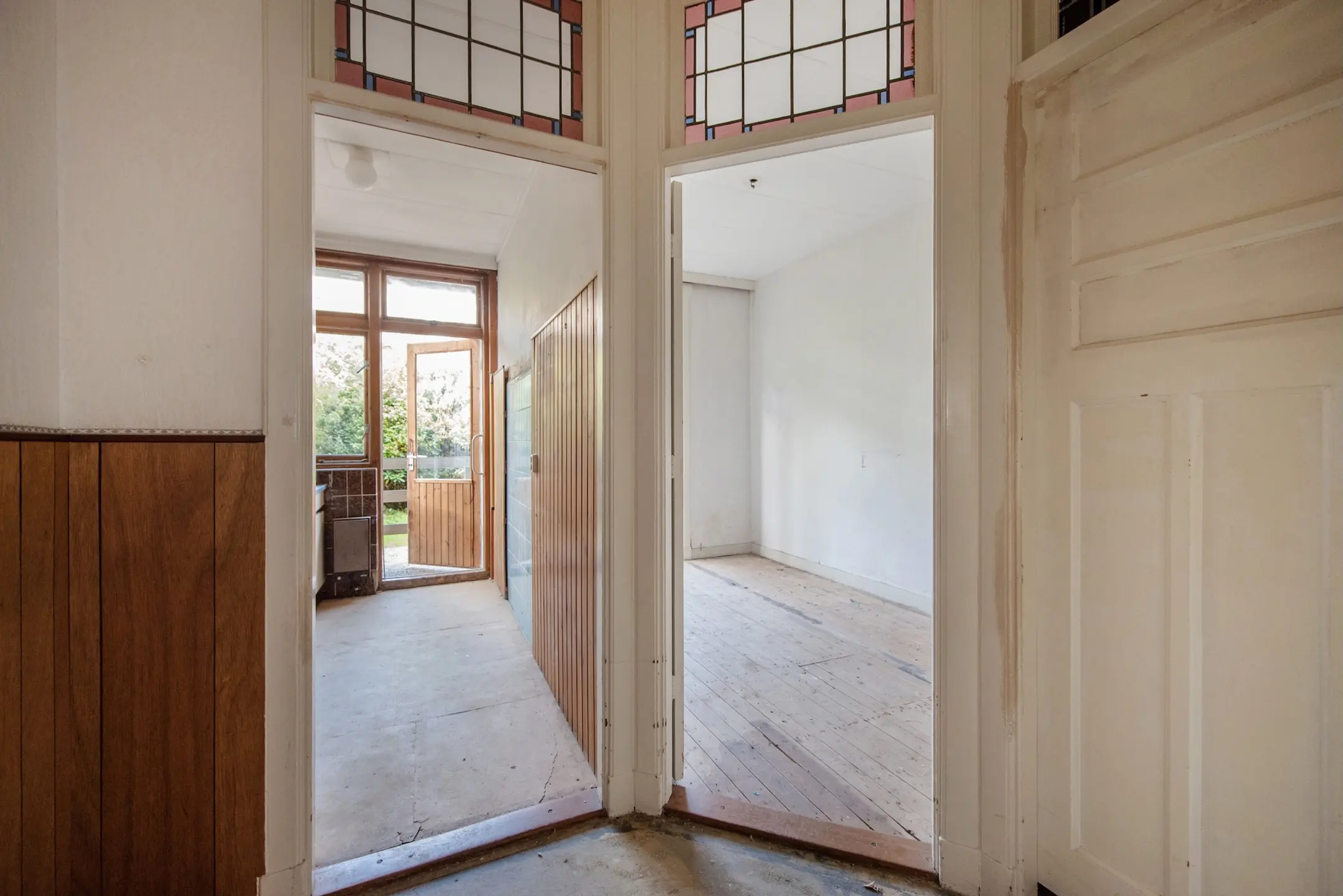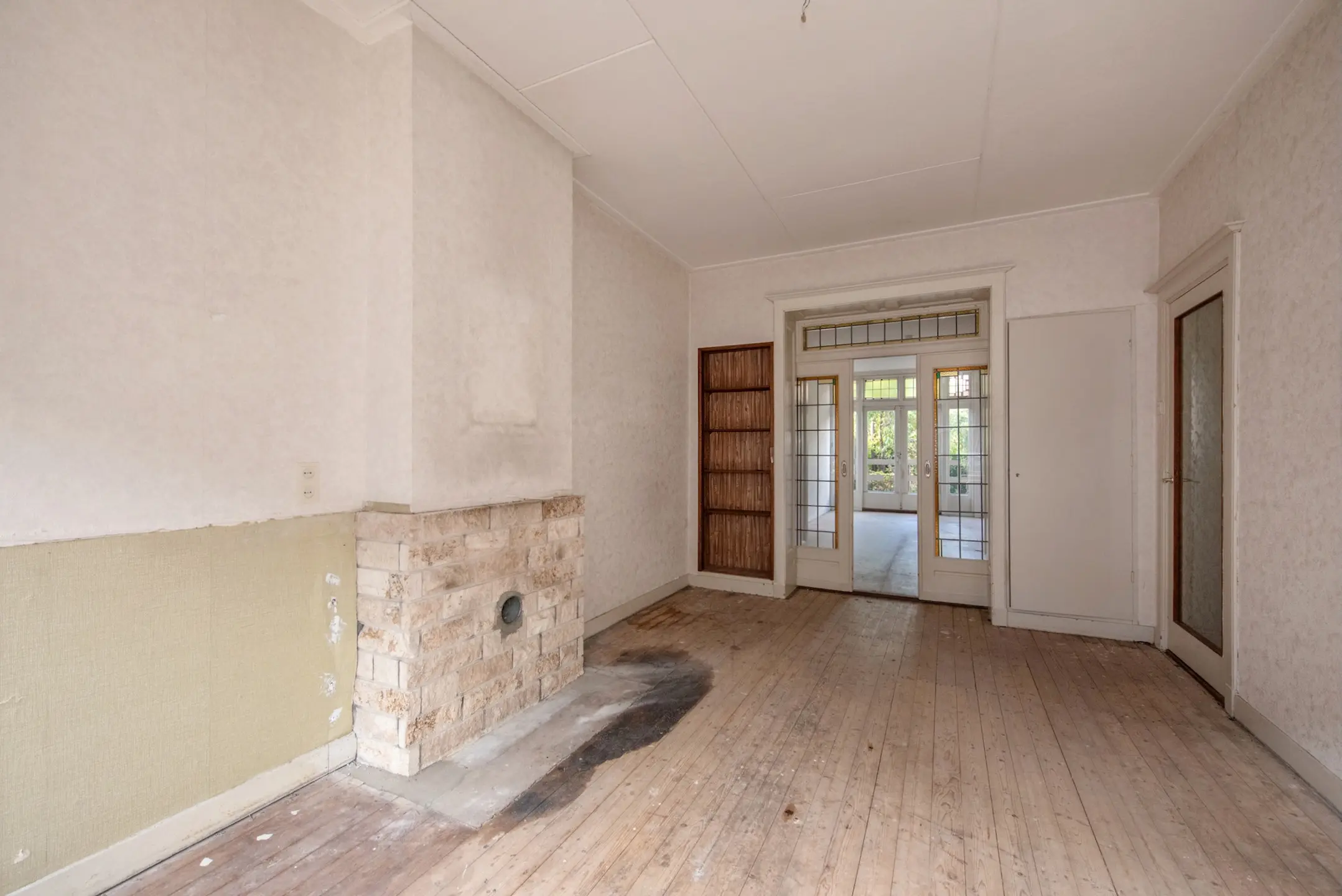 Via de eigen entree bereikt u de ruime hal met toegang tot alle vertrekken. De woonkamer en suite is licht en ruim, met aan de voorzijde een zitkamer en aan de achterzijde een eetkamer met deuren naar de tuin. De oorspronkelijke ensuite-indeling met schuifdeuren en vaste kasten geeft het geheel een karakteristieke uitstraling, terwijl de grote raampartijen zorgen voor een fijne lichtinval.