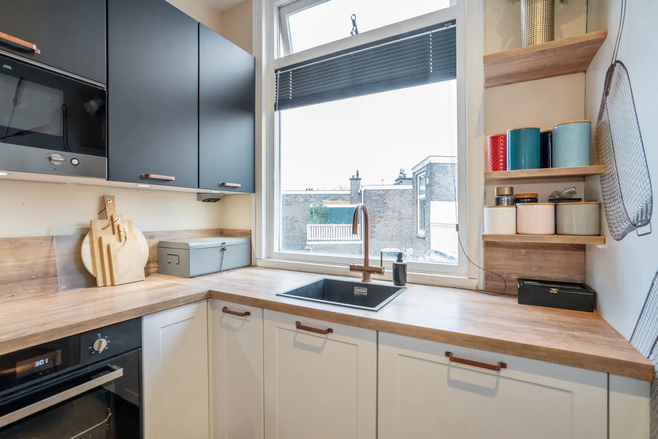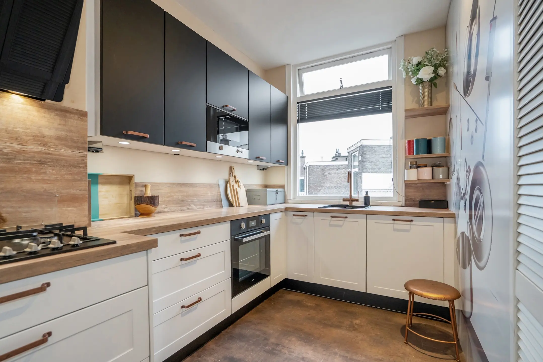 Aan de achterzijde ligt de ruime keuken, in 2019 vernieuwd en praktisch ingedeeld met volop bergruimte. De keuken is voorzien van een oven, magnetron, 4-pits gasfornuis met afzuigkap, Quooker heetwaterkraan en een vaatwasser. Daarnaast is er een royale vaste kast met aansluiting voor de wasmachine en de opstelplaats van de Intergas cv-ketel (2016).