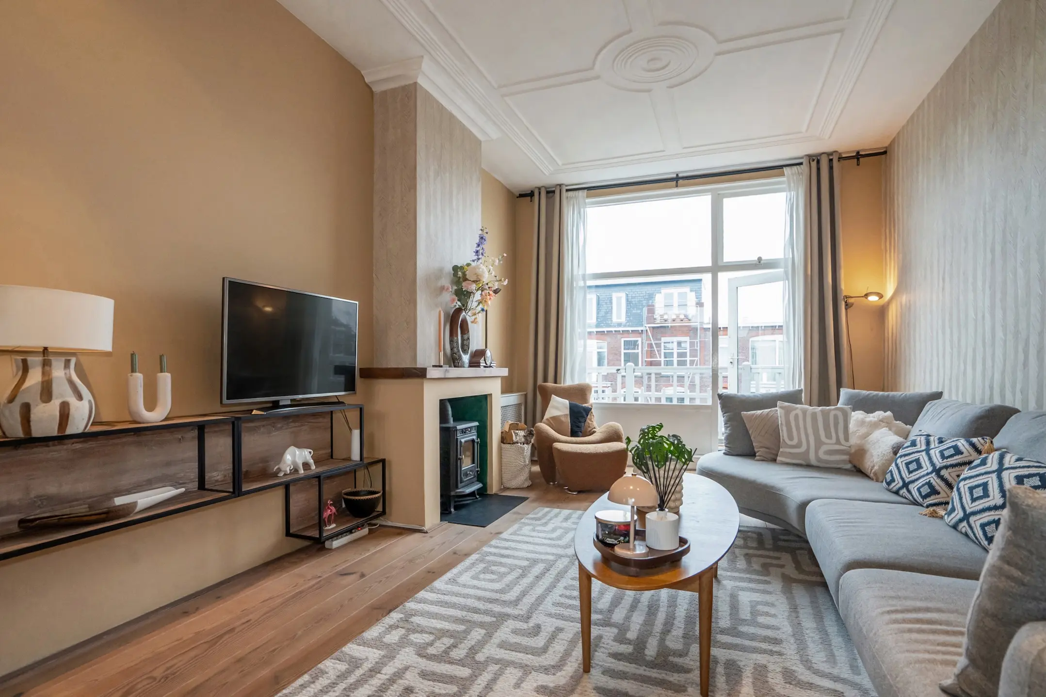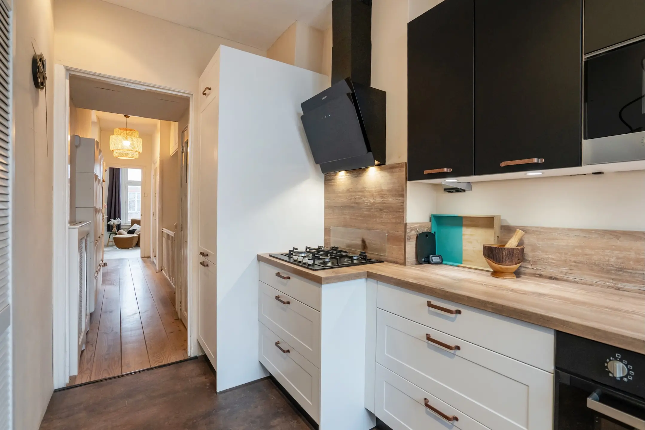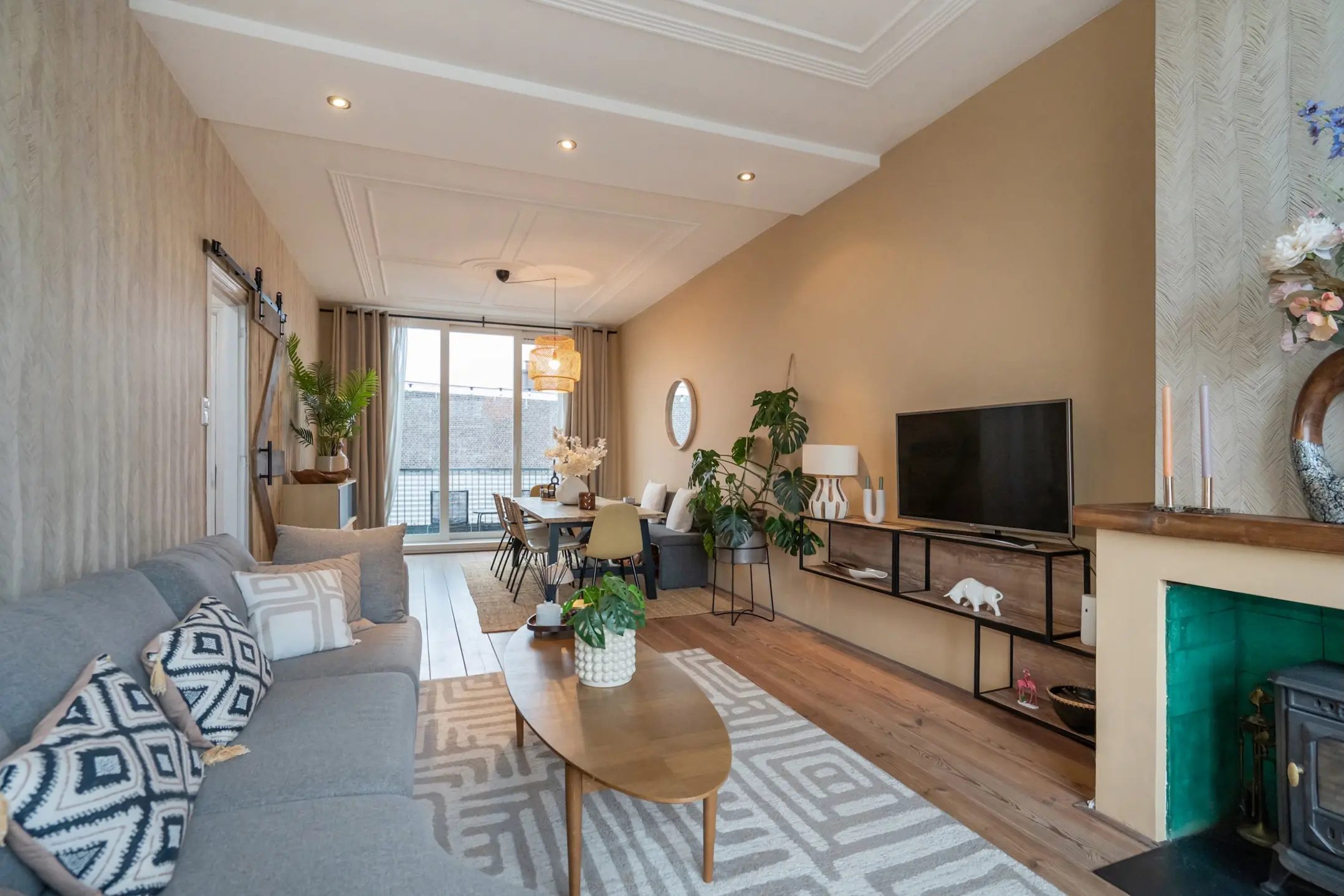 De woon-/eetkamer is zonder twijfel het kloppend hart van de woning: opvallend breed, heerlijk licht en met een prachtige open indeling dankzij de voormalige en-suite. Aan de voorzijde bevindt zich de gezellige zithoek met sfeervolle houtkachel en een deur naar het balkon op het oosten – een heerlijke plek voor de eerste koffie in de ochtendzon.