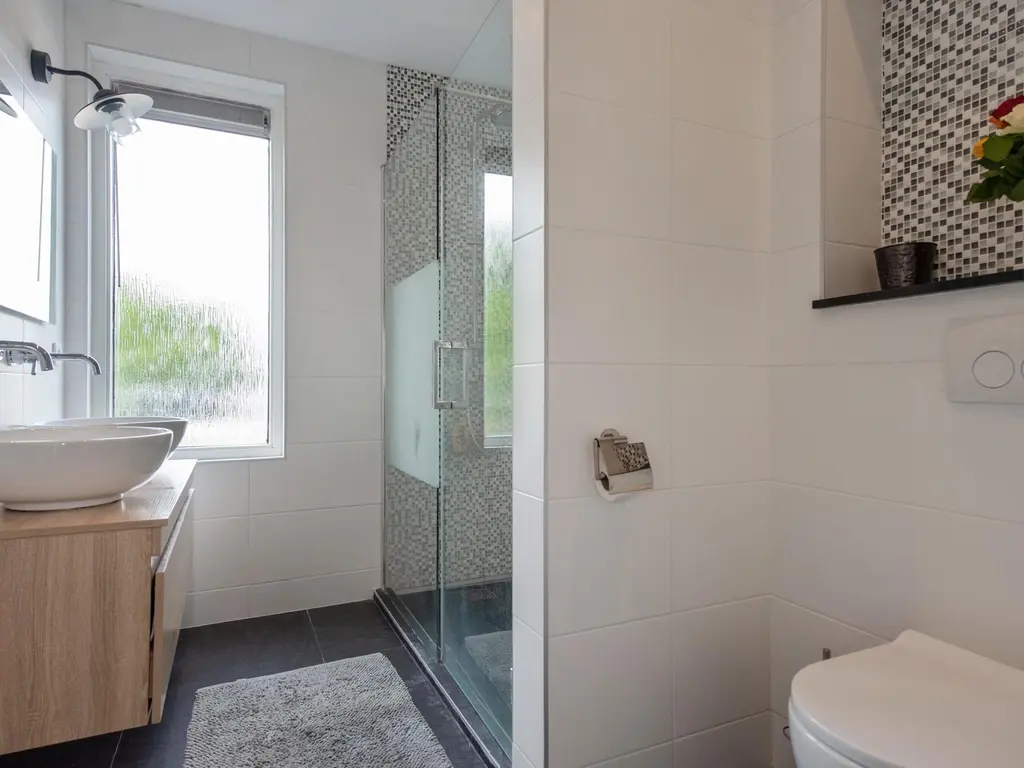 Afm. slaapkamers ca. 4.20x4.00 en 4.20x3.85. Modern uitgevoerde tweede badkamer met een ligbad/douche, wastafelmeubel met twee waskommen en een 3e wandcloset. Ook in deze badkamer natuurlijk licht. Bijzonder praktisch is de ruime wasruimte/berging.