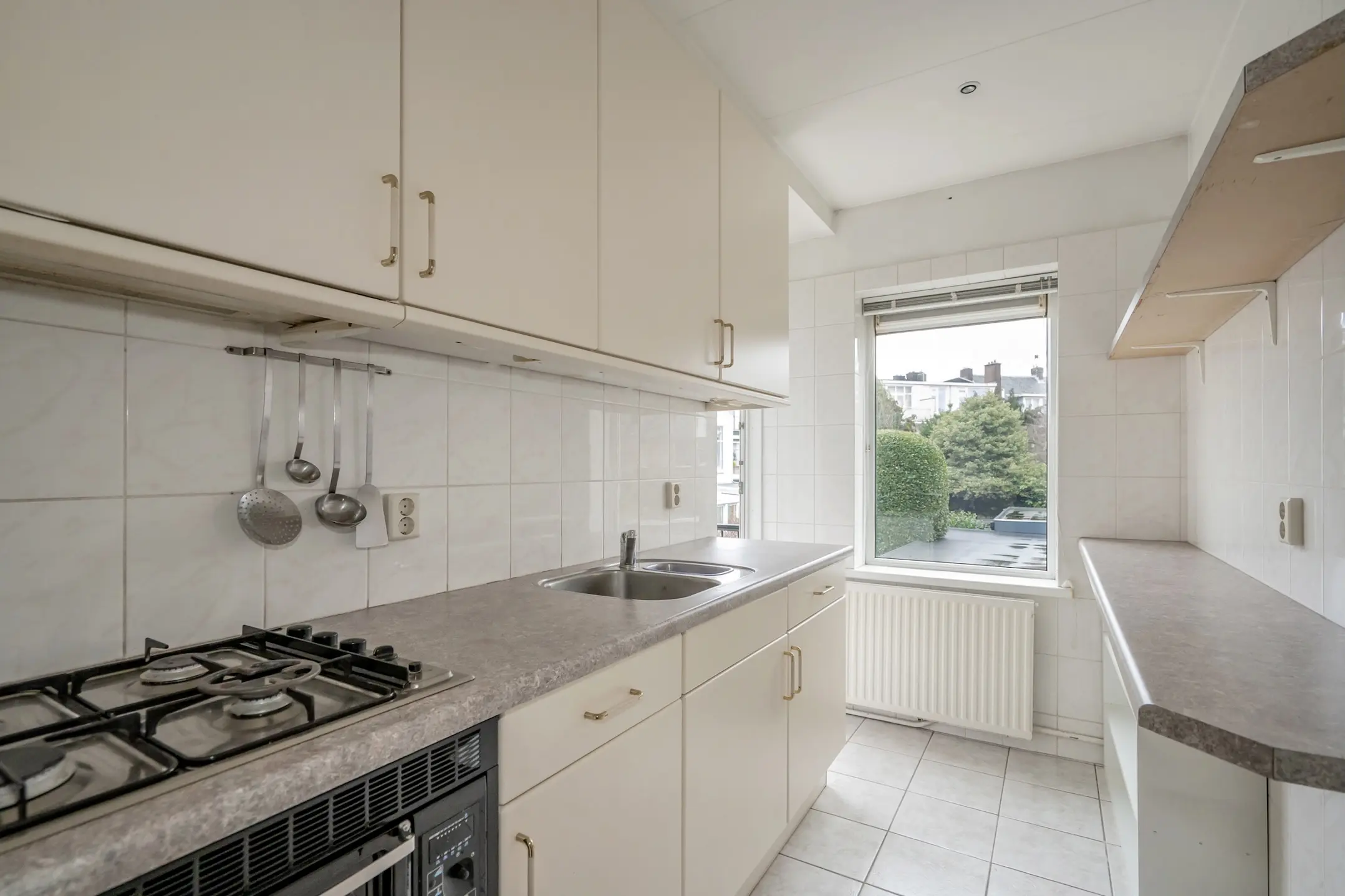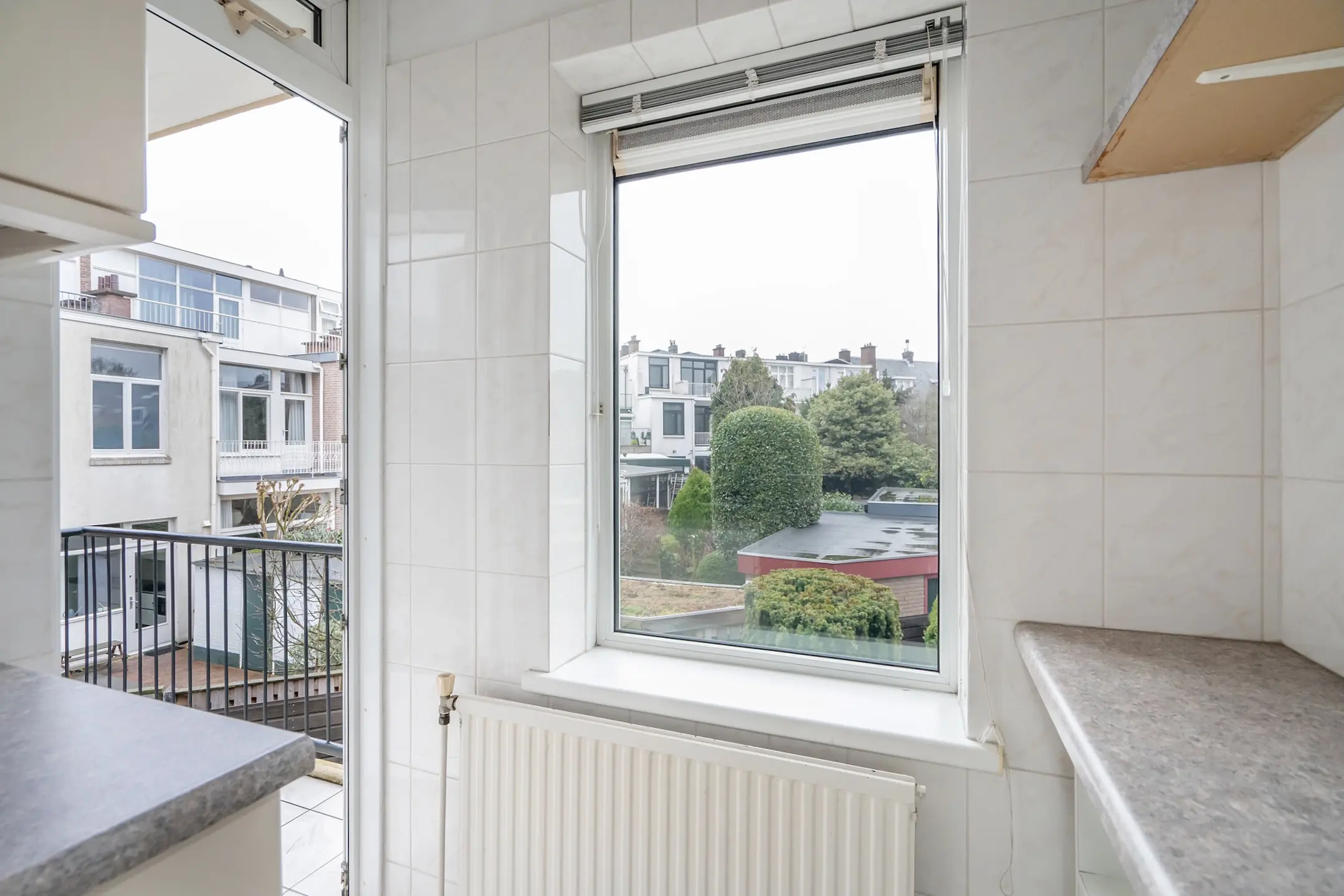 Lichtkleurige keuken met enkele apparaten. Deur naar het balkon met balkonkast.