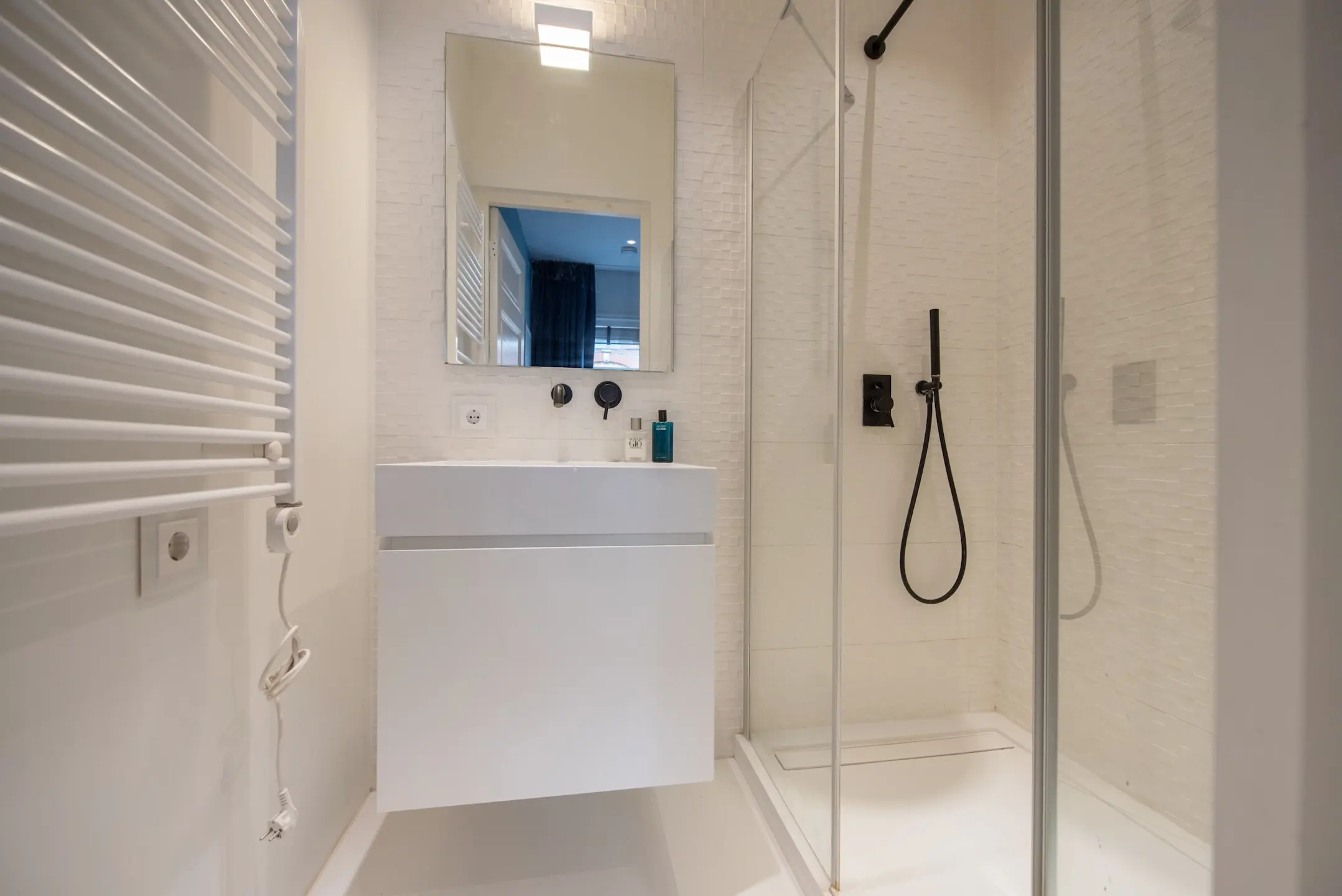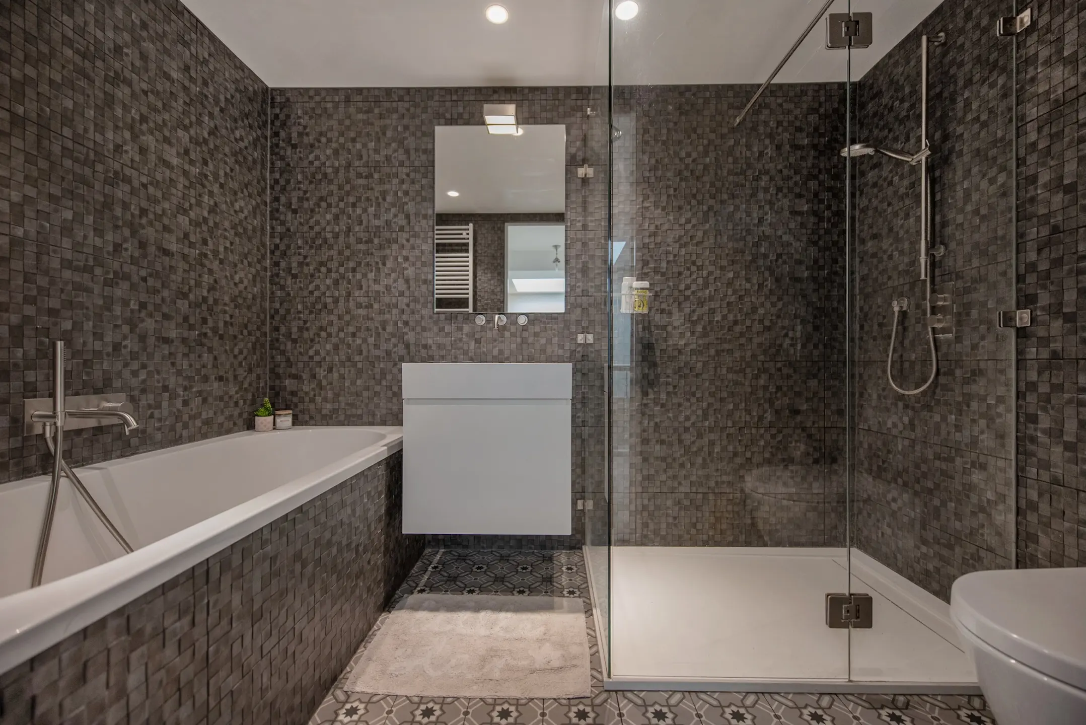 In het midden van de derde etage is de luxe badkamer met douche en apart bad en toilet. Voorzien van terazza tegels en een luxe wastafel, spiegelwand en handdoekradiator.