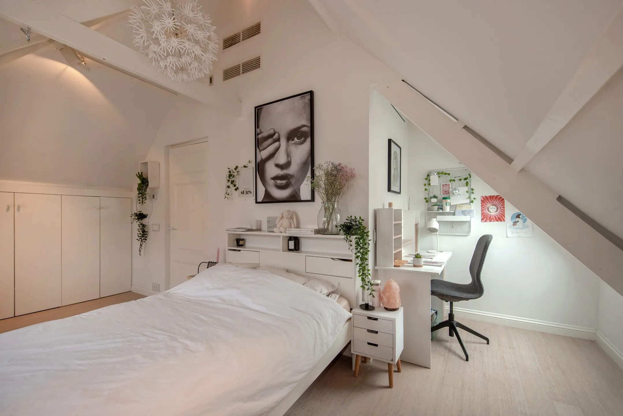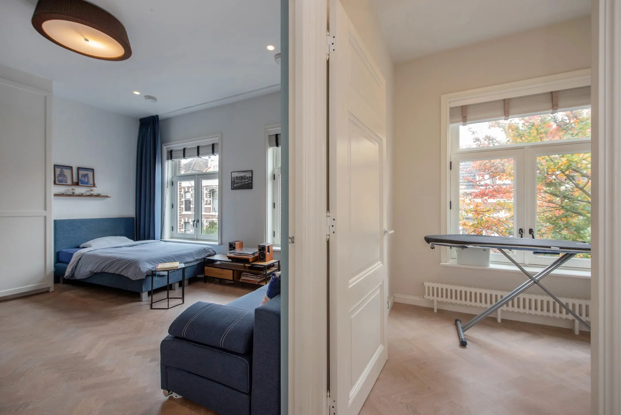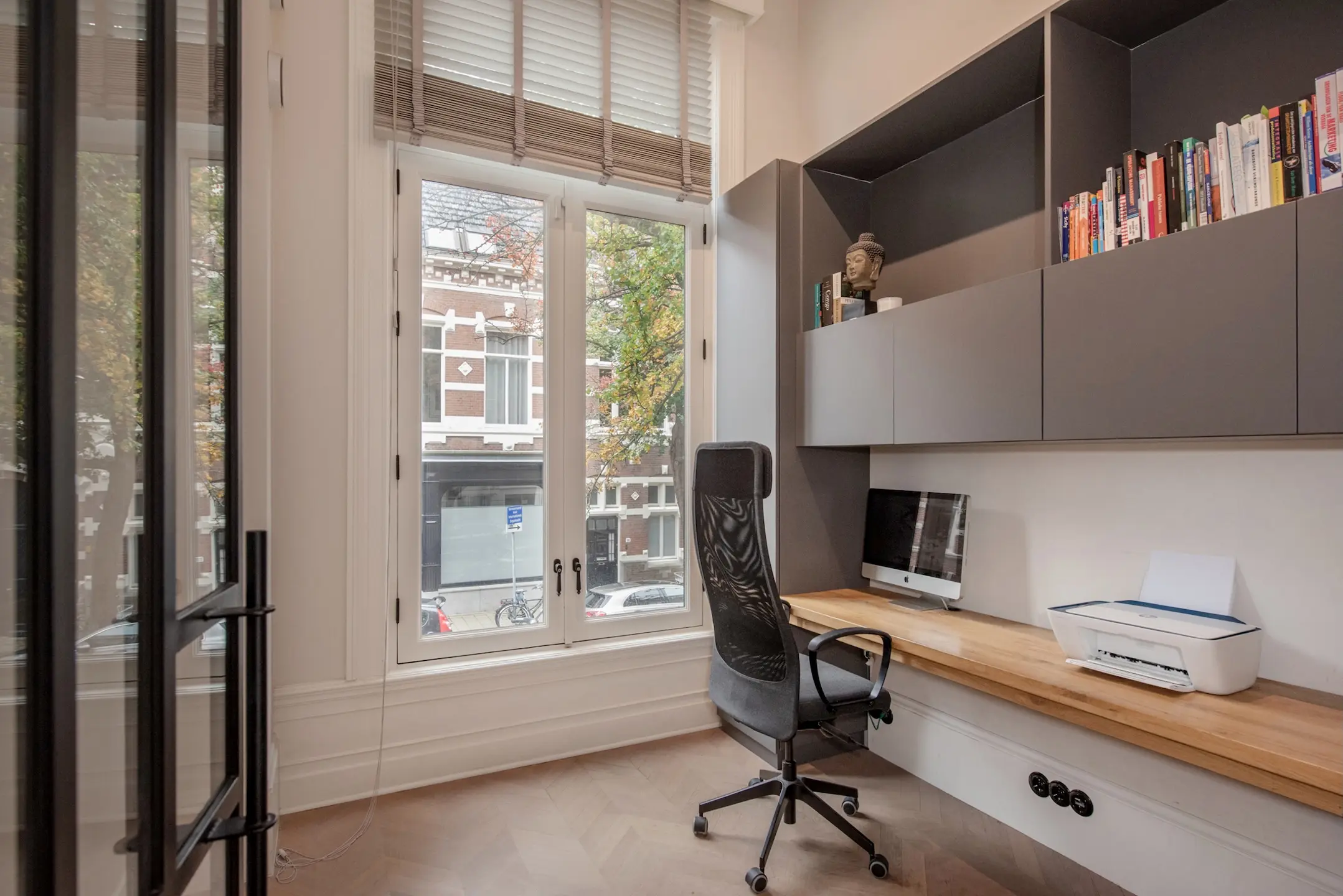 In de zijkamer bevindt zich de werkkamer, eveneens toegankelijk via een prachtig hoge stalen glazendeur. Tegen de wand is een maatwerk kastenwand met bureau gerealiseerd. Het blad is massief eikenhout. Een prettige plek, met een hoog raam en eveneens een plafondhoogte van meer dan 4 meter, om te werken. De maatwerk kasten zijn tot aan het plafond doorgetrokken en bieden een overvloed aan opbergruimte. Ook de overloop en de werkkamer zijn voorzien van een eiken visgraat parketvloer.