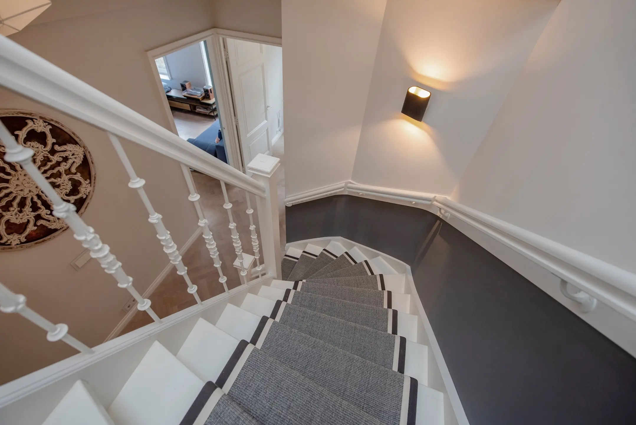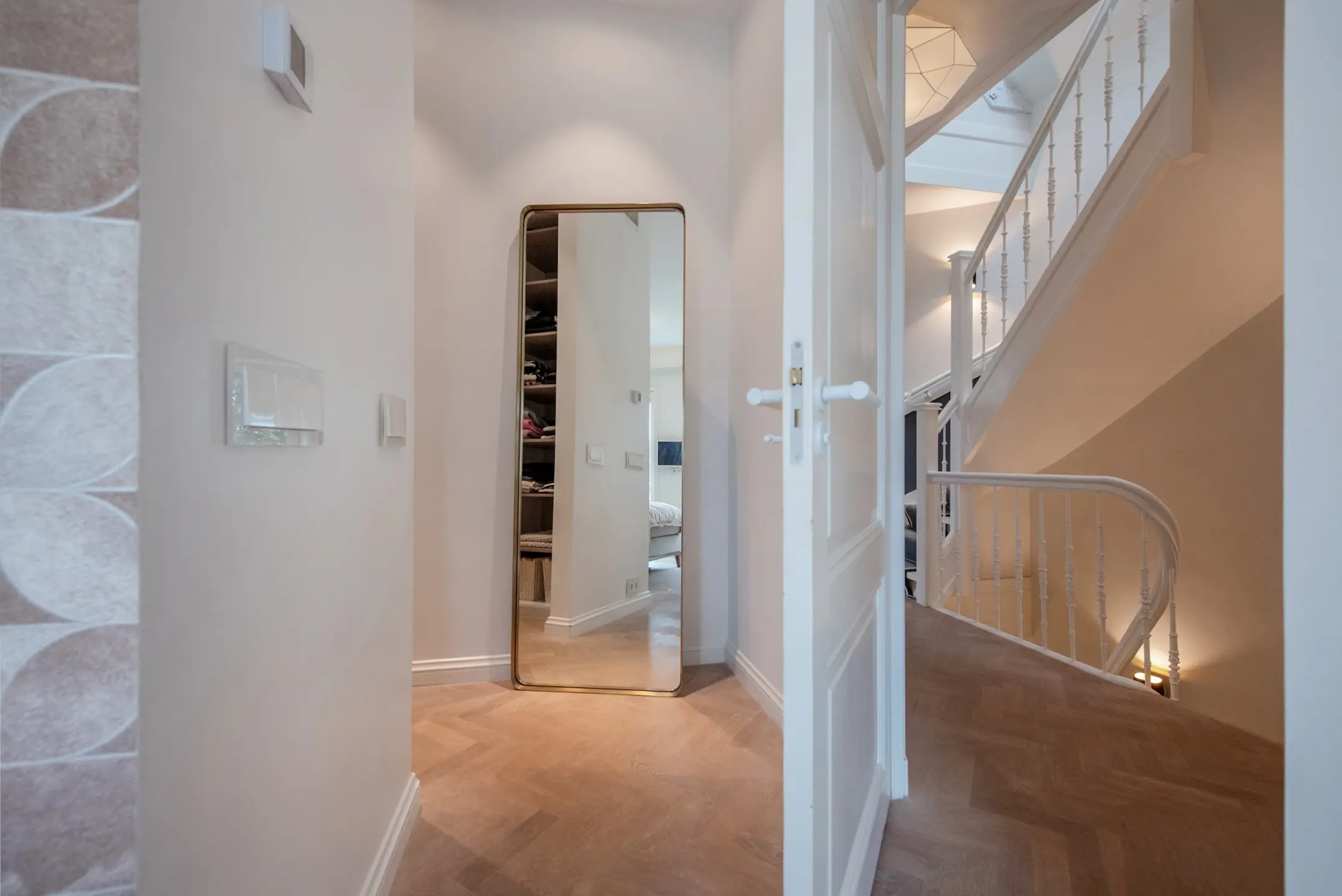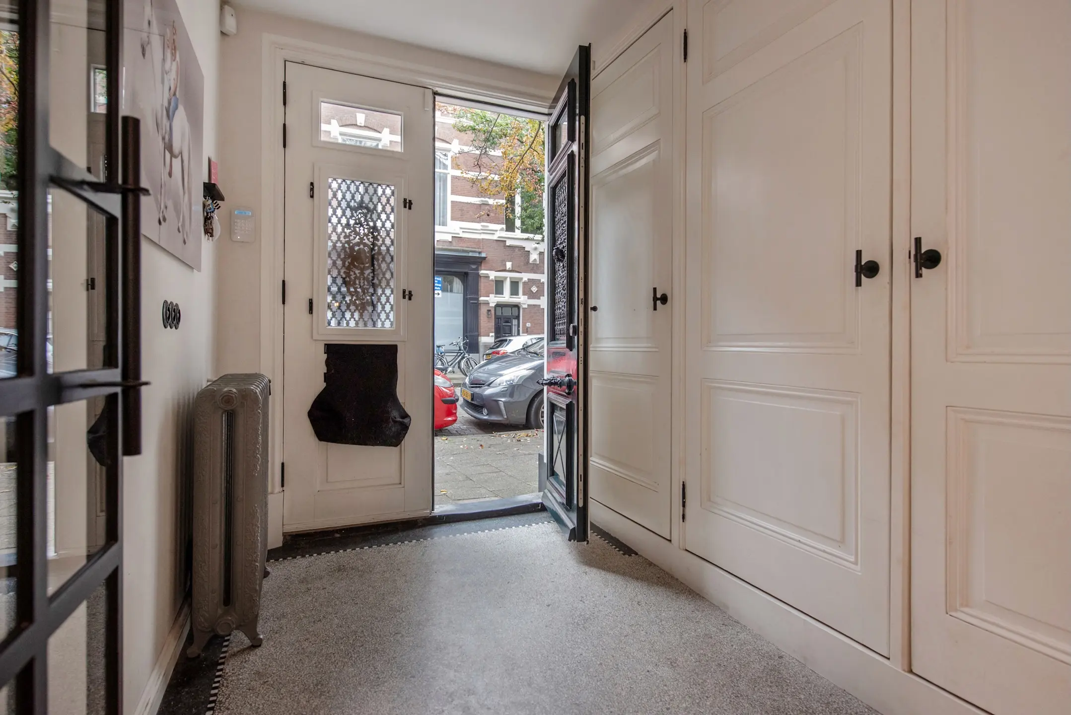 As soon as you open the original front door, you step into a spacious hall with beautiful terrazzo flooring and custom-made wardrobes. The old details with modern steel doors are immediately inviting and stylish.