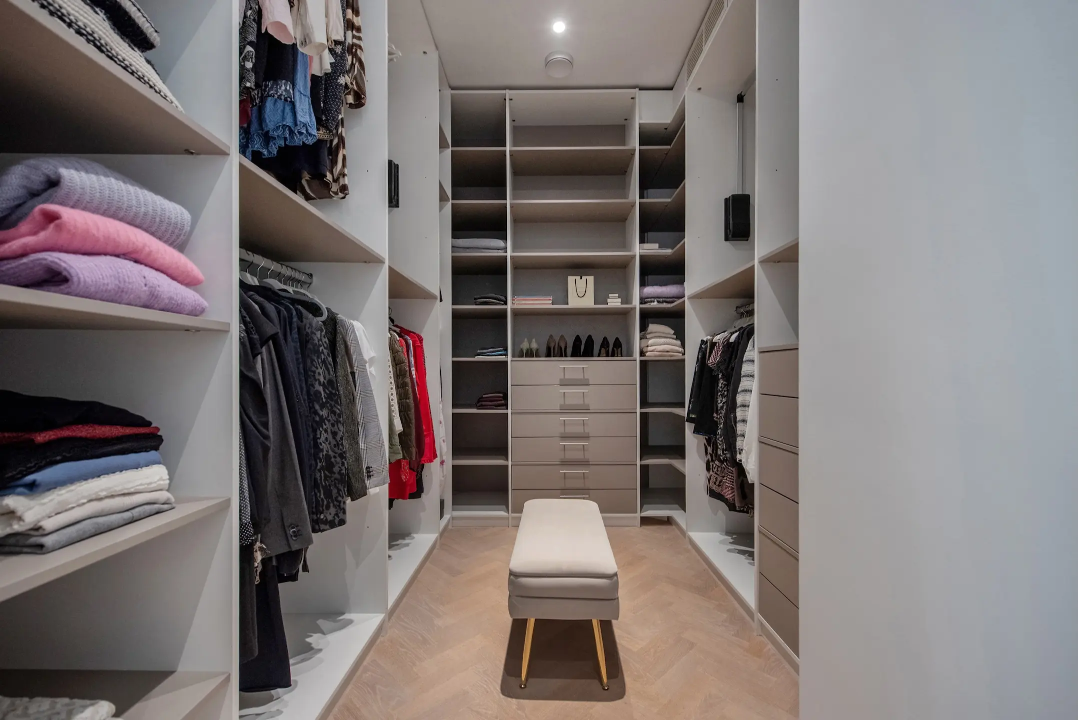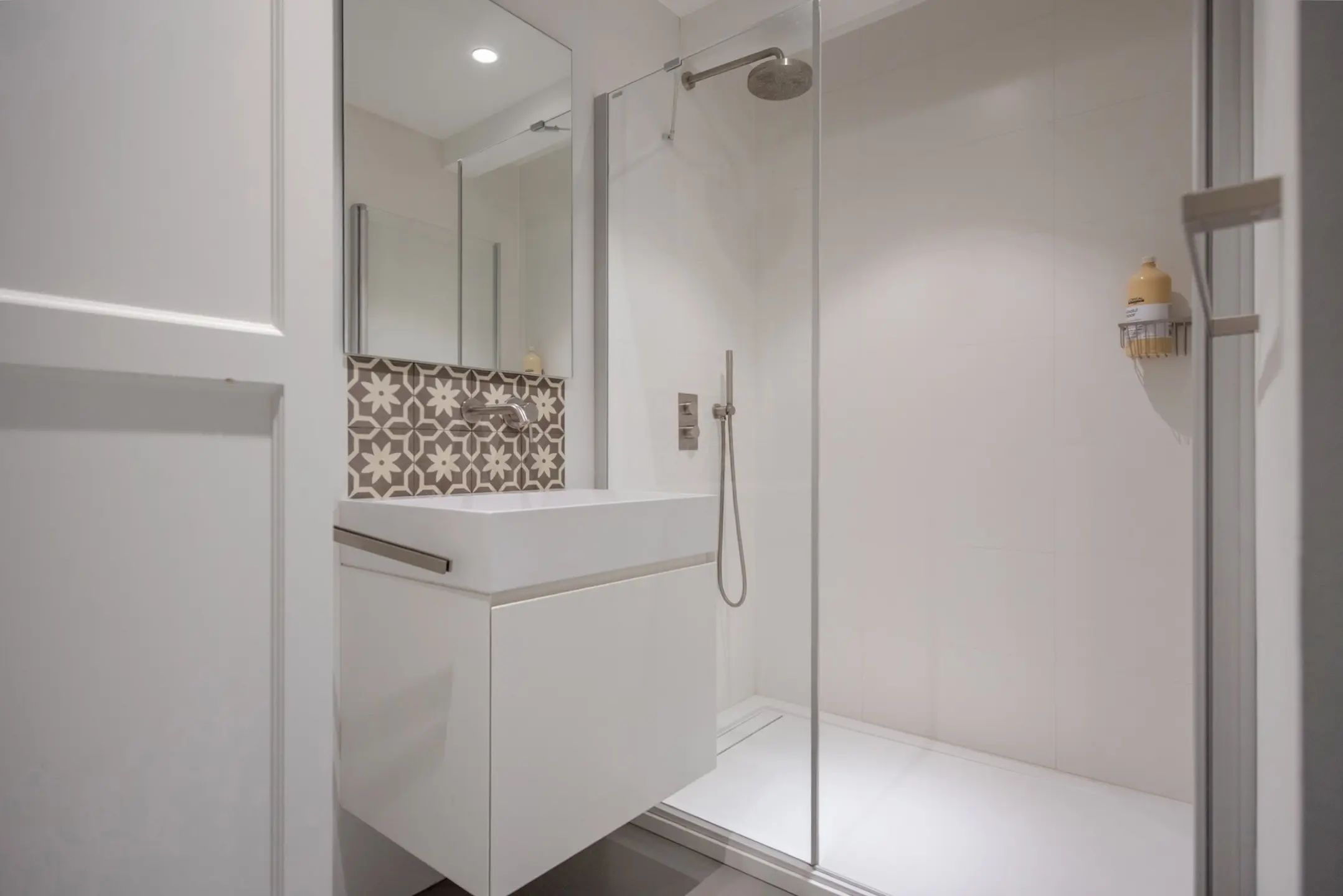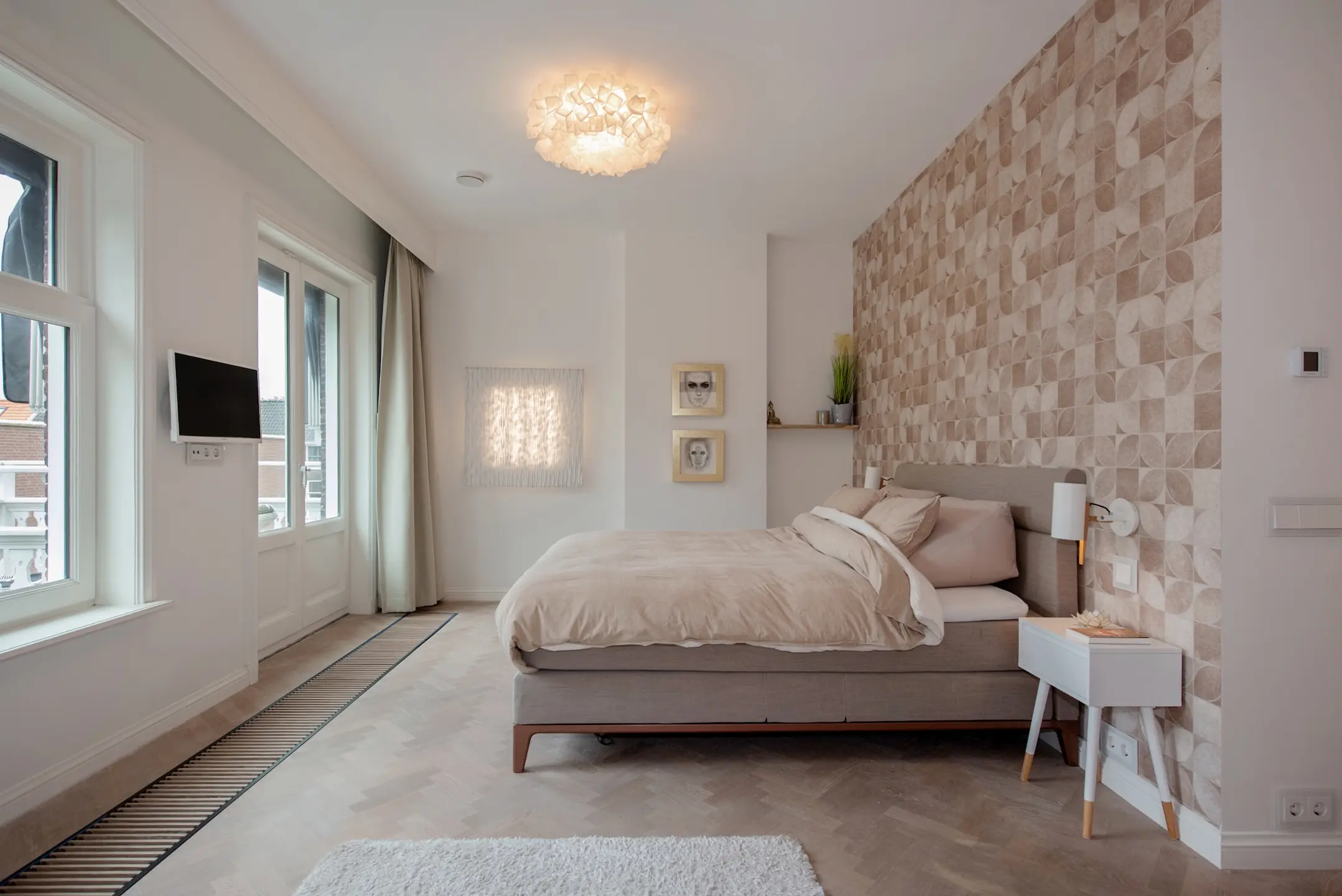 As soon as you open the original front door, you step into a spacious hall with beautiful terrazzo flooring and custom-made wardrobes. The old details with modern steel doors are immediately inviting and stylish.
