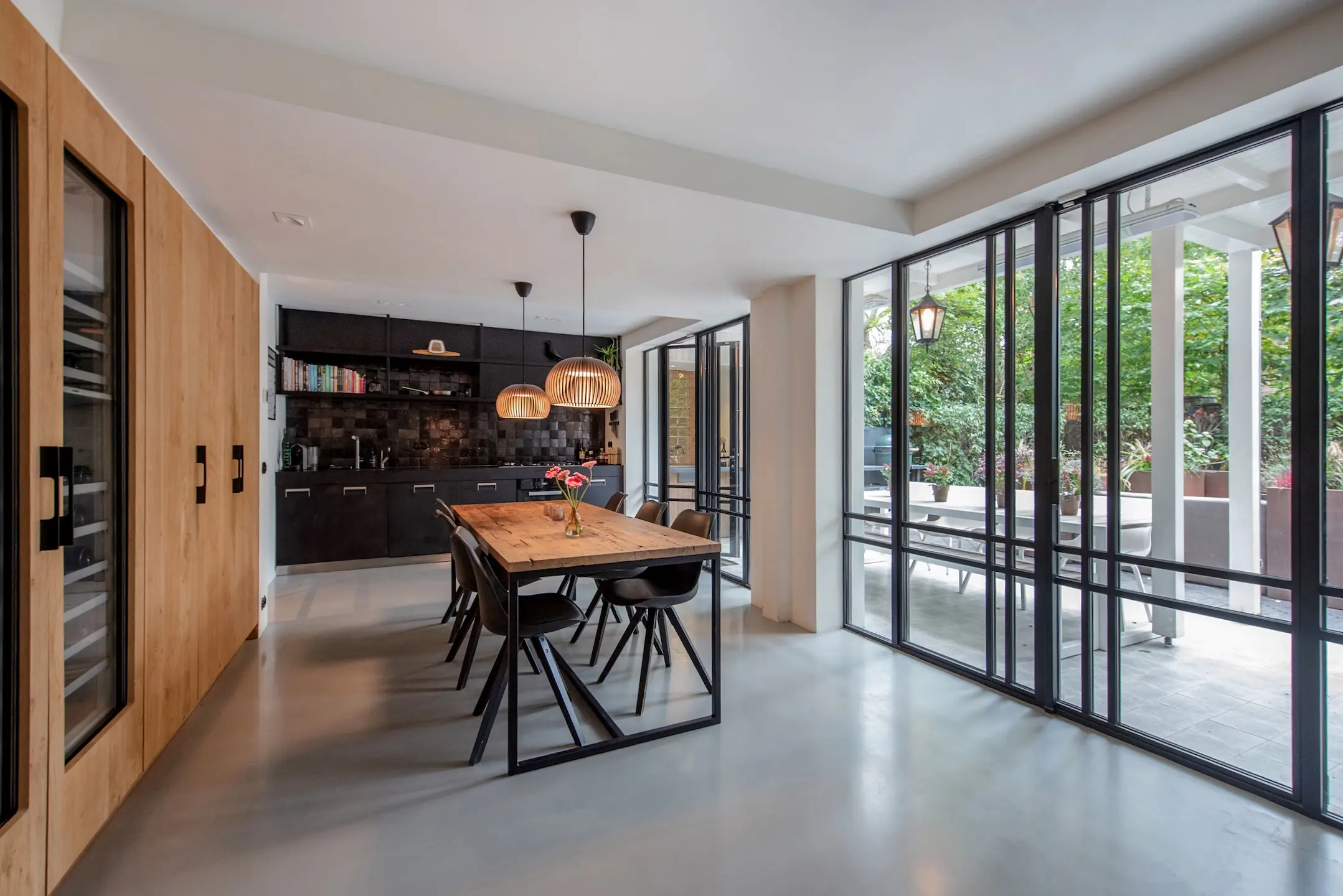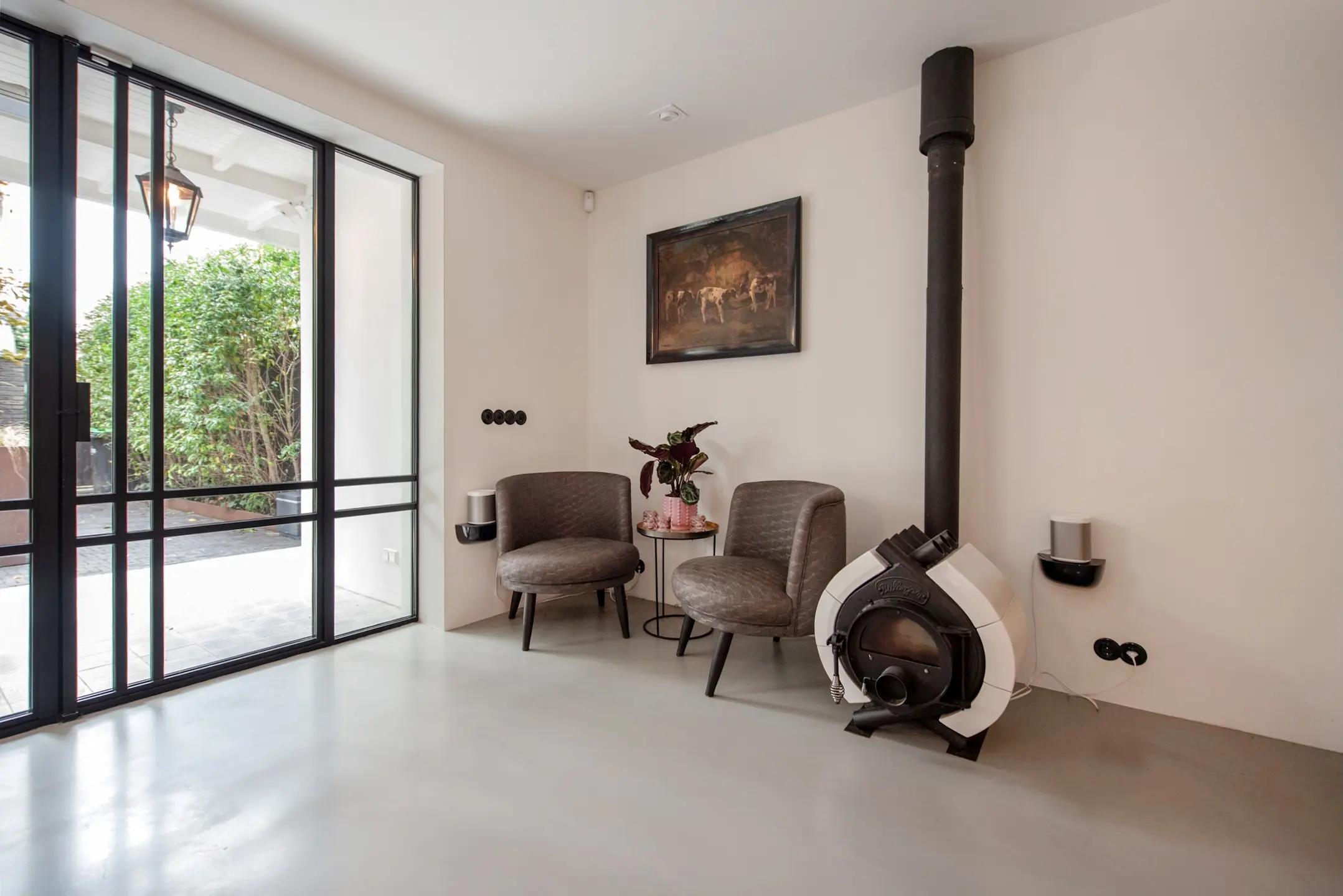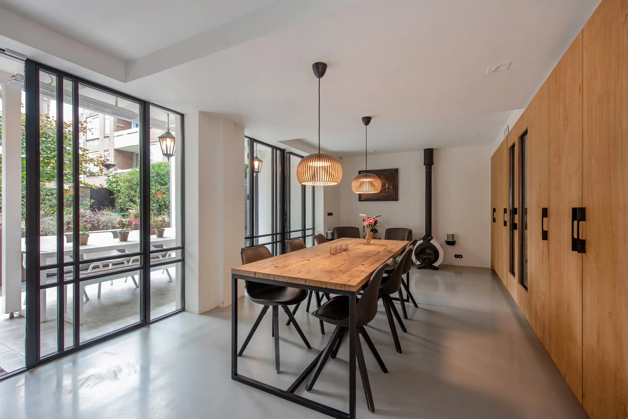 The kitchen is custom-made by Arilnea and fully equipped with Miele built-in appliances and a Quooker. The floor throughout the ground floor has underfloor heating with an epoxy cast floor. The space has a luxurious look and feel, yet is cozy thanks to the Bullerjan multi-fuel stove. The entire garden room has Tudor steel window frames with floor-to-ceiling glass, making you feel like you are outside. The doors can be opened completely to incorporate the garden terrace into the garden room in the summer.