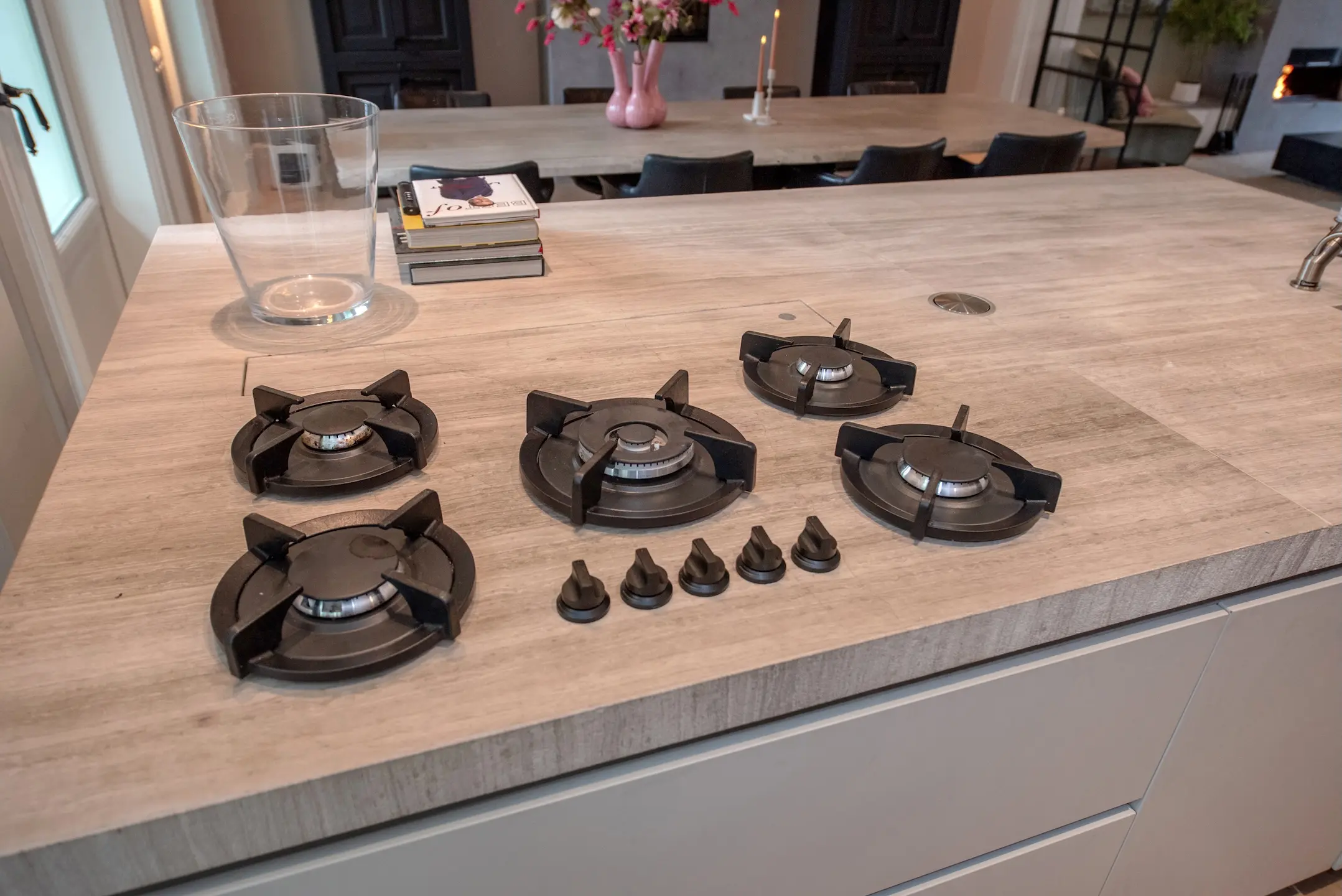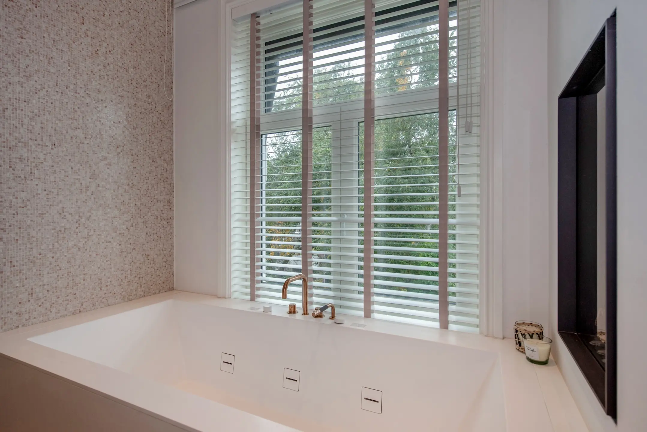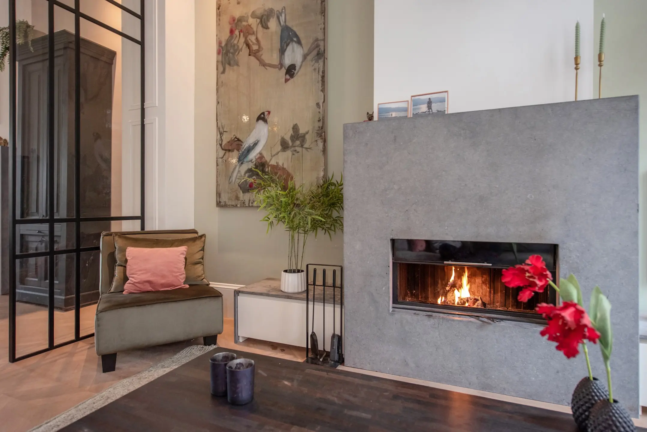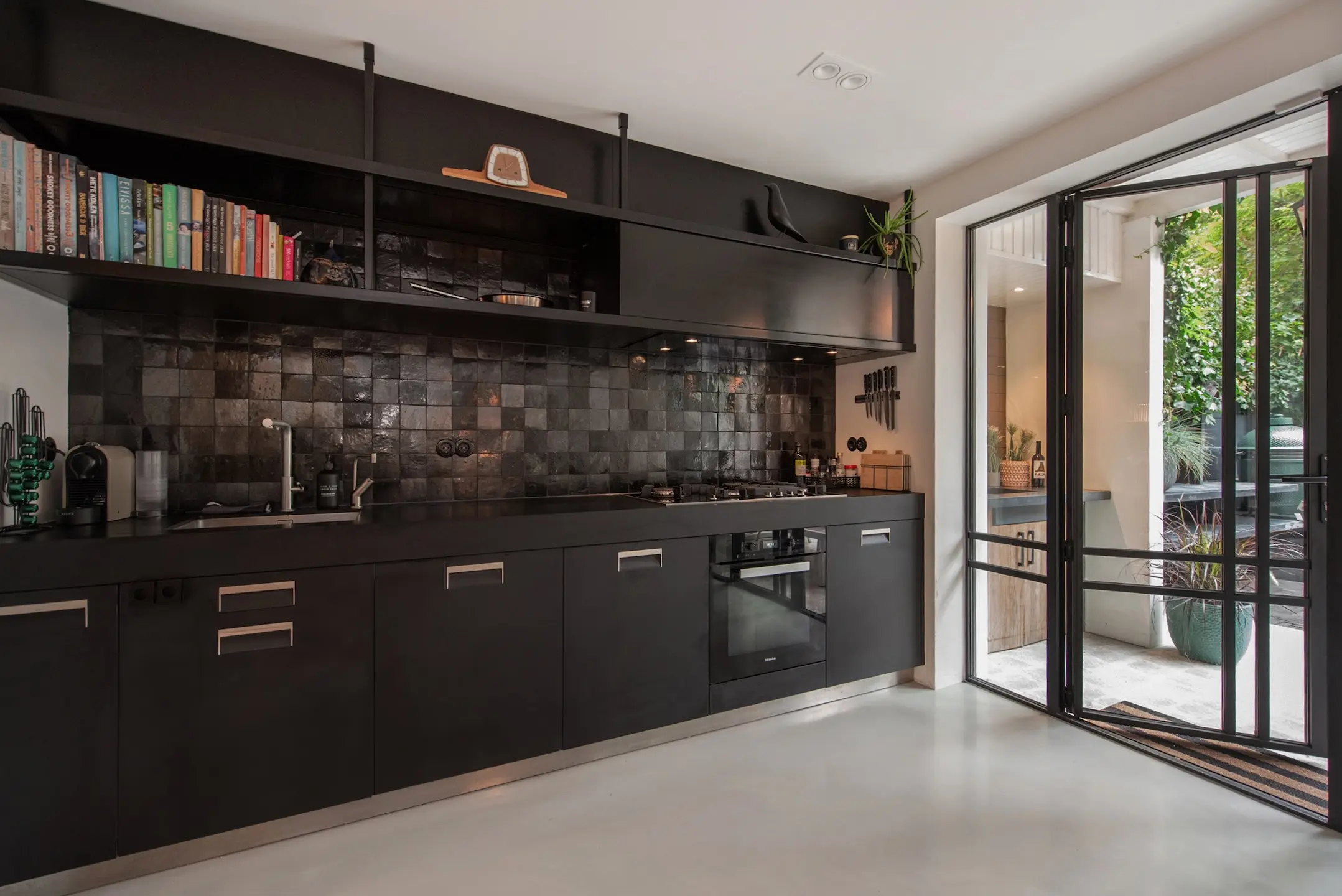 The kitchen is custom-made by Arilnea and fully equipped with Miele built-in appliances and a Quooker. The floor throughout the ground floor has underfloor heating with an epoxy cast floor. The space has a luxurious look and feel, yet is cozy thanks to the Bullerjan multi-fuel stove. The entire garden room has Tudor steel window frames with floor-to-ceiling glass, making you feel like you are outside. The doors can be opened completely to incorporate the garden terrace into the garden room in the summer.