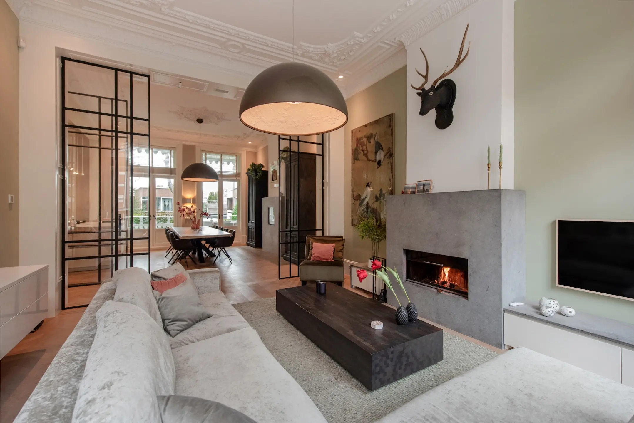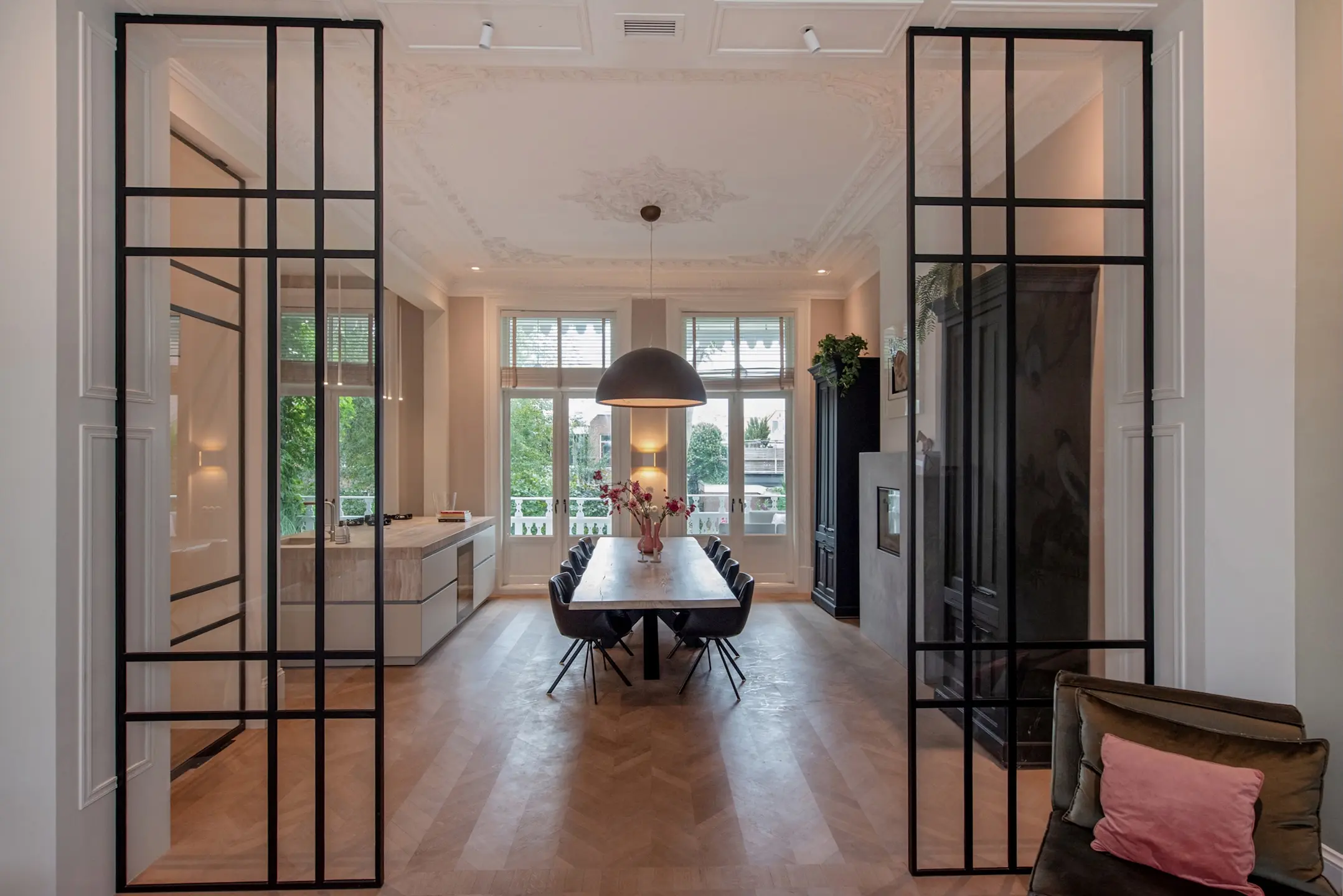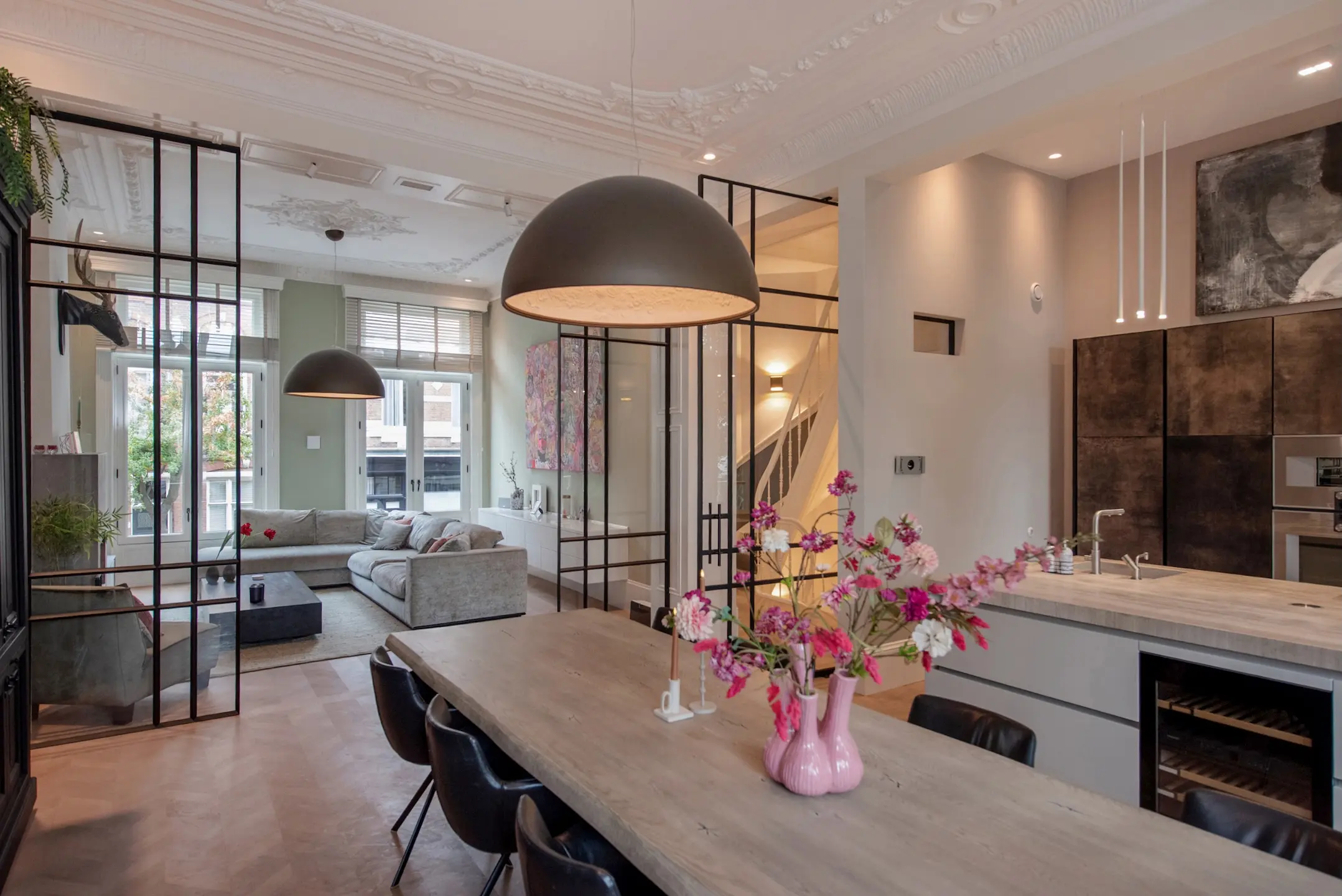 The beautiful original staircase leads you to the first floor, where tranquility and elegance come together. The ceilings with beautiful ornaments are impressively high at over 4 meters, and the rooms flow seamlessly into each other. The entrance to the living room is formed by an impressive 4-meter-high steel pivot door. The atmosphere is warm, inviting, and chic. The dining room is the heart of the house, perfect for long dinners and cozy evenings. The large kitchen tha