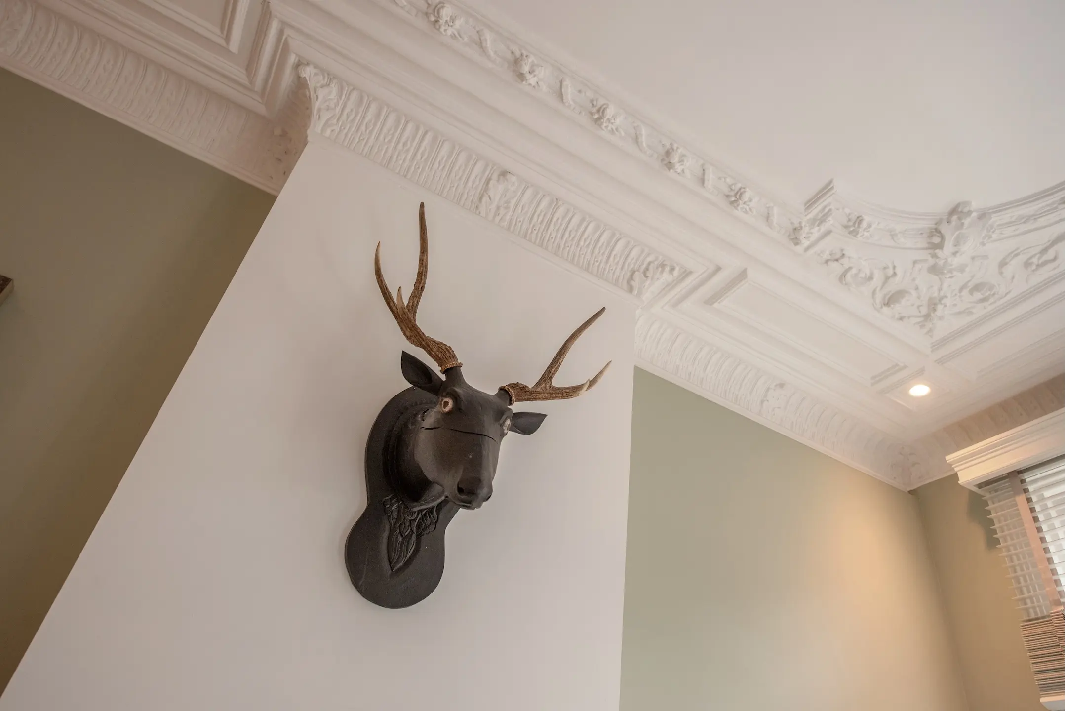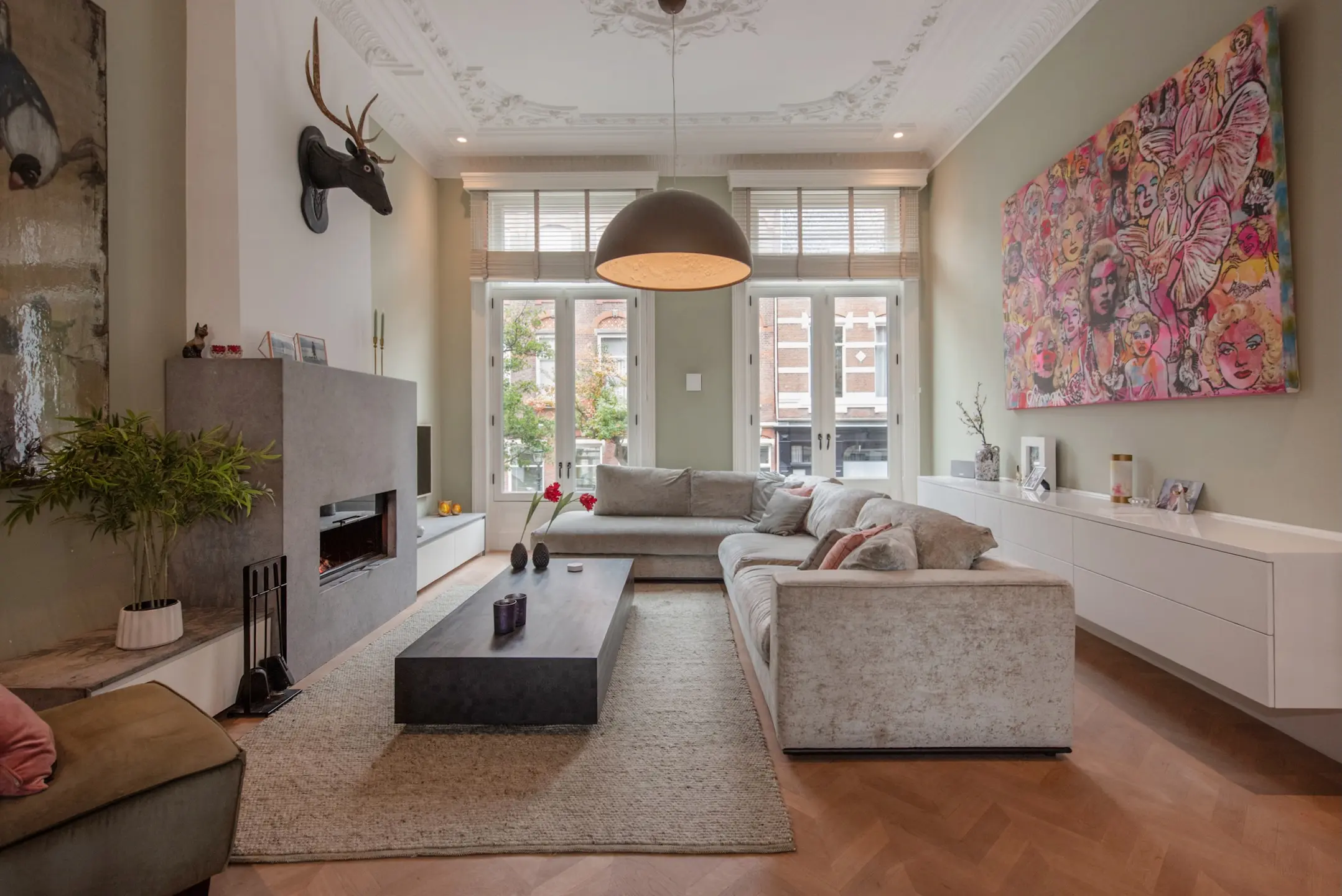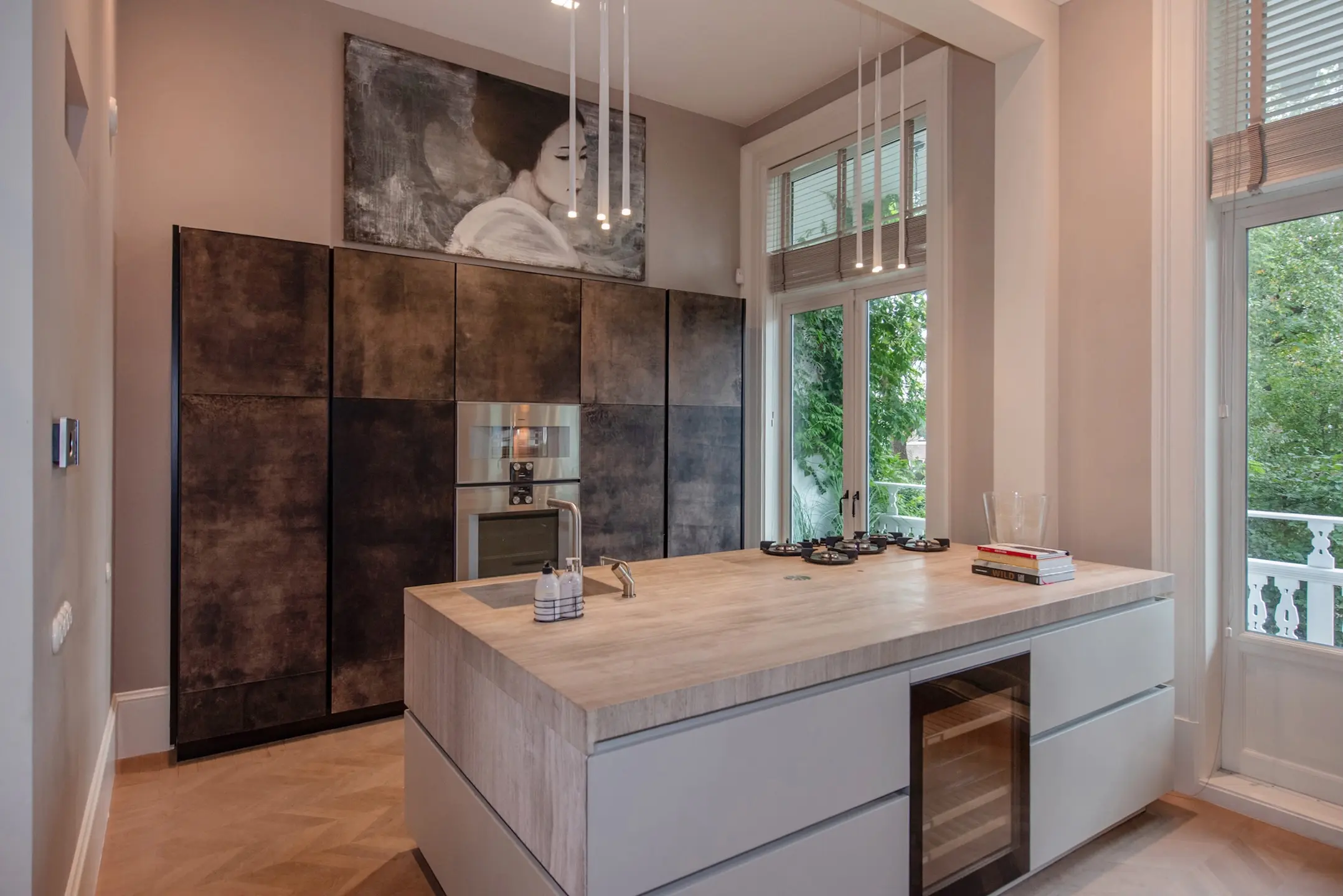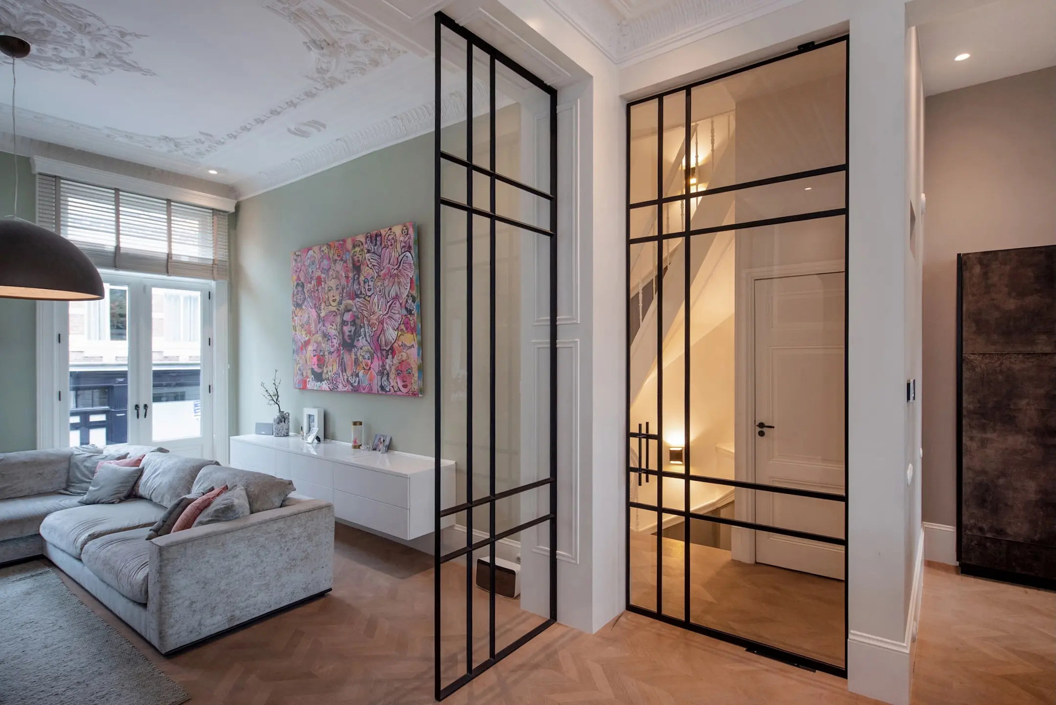 The beautiful original staircase leads you to the first floor, where tranquility and elegance come together. The ceilings with beautiful ornaments are impressively high at over 4 meters, and the rooms flow seamlessly into each other. The entrance to the living room is formed by an impressive 4-meter-high steel pivot door. The atmosphere is warm, inviting, and chic. The dining room is the heart of the house, perfect for long dinners and cozy evenings. The large kitchen tha