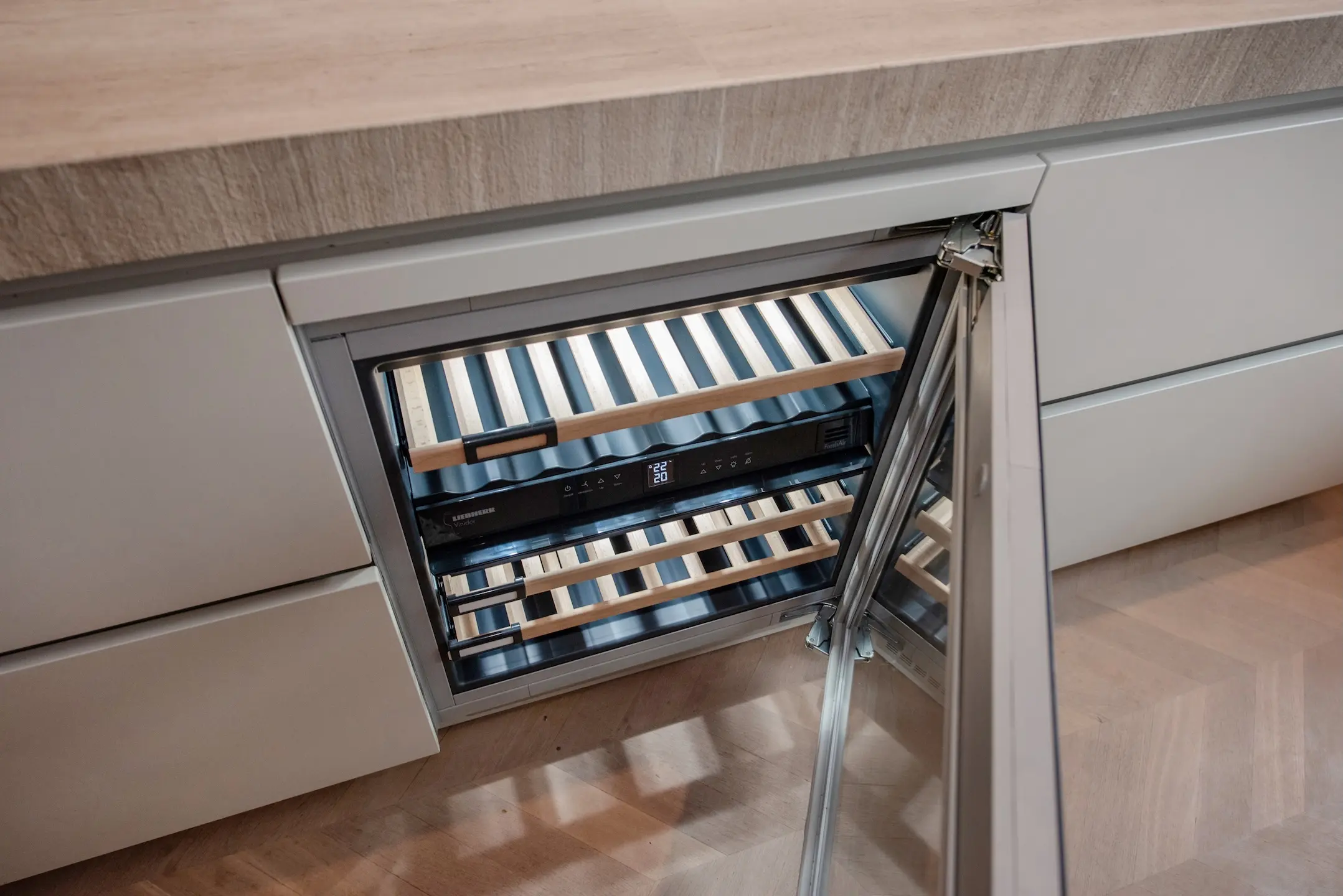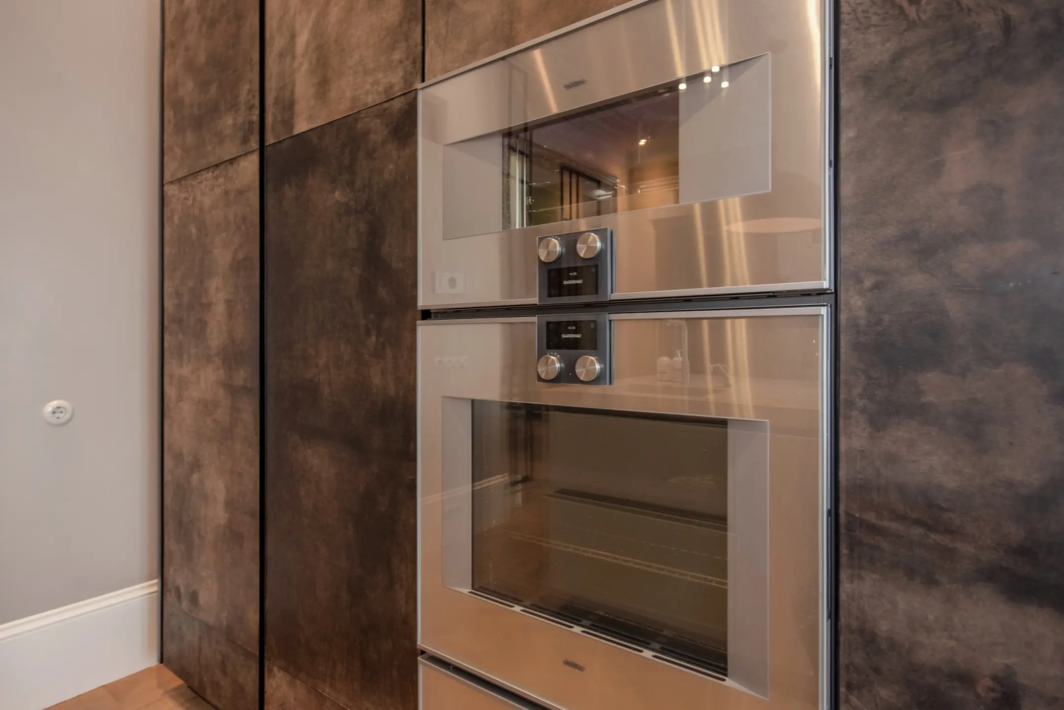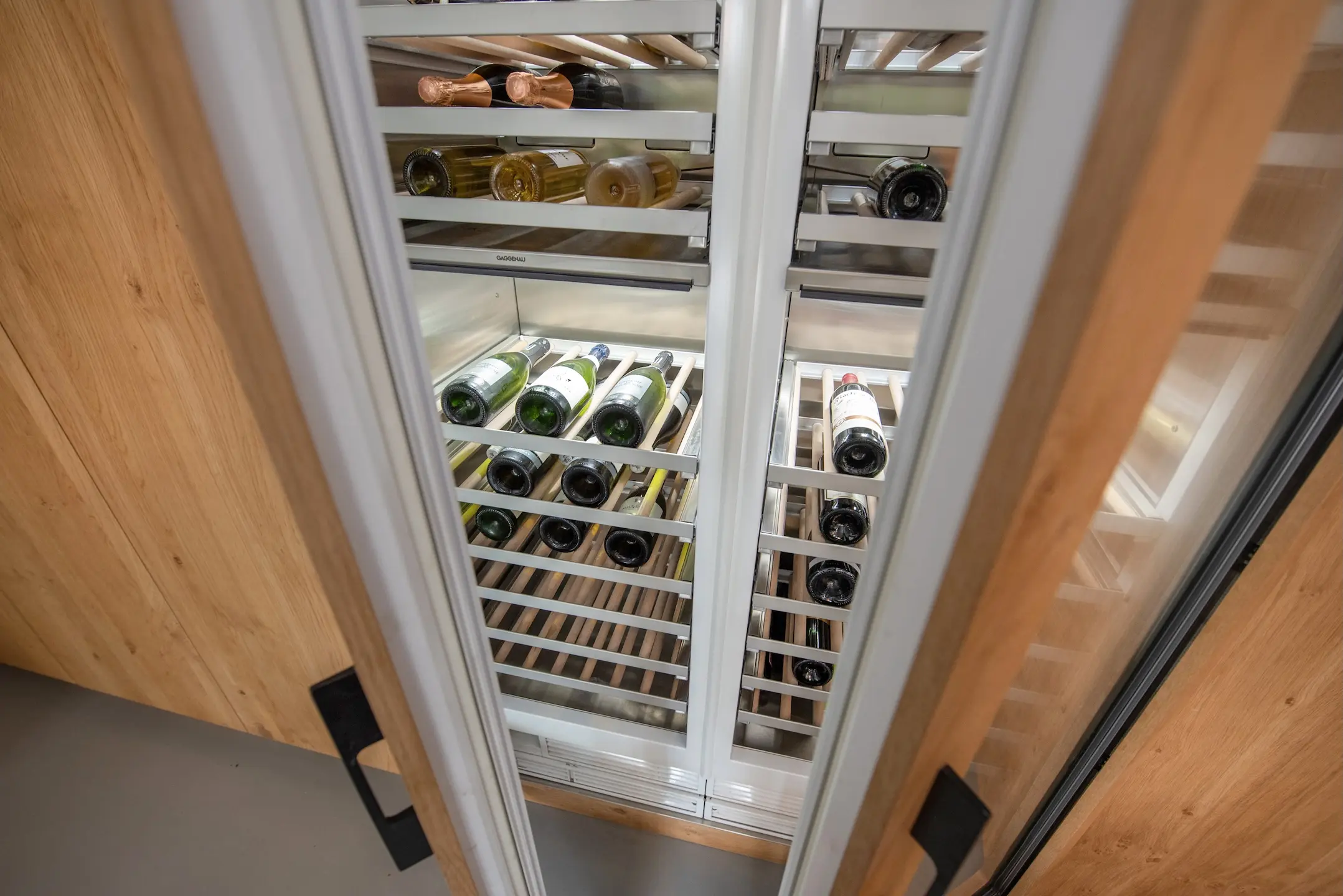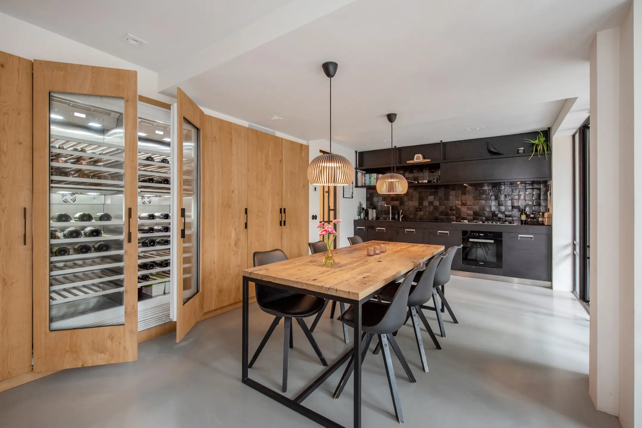From the hall, you enter the spacious hallway with access to an attractive garden room with a luxurious kitchen and dining room. The walls of the garden room are fitted with custom wooden cabinets containing two Gaggenau wine climate cabinets, a refrigerator, and a separate freezer with an ice cube machine.