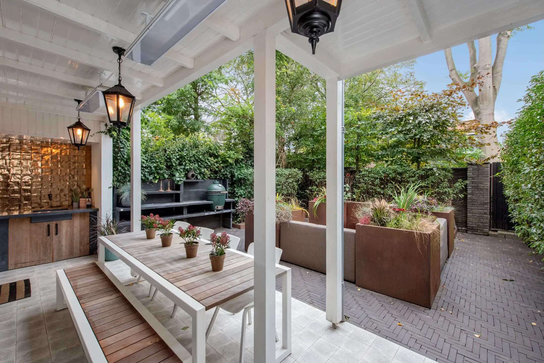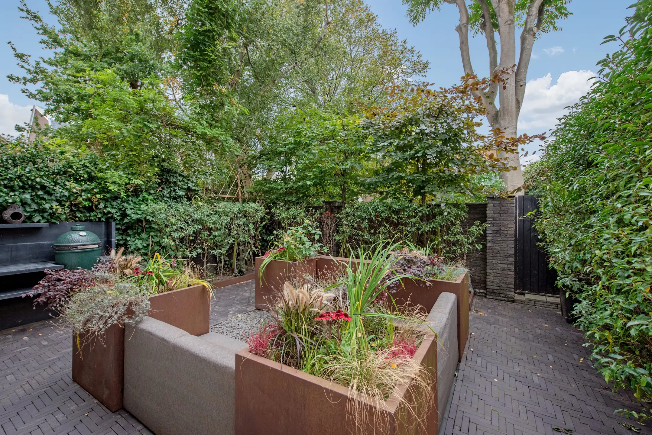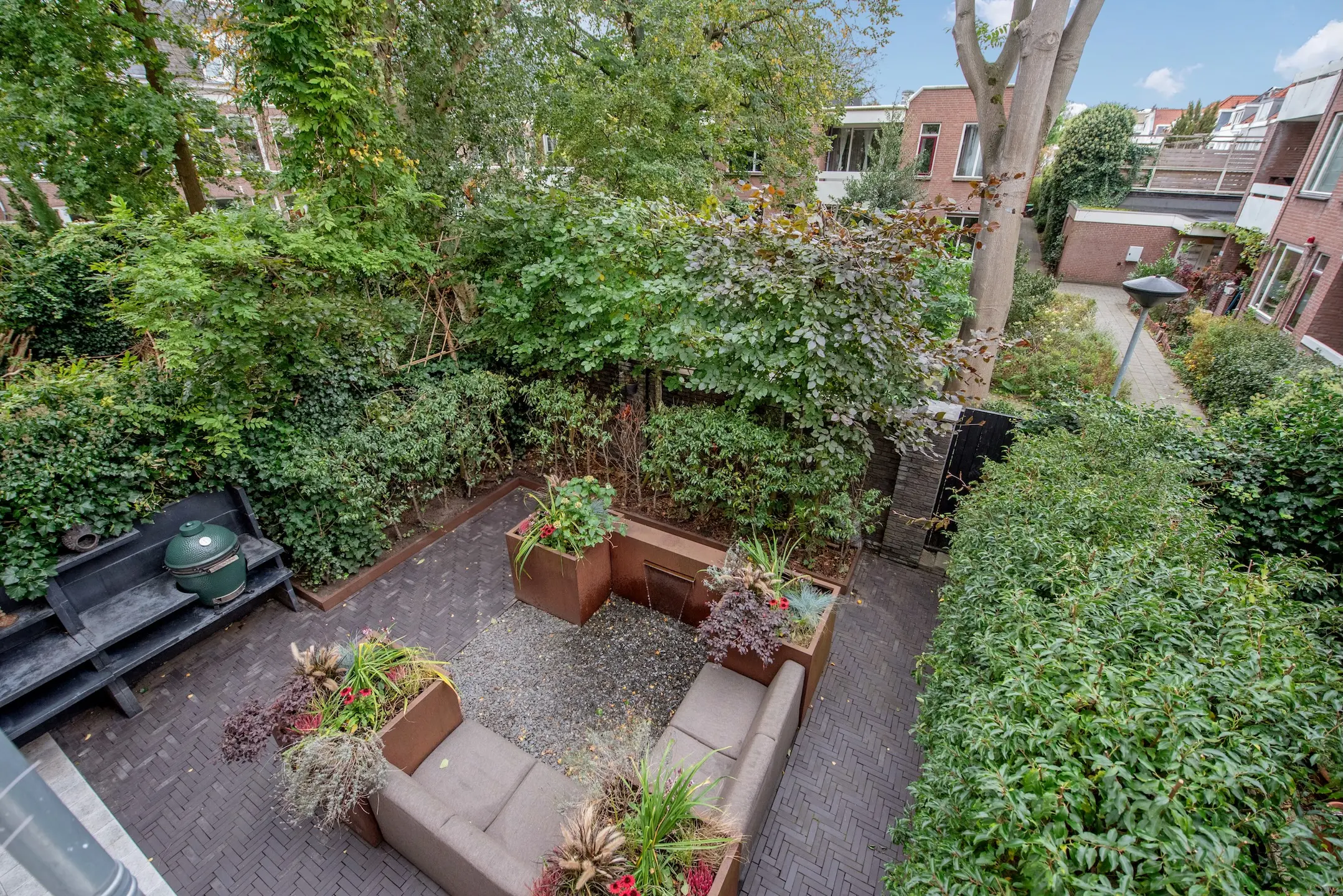 The southwest-facing backyard was designed by renowned landscape architect Ron den Dikken. This outdoor space is an extension of the living space: green, peaceful, and sunny. The fact that this garden has a back entrance completes it. Perfect for breakfast, afternoon drinks, or a barbecue. The outdoor kitchen with GreenEgg BBQ and sink ensures that you will enjoy wonderful evenings with friends. In the garden, there is also a storage room of approx. 3 m² for garden equipment or seasonal storage.