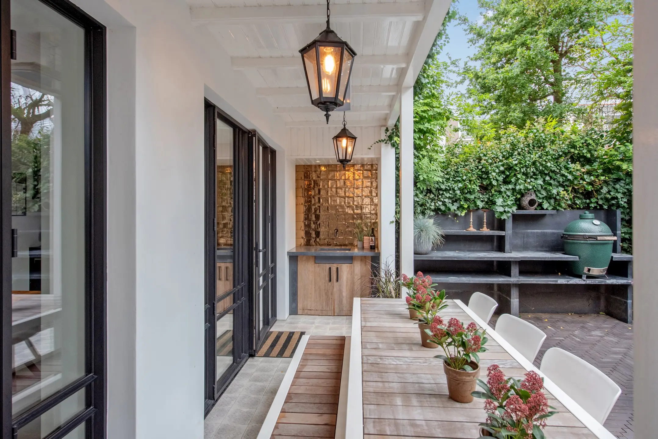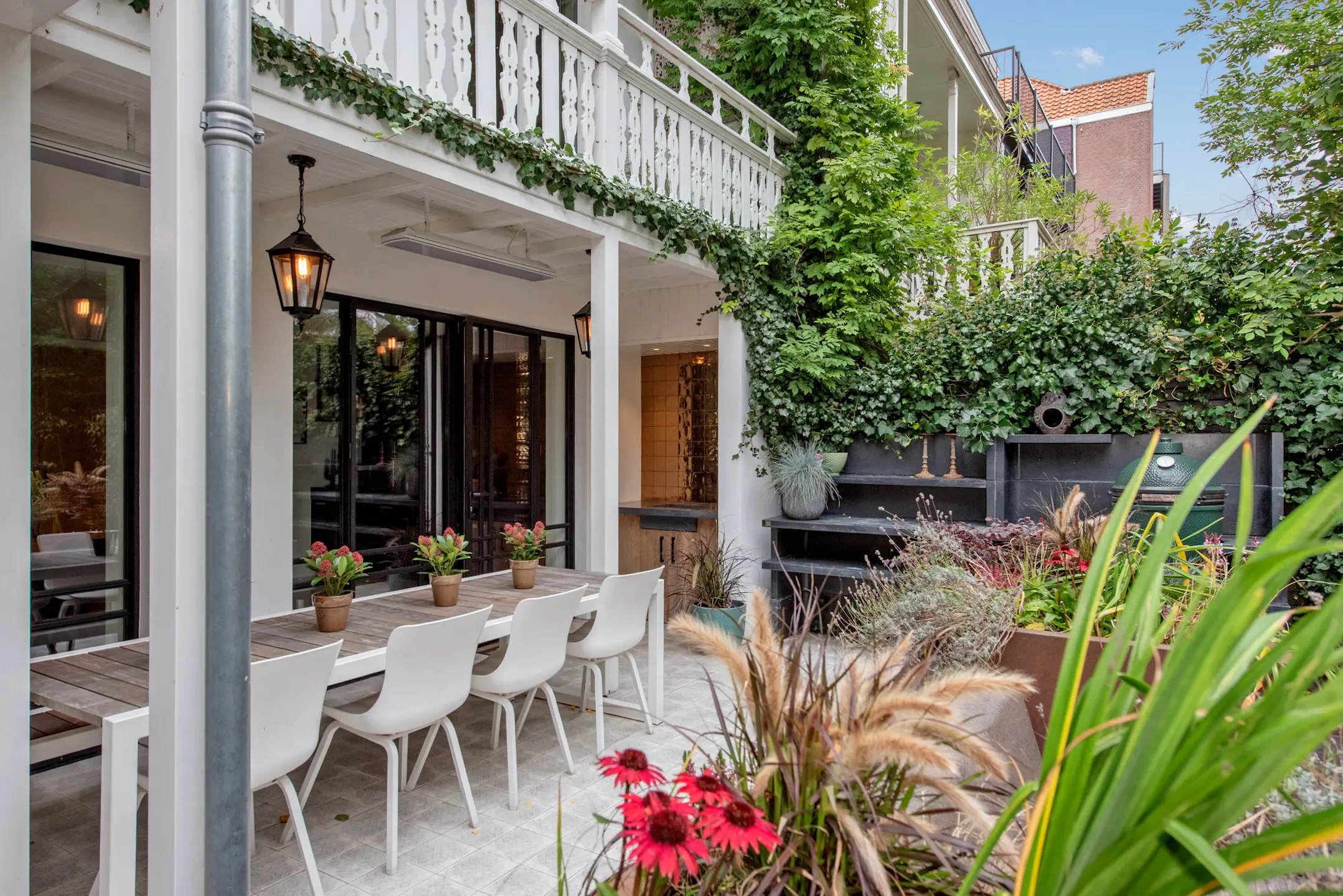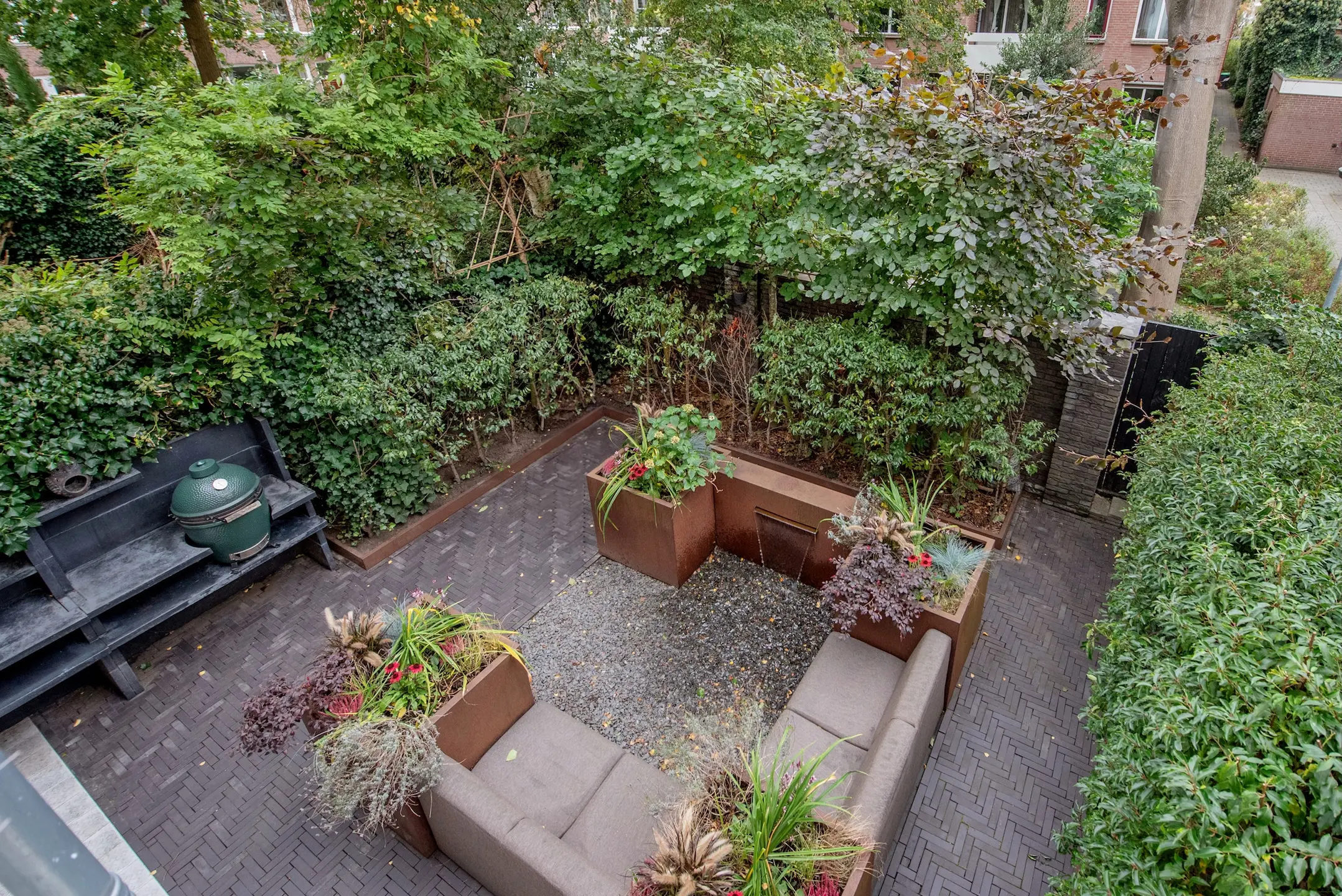 The southwest-facing backyard was designed by renowned landscape architect Ron den Dikken. This outdoor space is an extension of the living space: green, peaceful, and sunny. The fact that this garden has a back entrance completes it. Perfect for breakfast, afternoon drinks, or a barbecue. The outdoor kitchen with GreenEgg BBQ and sink ensures that you will enjoy wonderful evenings with friends. In the garden, there is also a storage room of approx. 3 m² for garden equipment or seasonal storage.