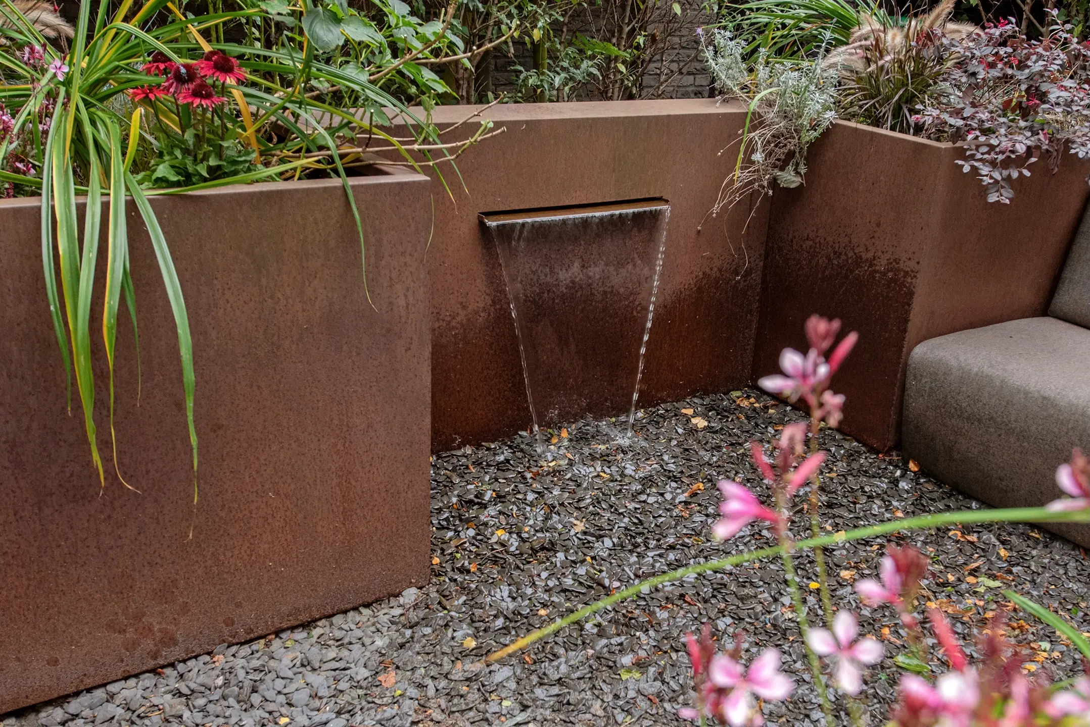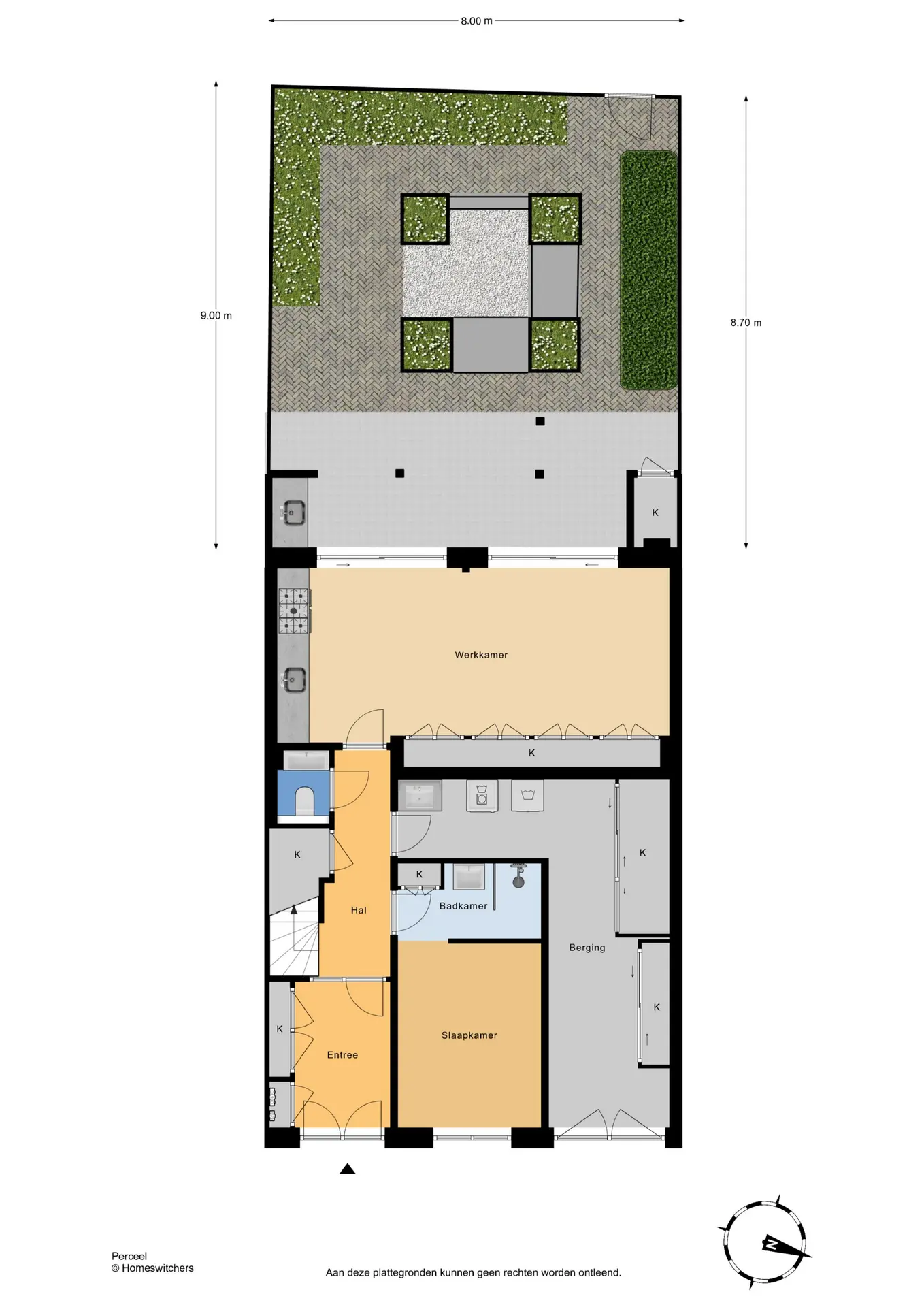 De achtertuin gelegen op het zuidwesten is ontworpen door de beroemde tuinarchitect Ron den Dikken. Deze buitenruimte is een verlengstuk van de leefruimte; groen, rustig en zonnig. Dat deze tuin een achterom heeft maakt het helemaal af. Perfect voor een ontbijt, een borrel in de namiddag of een barbecue. De buitenkeuken met GreenEgg BBQ en wastafel zorgen dat u mooie avonden met vrienden gaat beleven. Onder de overkapping is het heerlijk zitten, zelfs op de koudere avonden, want de Heatscope Heaters verwarmen u. In de tuin bevindt zich nog een berging van ca. 3 m² voor tuinspullen of seizoenopslag.