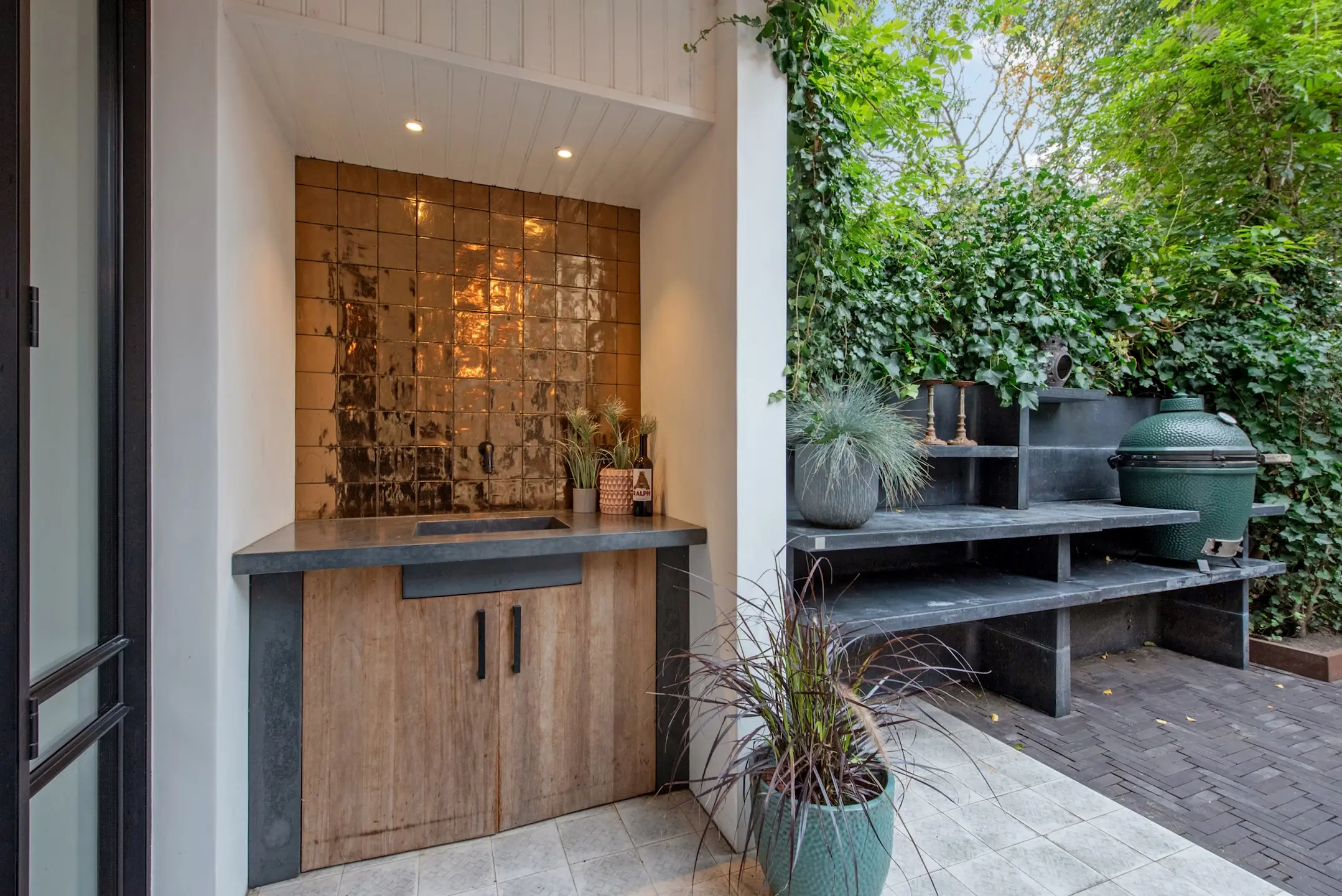 o Tuin met buitenkeuken incl. Green Egg gelegen op het zuidwesten en achterom