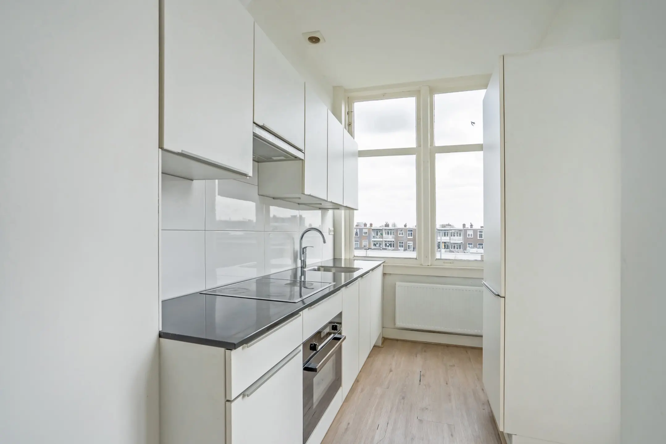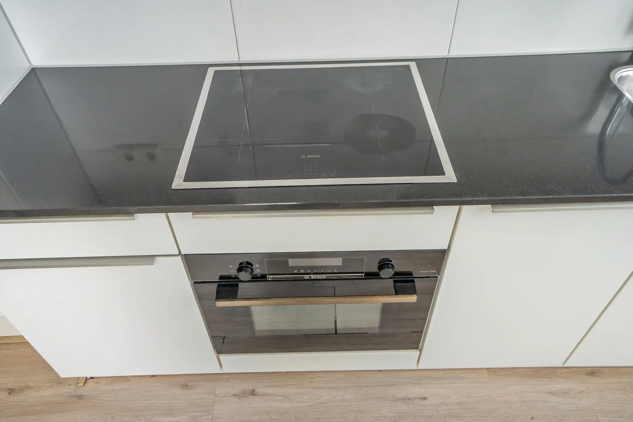 De moderne keuken is aan de achterzijde gesitueerd en uitgevoerd met een zwart composiet aanrechtblad en witte kasten en laden. De keuken is compleet uitgerust met een vier-pits inductiekookplaat met afzuigkap, combimagnetron, vaatwasser en een koel-vriescombinatie. Ook vanuit de keuken is er toegang tot het balkon.