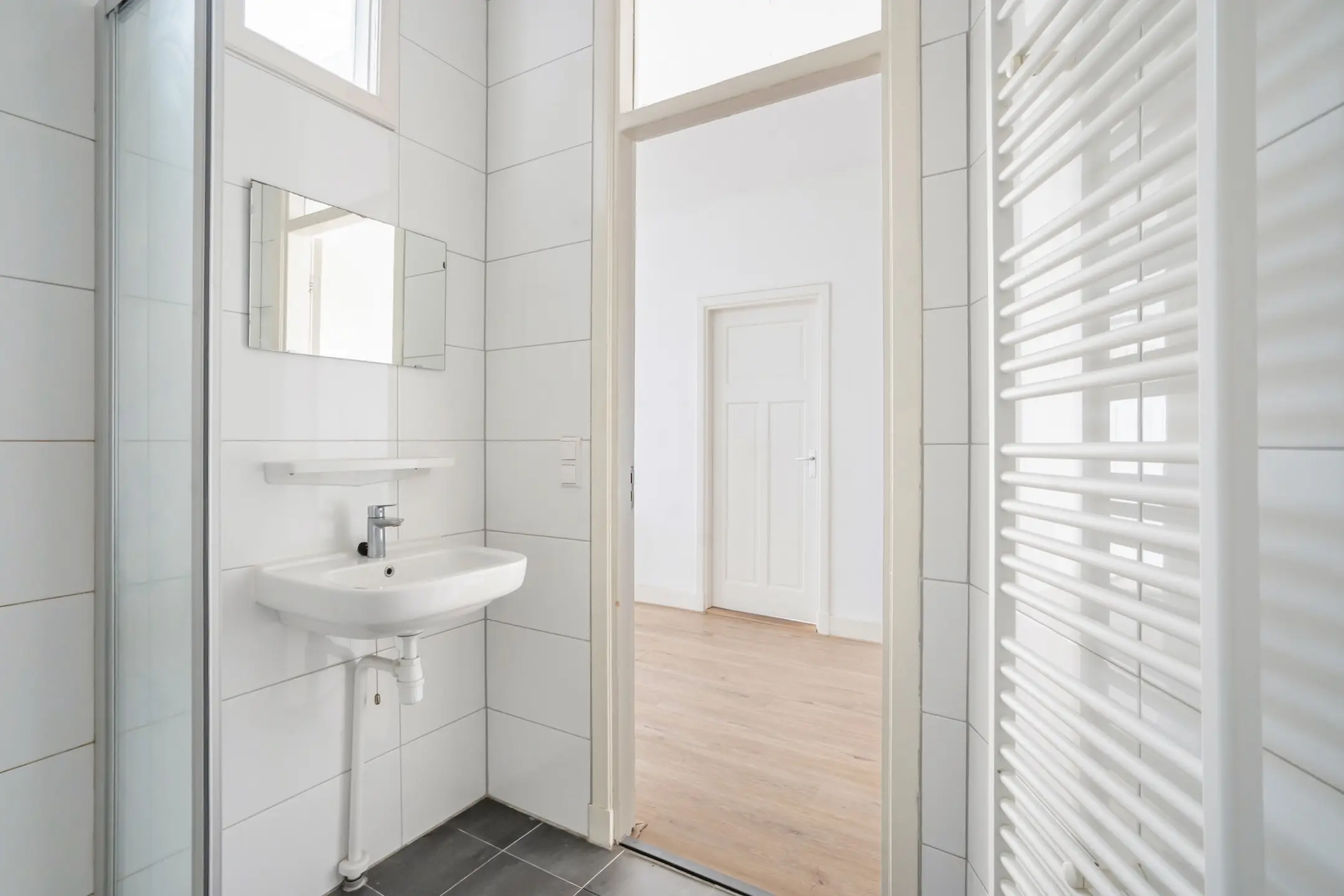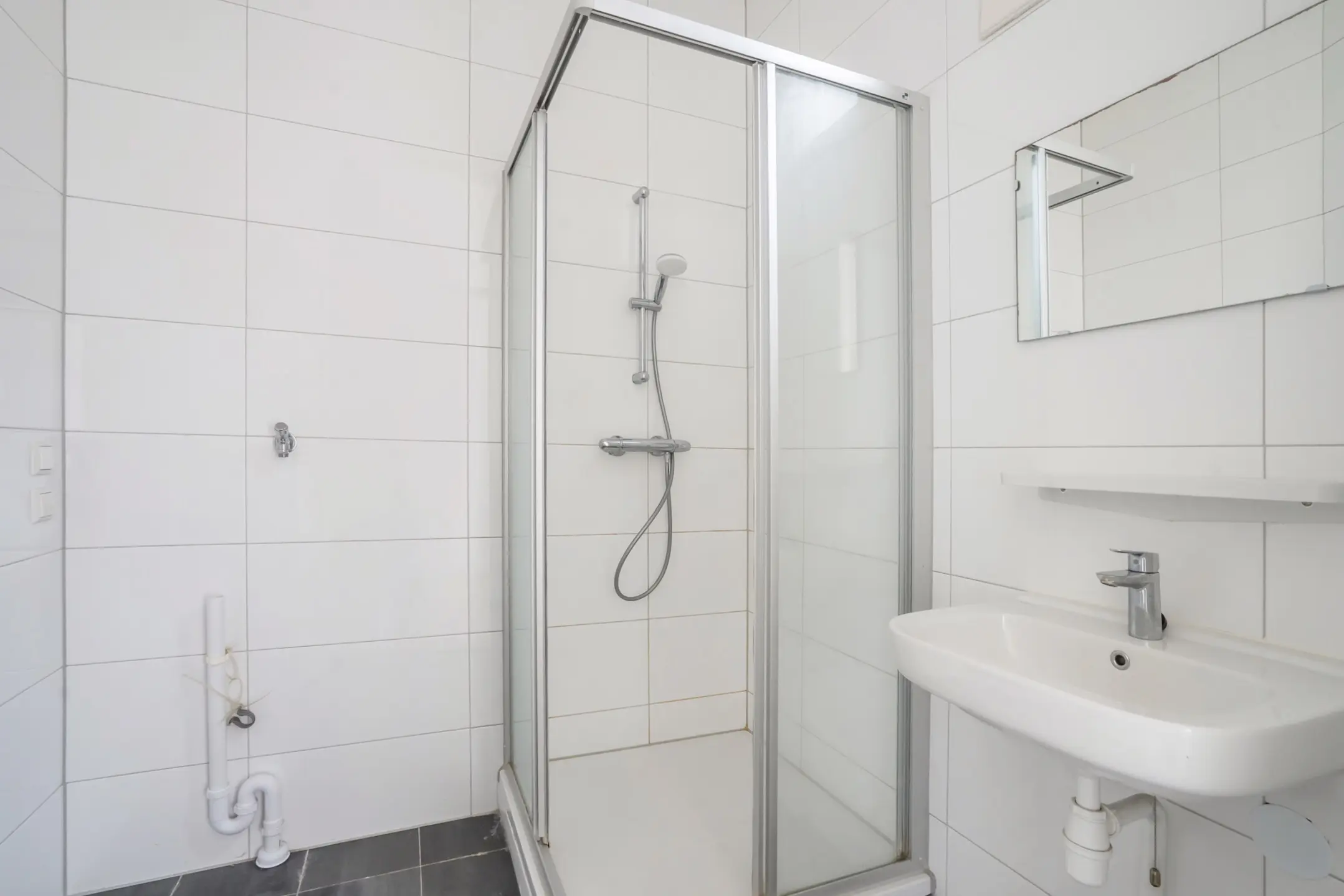 Nette badkamer, voorzien van een douchehoek, wastafelmeubel, designradiator en aansluitingen voor zowel wasmachine als droger.