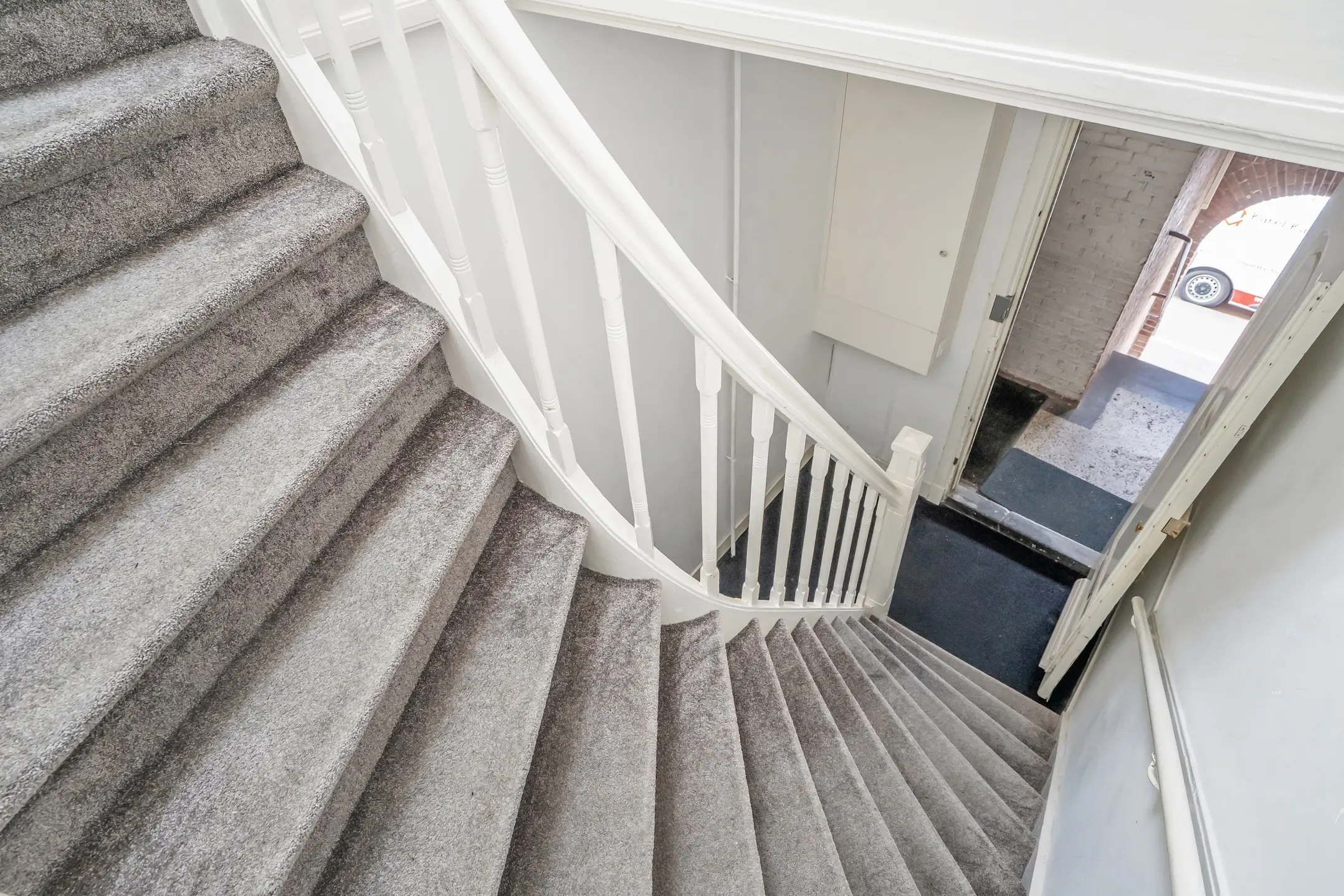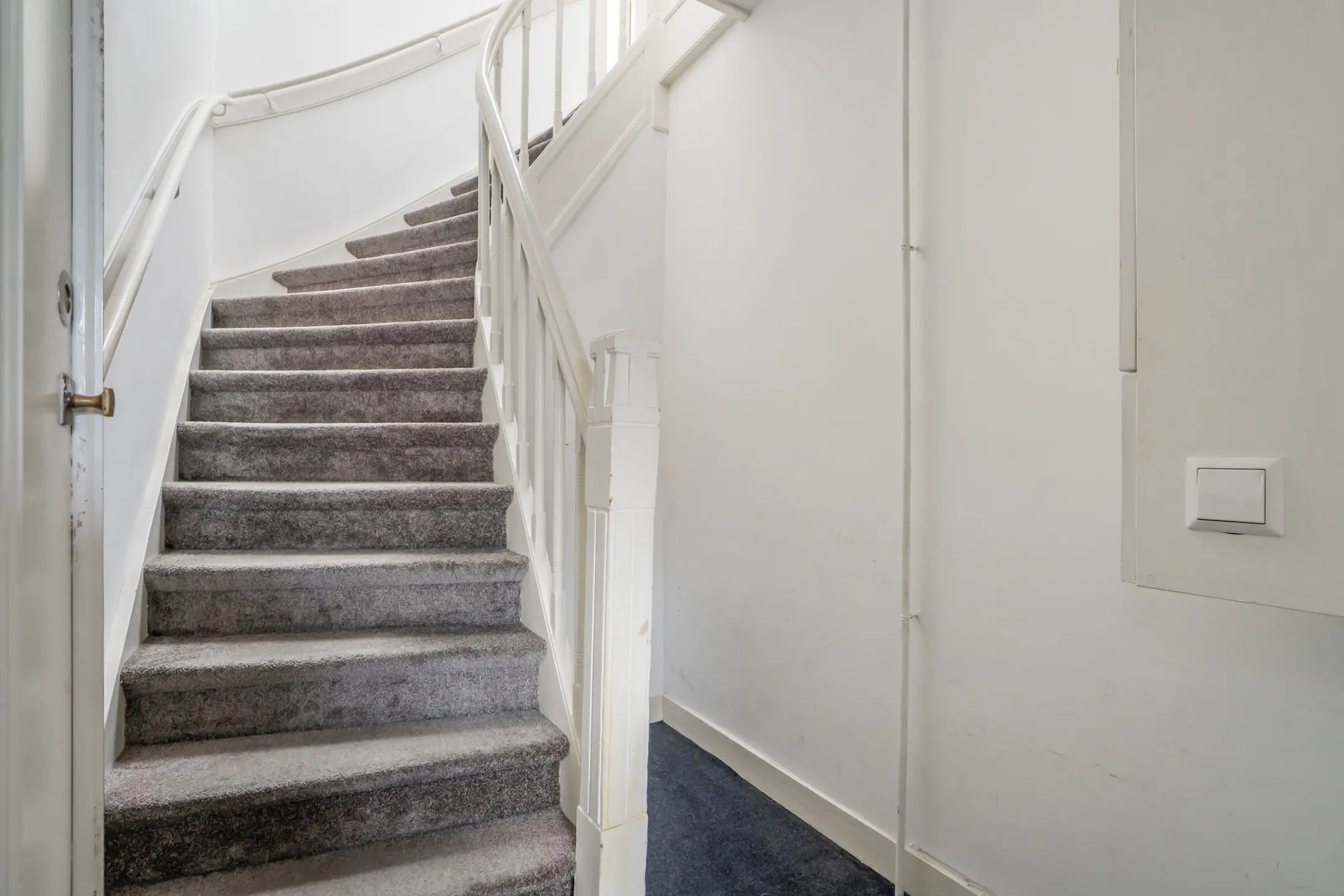 Via het open portiek met trap bereikt u de entree van het appartement op de eerste etage. Bij binnenkomst treft u een ruime hal met een uitgebreide meterkast. Vanuit hier een trap naar de tweede verdieping.